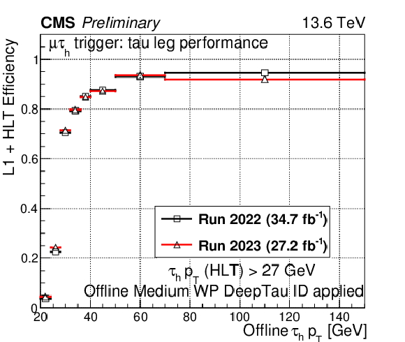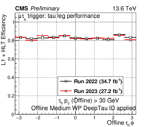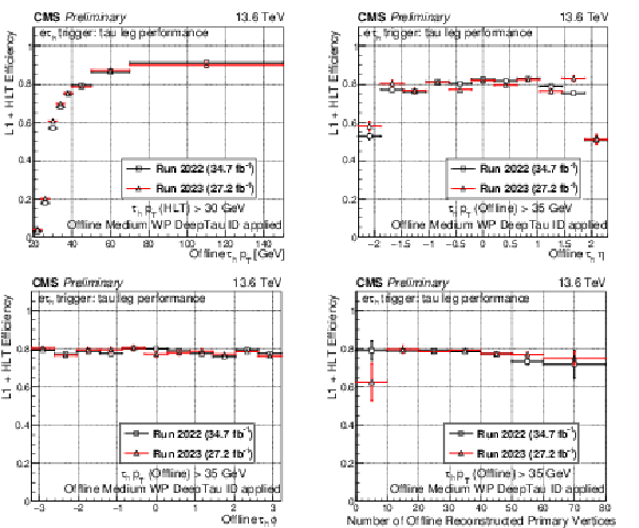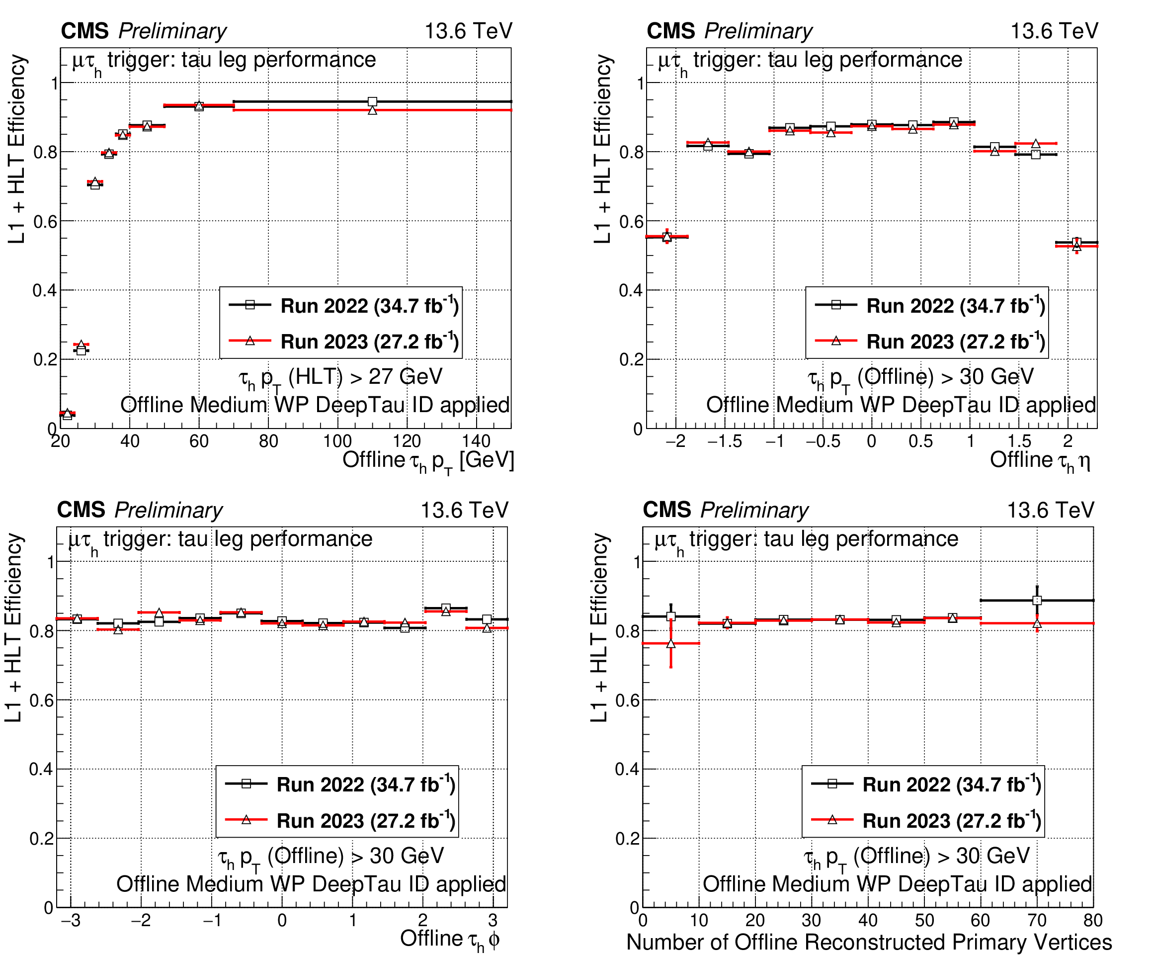 A comparison of the L1+HLT efficiency of the $ \mu\tau_\mathrm{h} $ HLT path in 2022 and 2023 as a function of offline $ \tau_\mathrm{h} $ candidate $ p_{\mathrm{T}} $ (upper left), $ \eta $ (upper right), and $ \phi $ (lower left). The dependence on the number of primary vertices is also shown (lower right). The uncertainties shown by the error bars are from the number of events available in the sample. Some of the error bars are smaller than the markers and are not shown. |