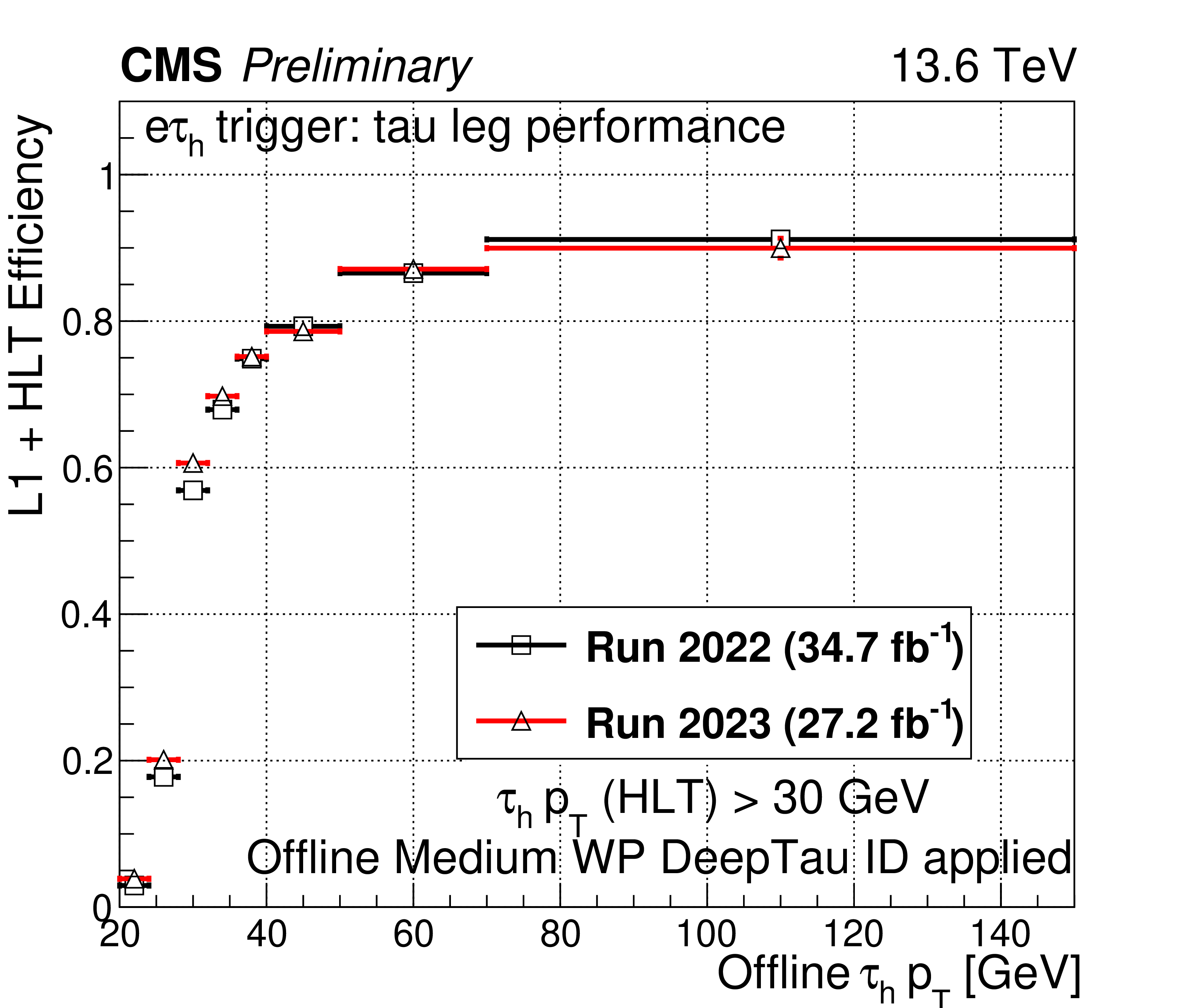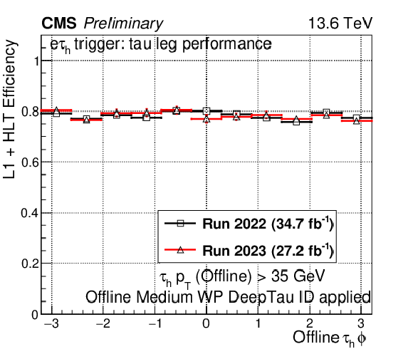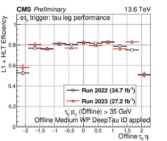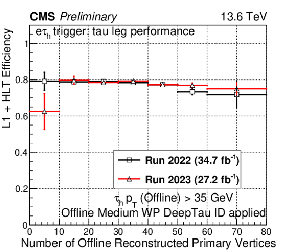 A comparison of the L1+HLT efficiency of the $ \mathrm{e}\tau_\mathrm{h} $ monitoring HLT path in 2022 and 2023 as a function of offline $ \tau_\mathrm{h} $ candidate $ p_{\mathrm{T}} $ (upper left), $ \eta $ (upper right), and $ \phi $ (lower left). The dependence on the number of primary vertices is also shown (lower right). The uncertainties shown by the error bars are from the number of events available in the sample. Some of the error bars are smaller than the markers and are not shown. |