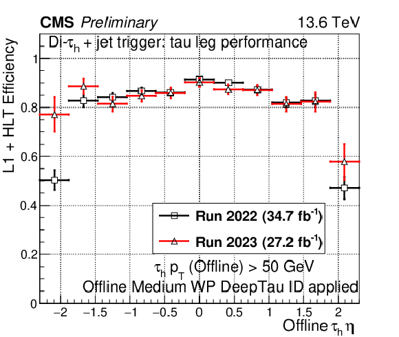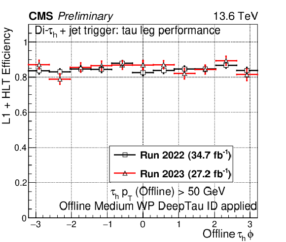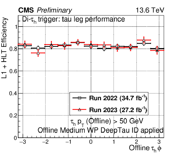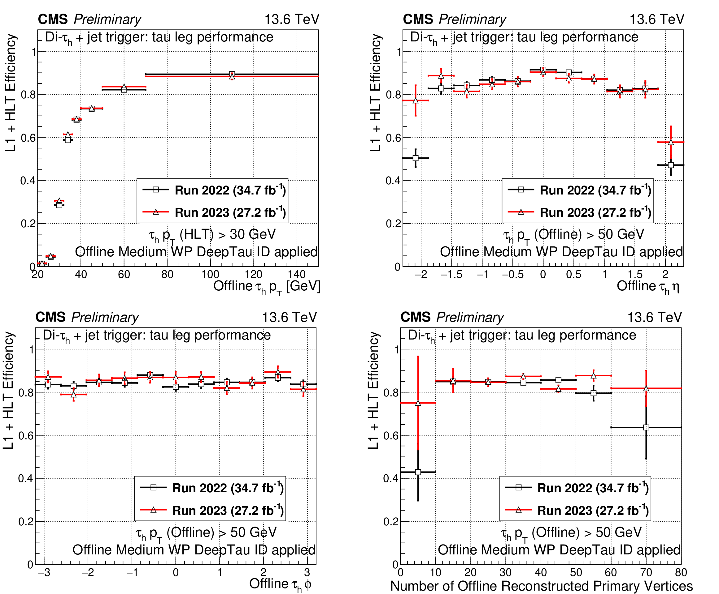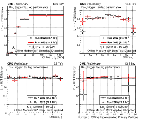 A comparison of the L1+HLT efficiency of the di-$ \tau_\mathrm{h} $ monitoring HLT path in 2022 and 2023 as a function of offline $ \tau_\mathrm{h} $ candidate $ p_{\mathrm{T}} $ (upper left), $ \eta $ (upper right), and $ \phi $ (lower left). The dependence on the number of primary vertices is also shown (lower right). The uncertainties shown by the error bars are from the number of events available in the sample. Some of the error bars are smaller than the markers and are not shown. |
