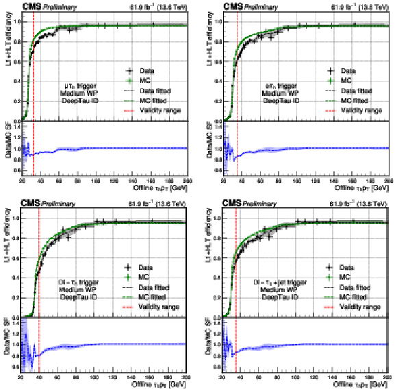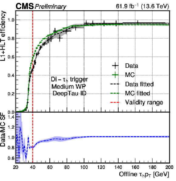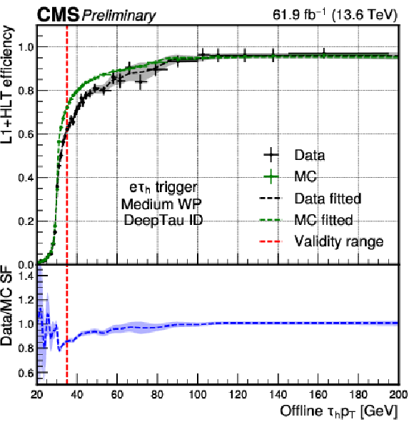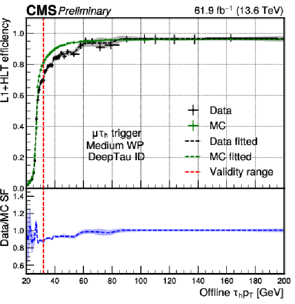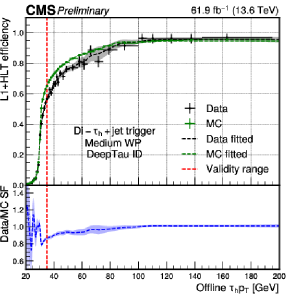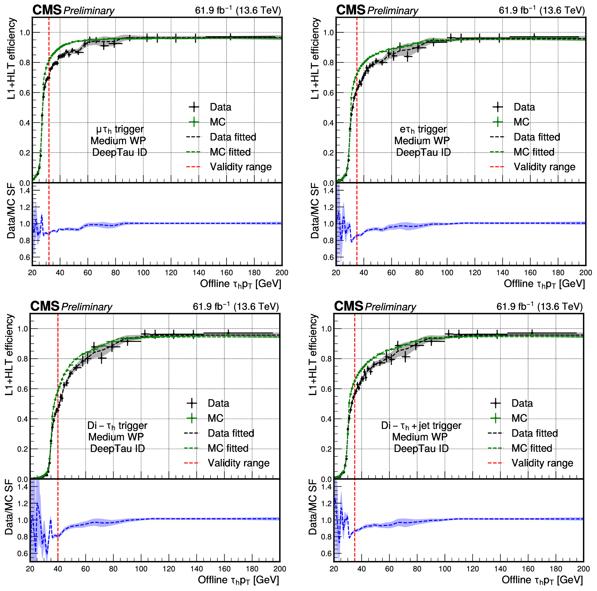 Efficiencies and scale factors of the HLT monitoring paths using 2022 and 2023 data as a function of the offline $ \tau_\mathrm{h} $ candidate $ p_{\mathrm{T}} $ for the $ \mu\tau_\mathrm{h} $ (upper left), $ \mathrm{e}\tau_\mathrm{h} $ (upper right), di-$ \tau_\mathrm{h} $ (lower left), and di-$ \tau_\mathrm{h} $ + jet (lower right) HLT paths. The measured efficiencies for data are shown with black markers, and for simulation with green markers. The uncertainties shown by the error bars are from the number of events available in the sample. Some of the error bars are smaller than the markers and are not shown. The corresponding dotted lines of the same color display the best fit results together with the statistical error bands. The scale factors, defined as ratios of efficiencies between data and simulation, are displayed in the bottom panel with an associated purple error band. Only values to the right of the red dotted line are used, to avoid large statistical fluctuations, as they are sufficiently above the turn-on threshold of the trigger. |