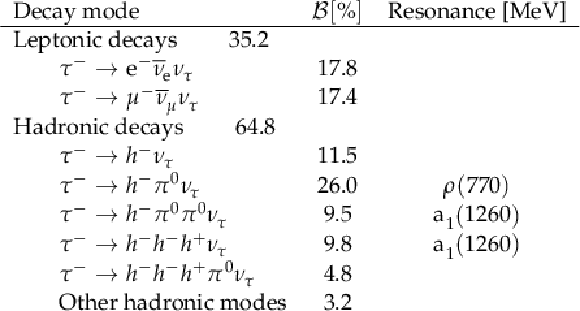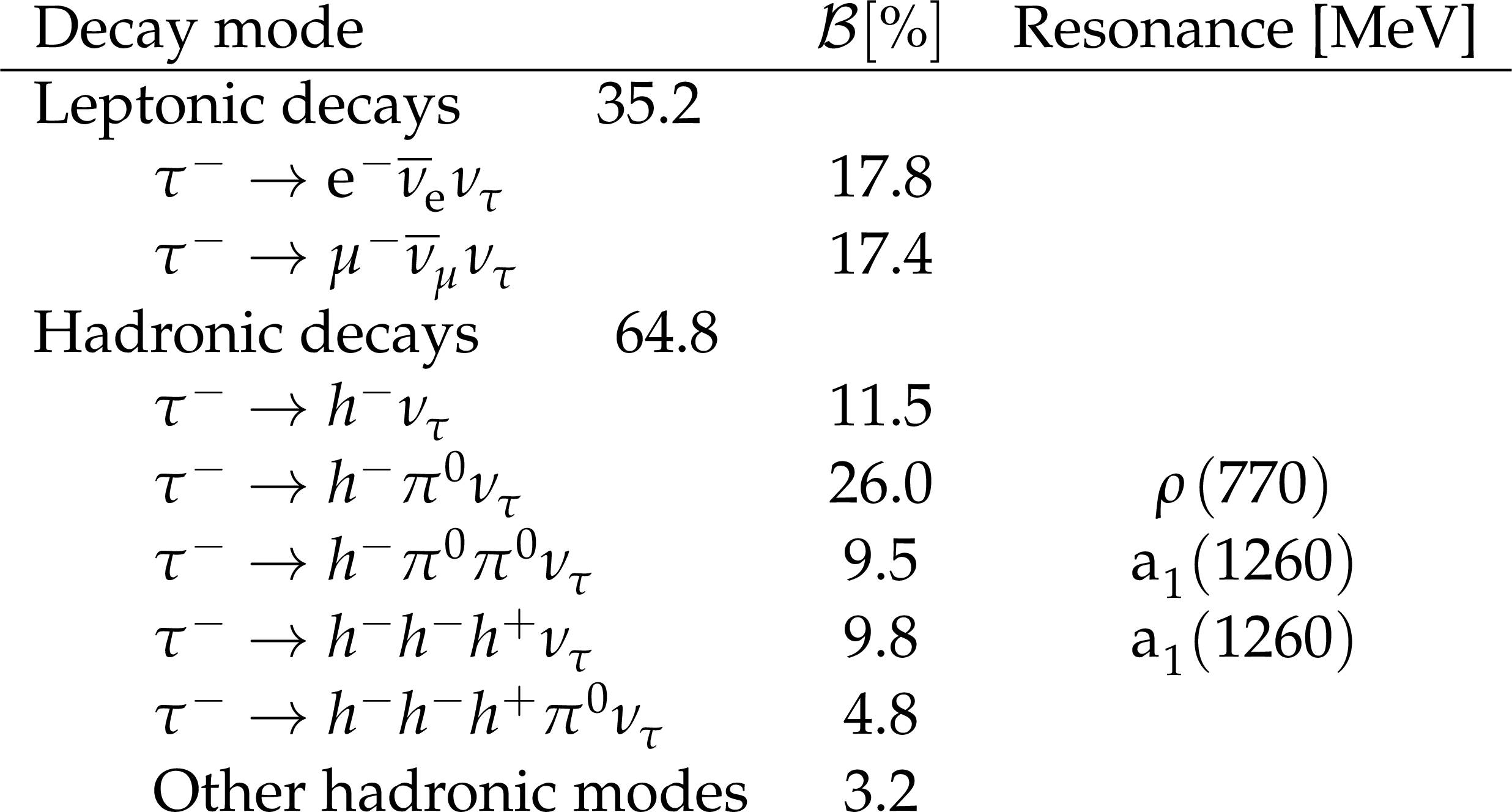 Decay modes and branching fractions ($ \mathcal{B} $) of the tau lepton alongside the mesonic resonances primarily involved in hadronic tau lepton decays [36]. |