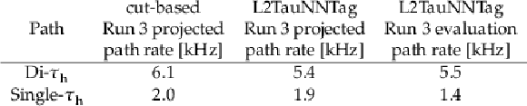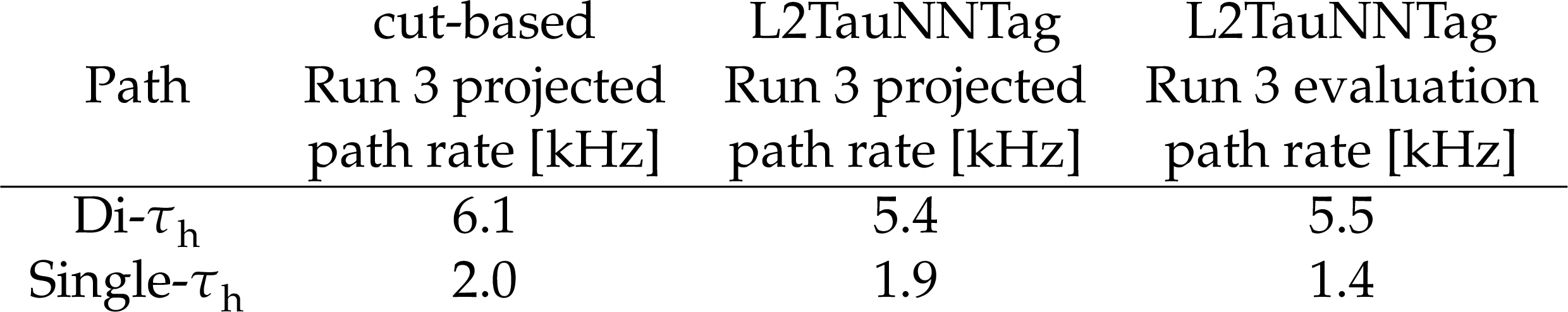 The performance between cut based and L2TAUNNTAG. The first column is the expected rate of the Run 2 cut-based paths linearly scaled to Run 3 conditions. The second column is the rate of L2TAUNNTAG paths estimated with Run 2 data and scaled to Run 3 conditions. The third column is the rate of L2TAUNNTAG paths evaluated in real Run 3 condition. The Run 2 estimation is based on an instantaneous luminosity of 1.68 $ \times $ 10$^{34}$ cm$^{-2}$s$^{-1} $. The Run 3 projection is evaluated with 2.0 $ \times $ 10$^{34}$ cm$^{-2}$s$^{-1} $. The Run 3 evaluation is performed with 2.2 $ \times $ 10$^{34}$ cm$^{-2}$s$^{-1} $. The rates are inclusive calculations not excluding shared contributions from other algorithms or paths. |