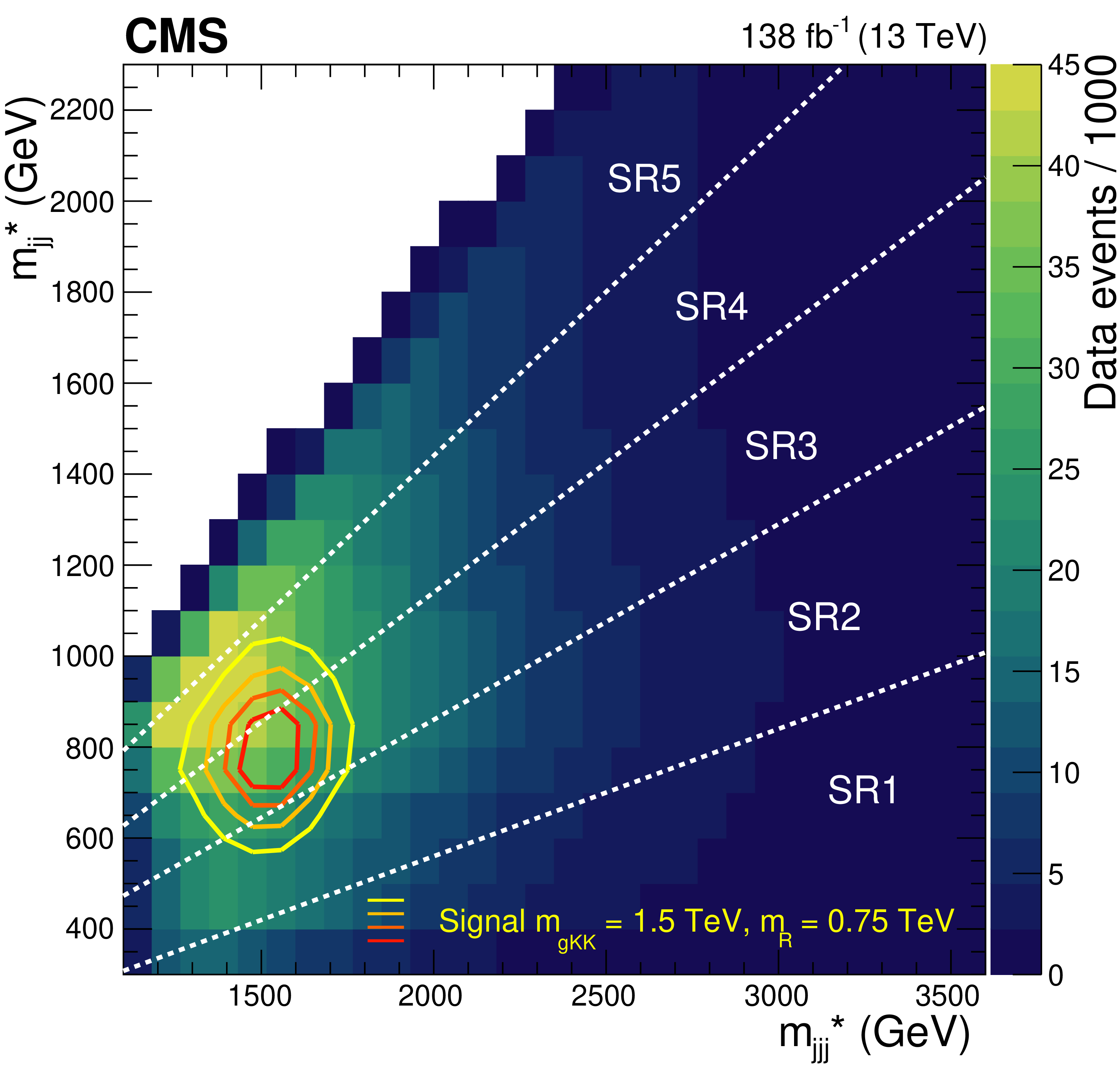 Distributions after event preselection. Upper left: the two-dimensional ($ m_{\text{ja}} $, $ m_{\text{jb}} $) distribution for a posited signal ($ {m}_{\mathrm{R}}= $ 0.75 TeV, $ {m}_{\mathrm{g}_{\text{KK}}}= $ 1.5 TeV) compared to the background-dominated data. For signal, contours corresponding to 80, 60, 40, and 20% of the maximum signal event yield are shown for shape visualization. White dashed curves indicate boundaries between SR, VR (defined in Section 6.1), and CR areas. The one-dimensional histograms show the $ m_{\text{85}} $ (upper right), $ m^*_{\mathrm{jj}} $ (middle left), $ m^*_{\mathrm{jjj}} $ (middle right), and $ m^*_{\mathrm{jj}} $/$ m^*_{\mathrm{jjj}} $ (lower left) distributions using simulated signal and background events, as indicated in the legends. The signal events are scaled by the labeled factors times the theoretical cross sections for visibility. Lower right: the two-dimensional ($ m^*_{\mathrm{jj}} $, $ m^*_{\mathrm{jjj}} $) distribution in data. White dashed lines indicate the SR splitting. |