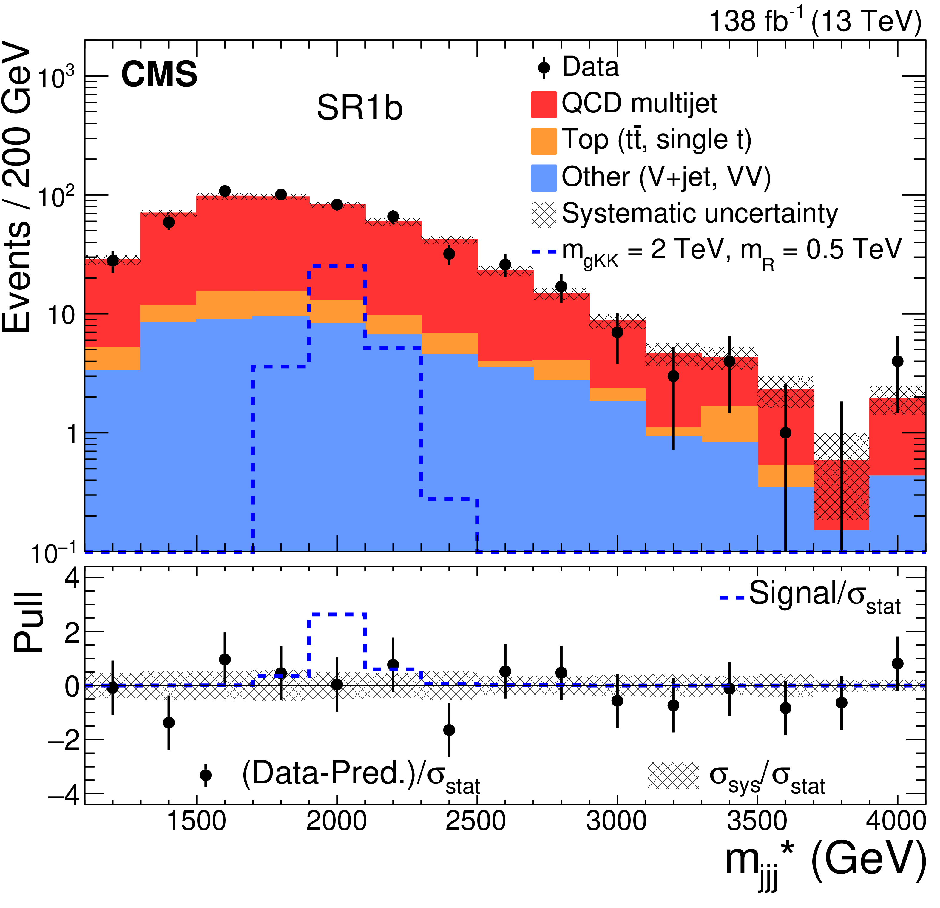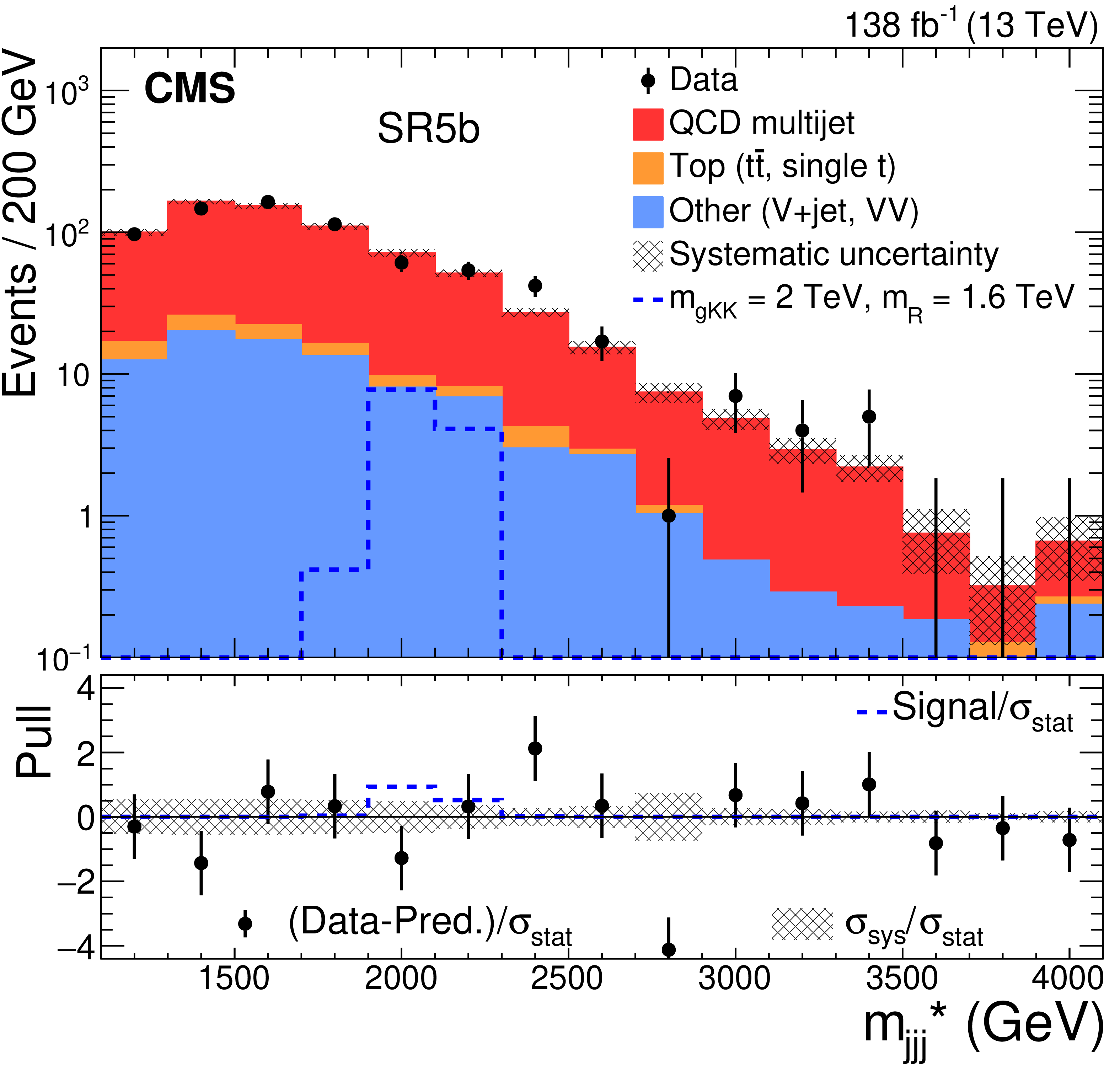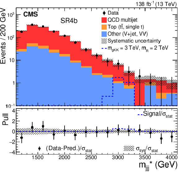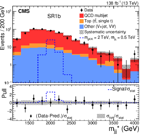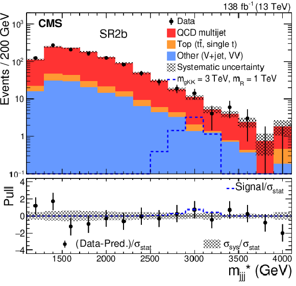 The $ m^*_{\mathrm{jjj}} $ postfit spectra in the five SRxb. Upper to lower, and left to right: SR1b, SR2b, SR3b, SR4b, and SR5b. The lower panels show the pull distributions, as defined in the text, together with expected signal event yields and the systematic uncertainty normalized to $ \sigma_{\text{stat}} $. |