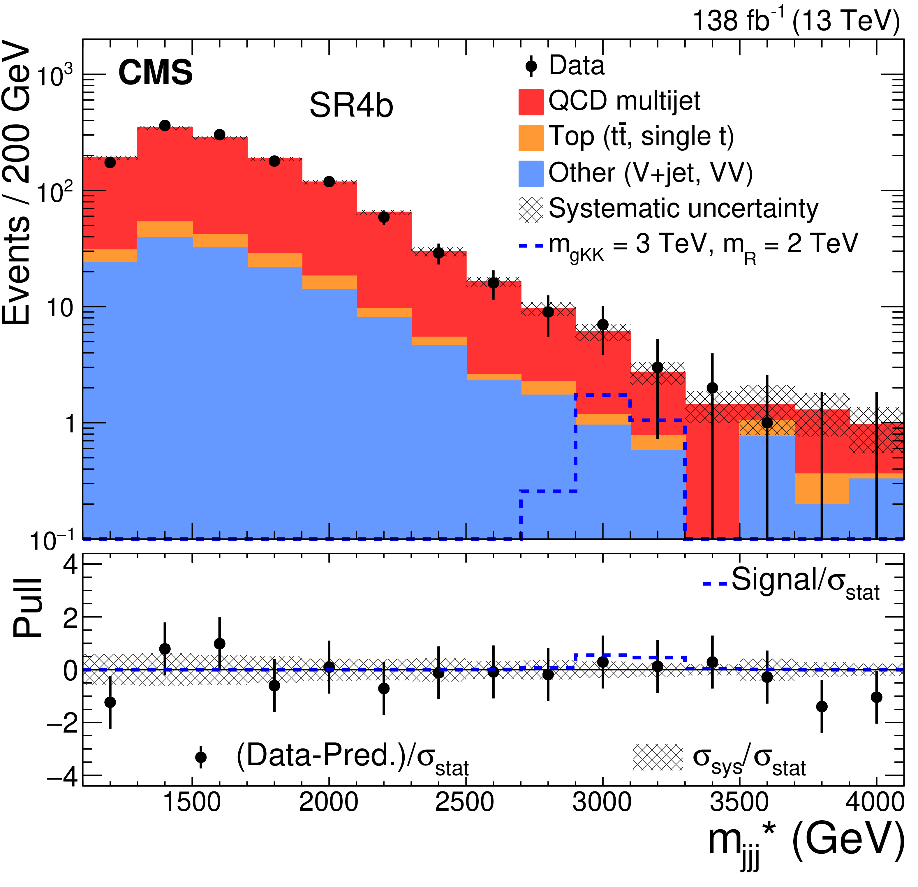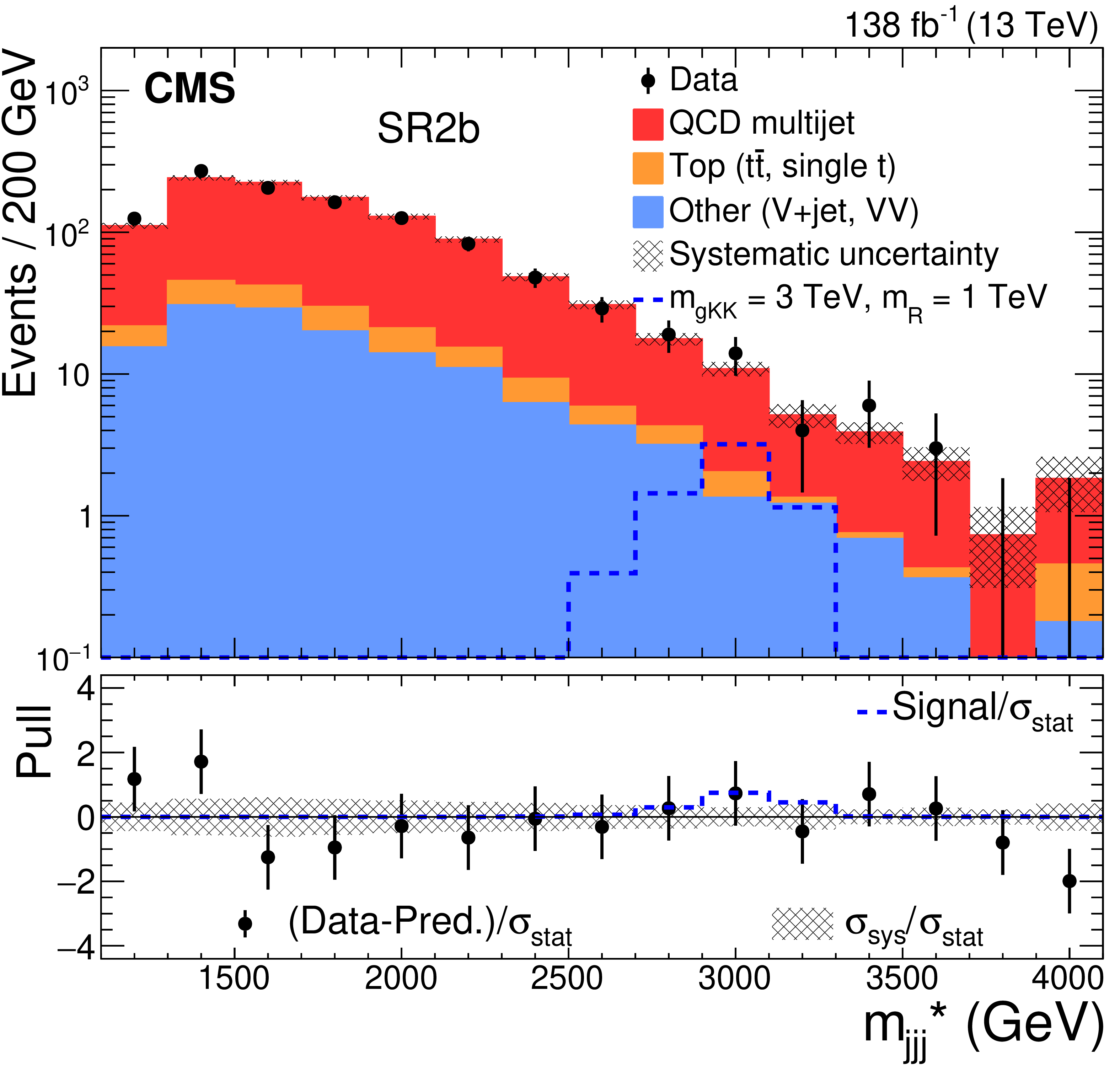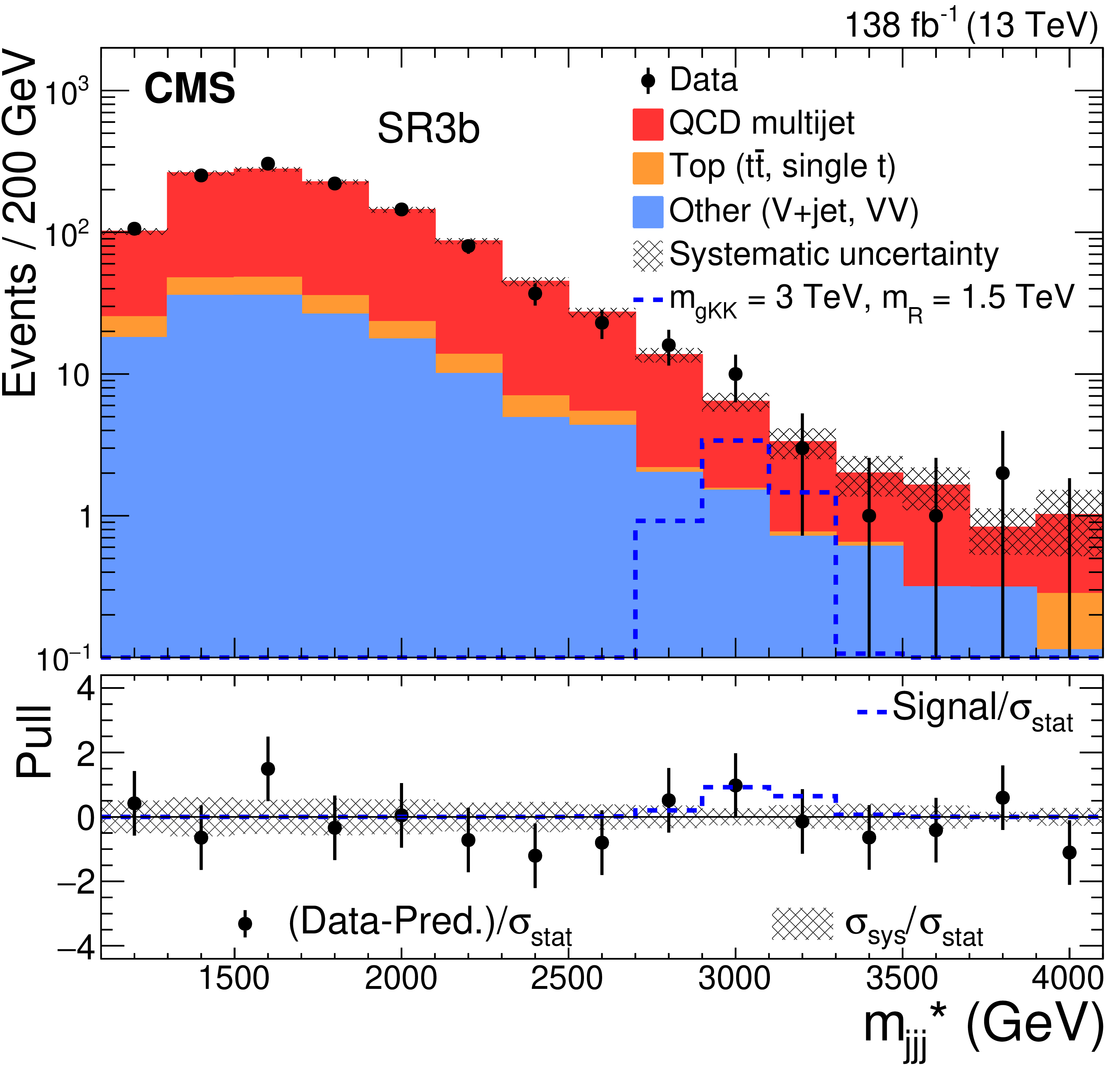 The $ m^*_{\mathrm{jjj}} $ postfit spectra in the five SRxb. Upper to lower, and left to right: SR1b, SR2b, SR3b, SR4b, and SR5b. The lower panels show the pull distributions, as defined in the text, together with expected signal event yields and the systematic uncertainty normalized to $ \sigma_{\text{stat}} $. |