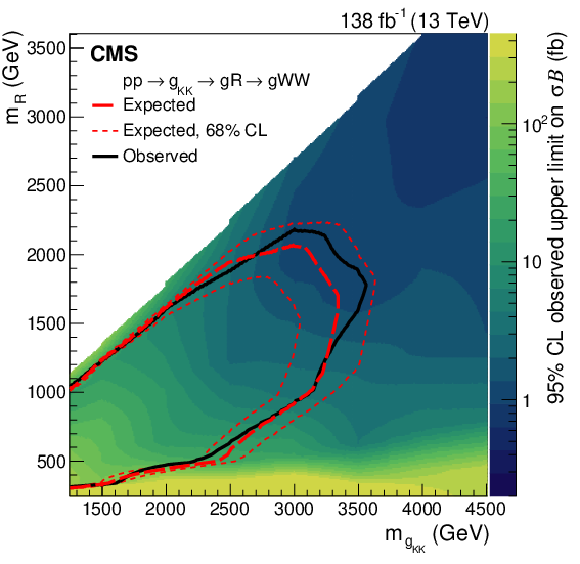 The 95% CL upper limits on the production cross section times branching fraction $ \sigma\mathcal{B} $, for the process $ \mathrm{p}\mathrm{p}\to\mathrm{g}_{\text{KK}}\to\mathrm{g}\mathrm{R}\to\mathrm{g}\mathrm{W}\mathrm{W} $. The black solid (red dashed) line contour indicates the observed (expected) exclusion region of the $ \mathrm{g}_{\text{KK}} $ and $ \mathrm{R} $ masses. The red dotted lines show the 68% CL band of the expected limit contour. |