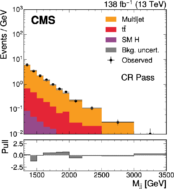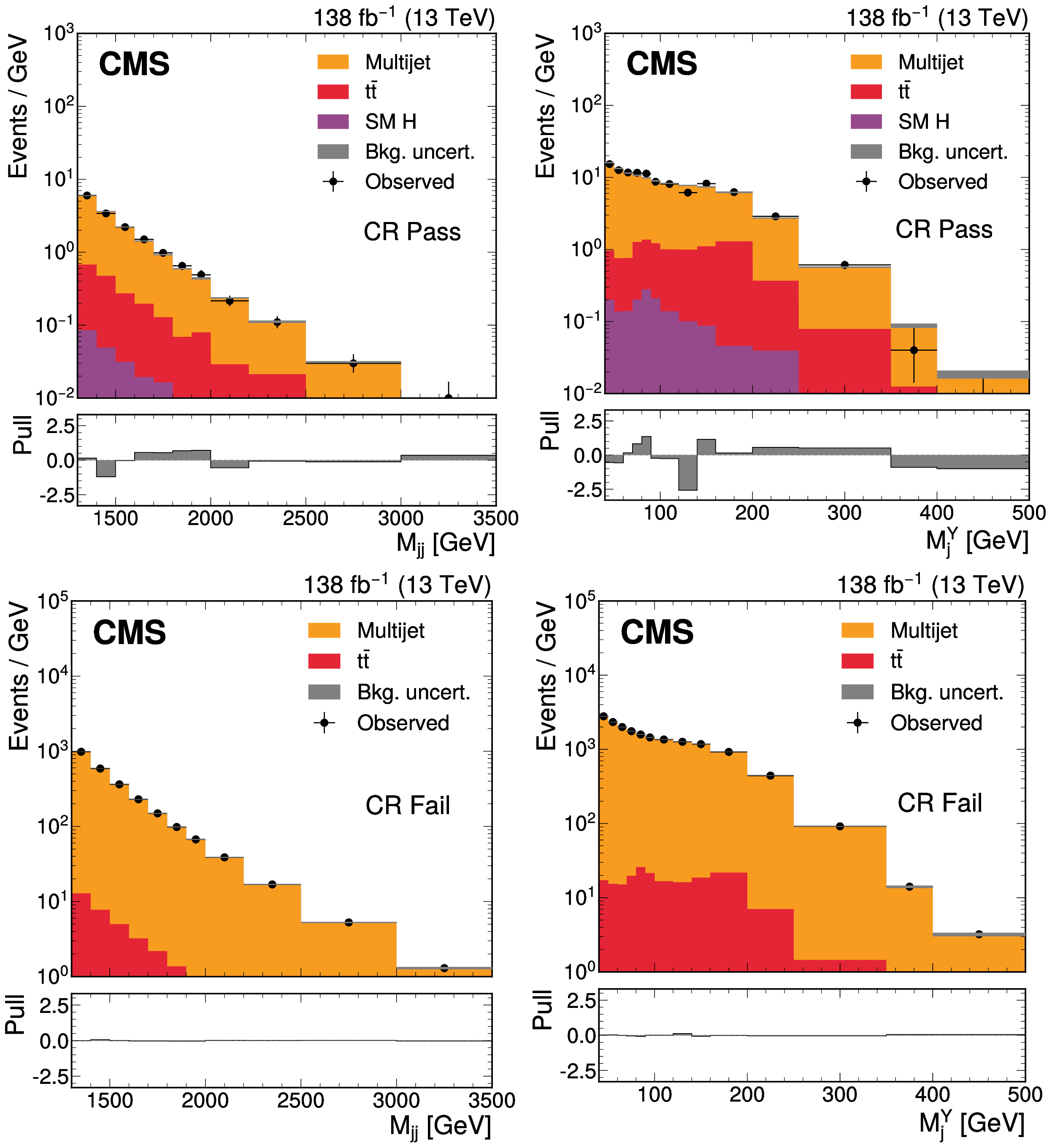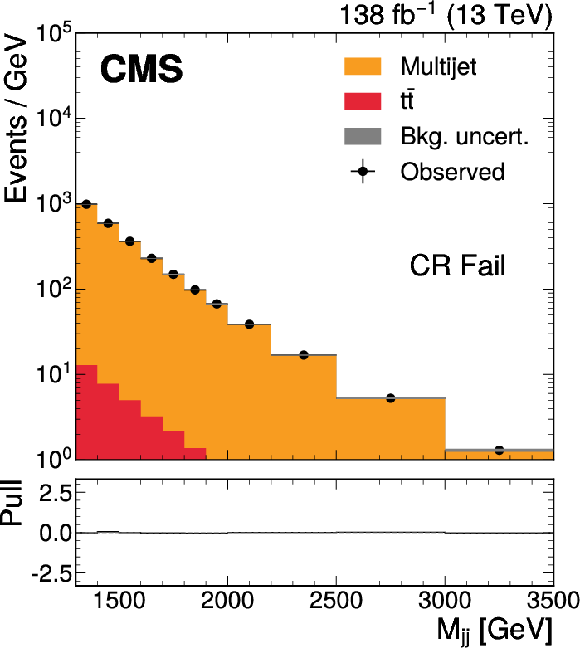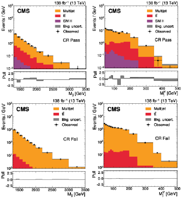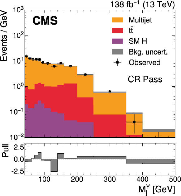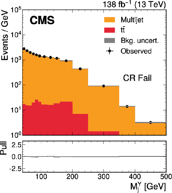 The $ M_\mathrm{jj} $ (left) and $ M_\mathrm{j}^{\mathrm{Y}} $ (right) projections showing the number of observed events per GeV (black markers) compared with the backgrounds estimated in the fit to the data (filled histograms) in the CR. Pass (upper) and Fail (lower) categories are shown. The high level of agreement between the model and the data in the Fail region is due to the nature of the background estimate. The lower panels show the ``Pull'' defined as (observed events}-\text{expected events) $ /\sqrt{\smash[b]{\sigma_{\text{obs}}^{2} + \sigma_{\text{bkg}}^{2}}} $, where $ \sigma_{\text{obs}} $ and $ \sigma_{\text{bkg}} $ are the total uncertainties in the observation and the background estimation, respectively. |