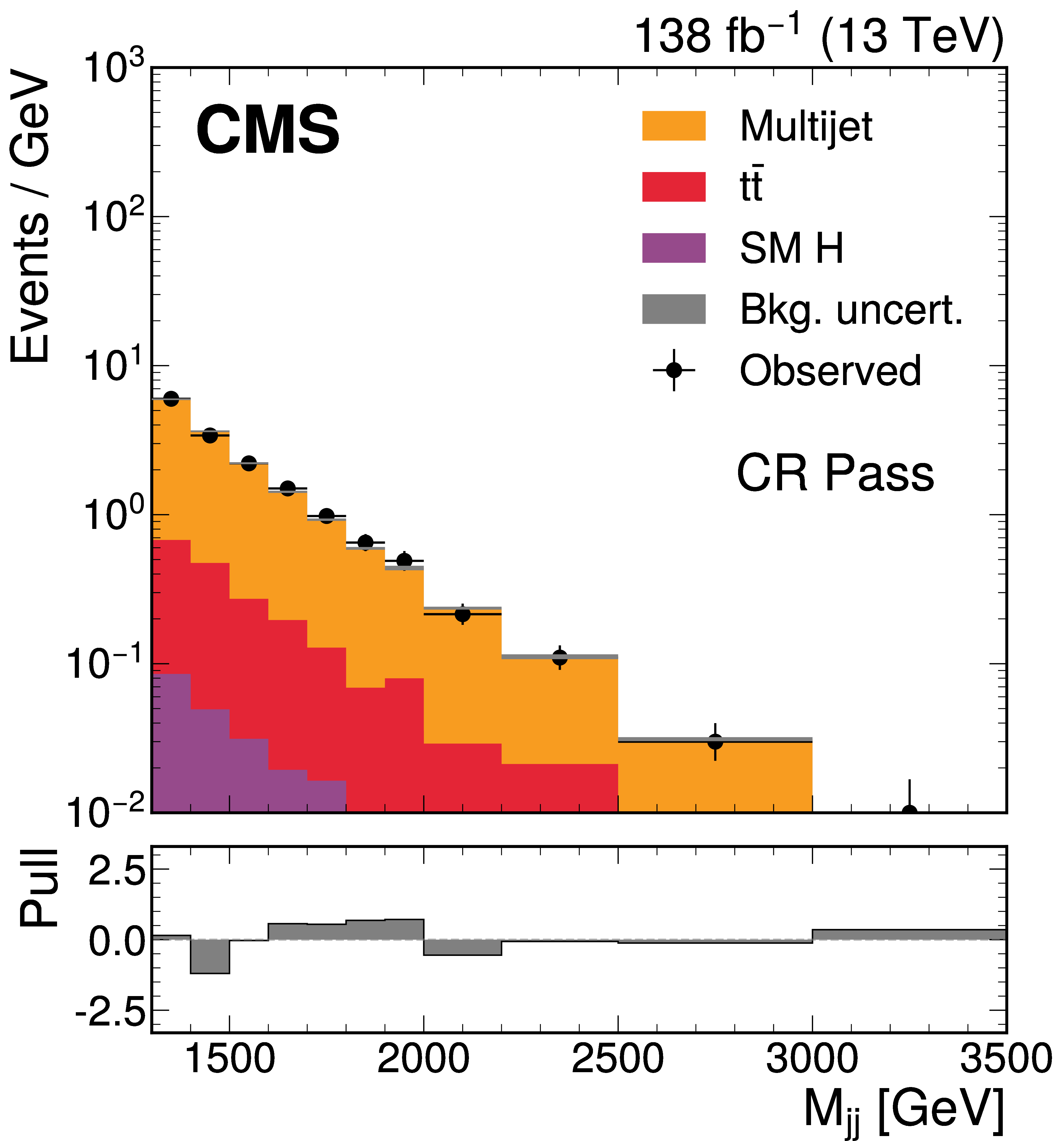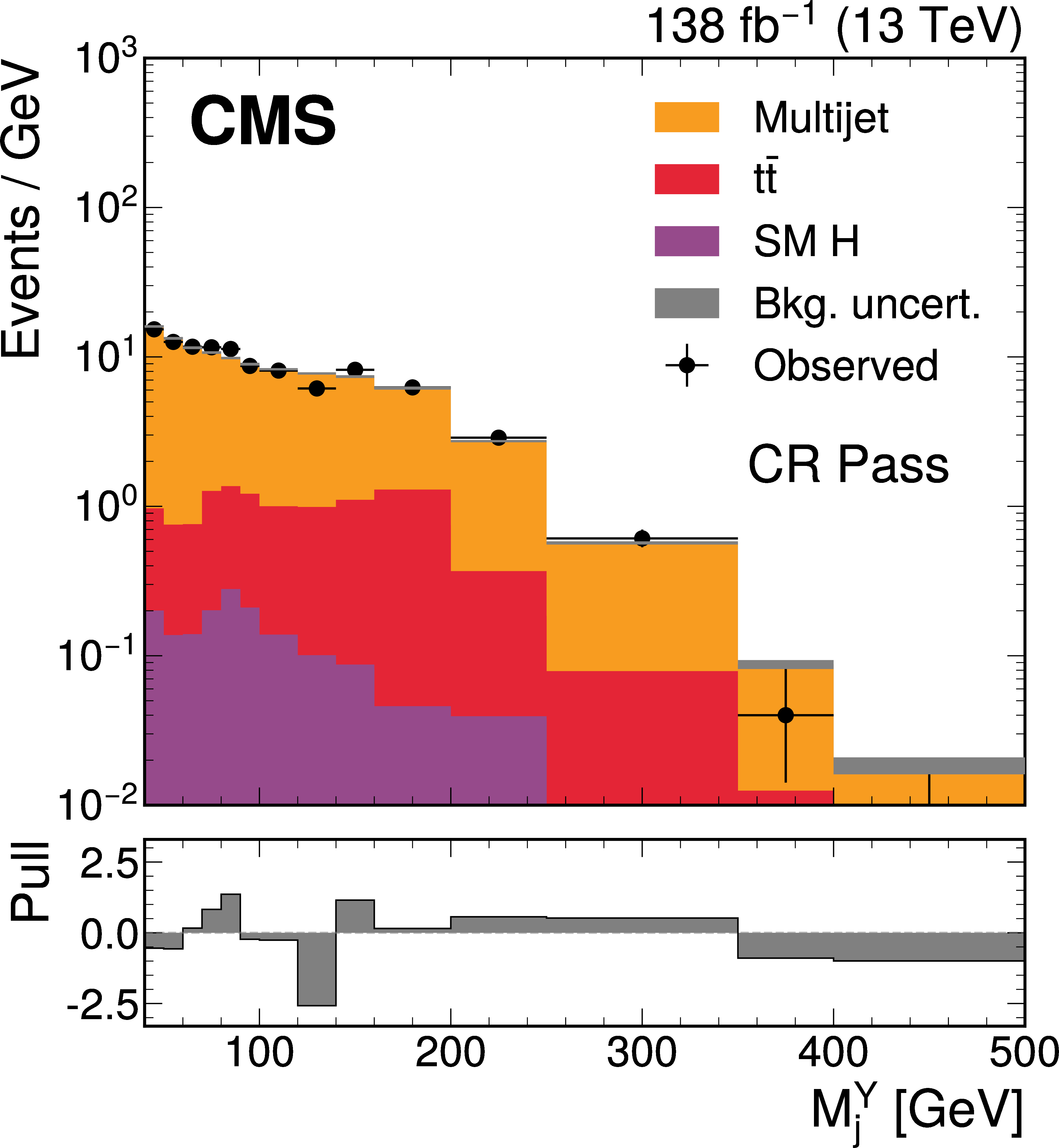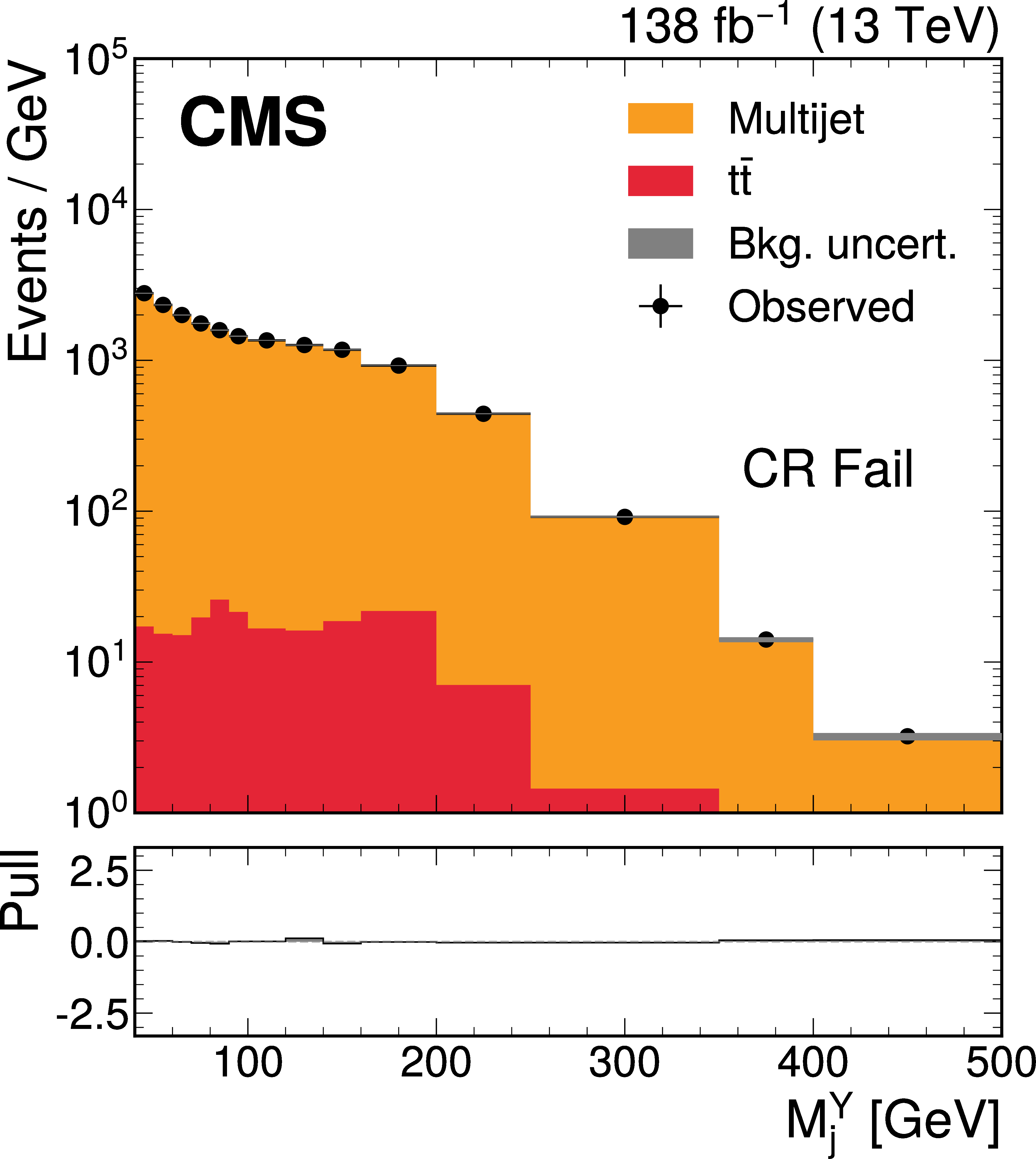 The $ M_\mathrm{jj} $ (left) and $ M_\mathrm{j}^{\mathrm{Y}} $ (right) projections showing the number of observed events per GeV (black markers) compared with the backgrounds estimated in the fit to the data (filled histograms) in the CR. Pass (upper) and Fail (lower) categories are shown. The high level of agreement between the model and the data in the Fail region is due to the nature of the background estimate. The lower panels show the ``Pull'' defined as (observed events}-\text{expected events) $ /\sqrt{\smash[b]{\sigma_{\text{obs}}^{2} + \sigma_{\text{bkg}}^{2}}} $, where $ \sigma_{\text{obs}} $ and $ \sigma_{\text{bkg}} $ are the total uncertainties in the observation and the background estimation, respectively. |