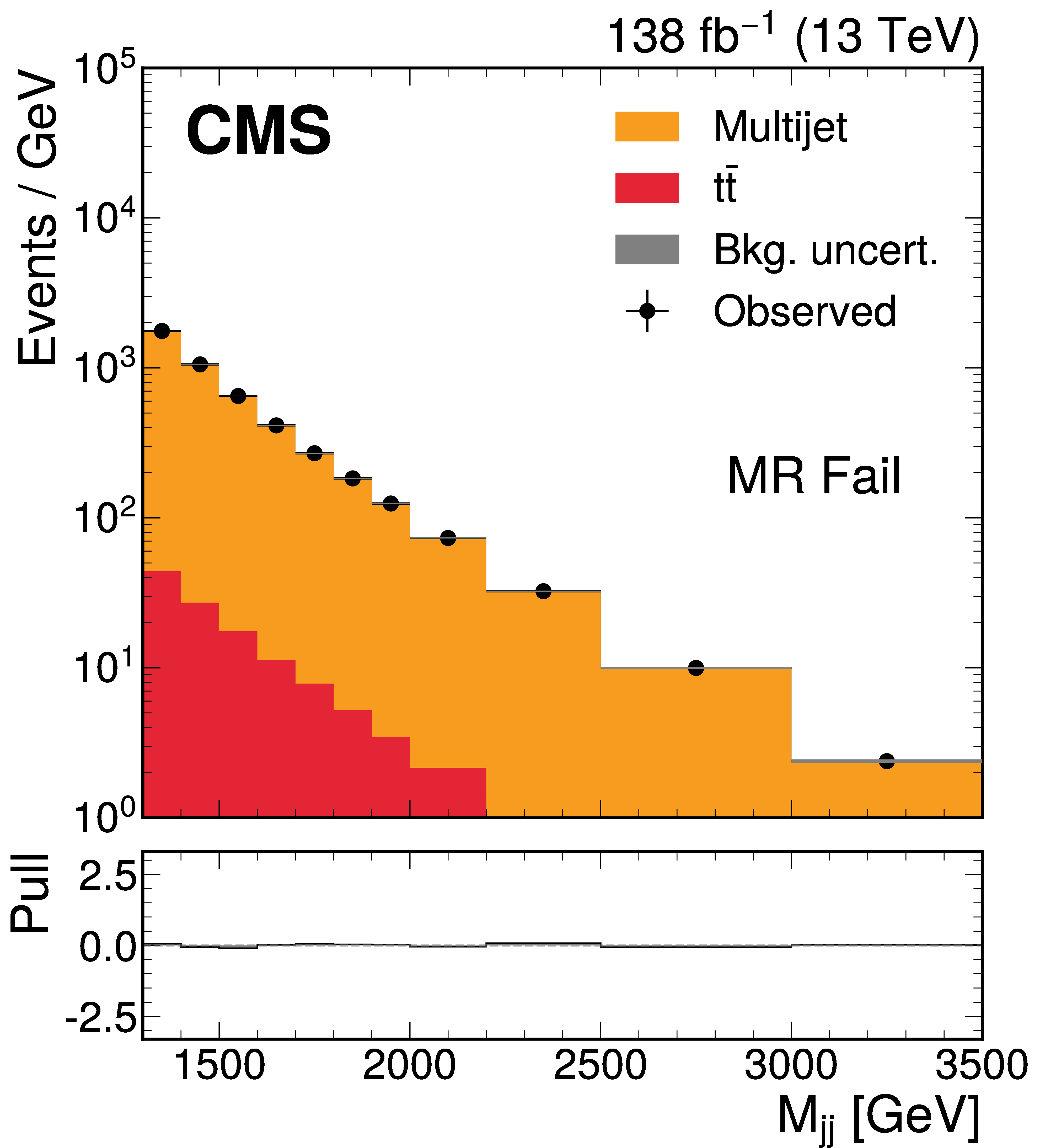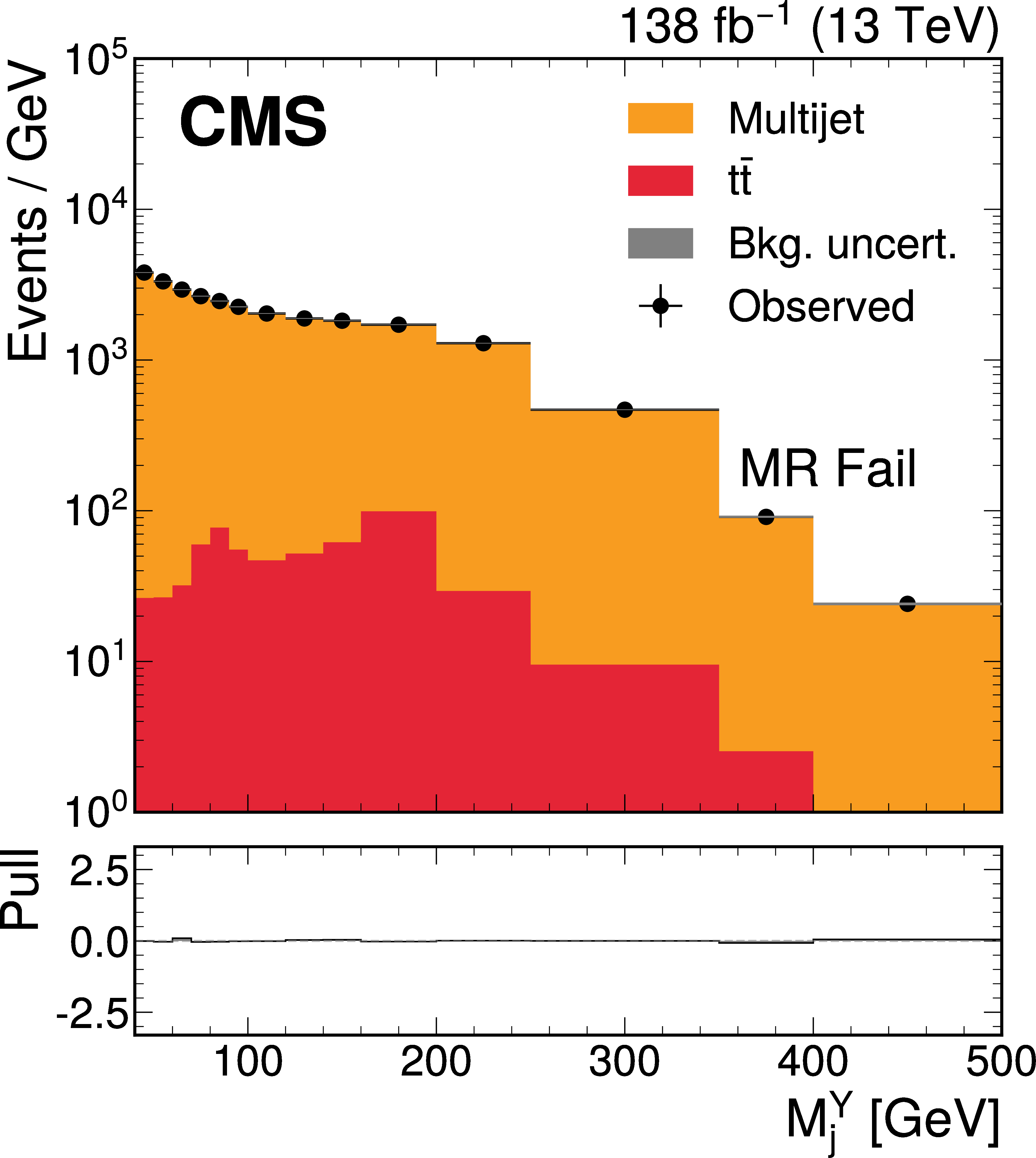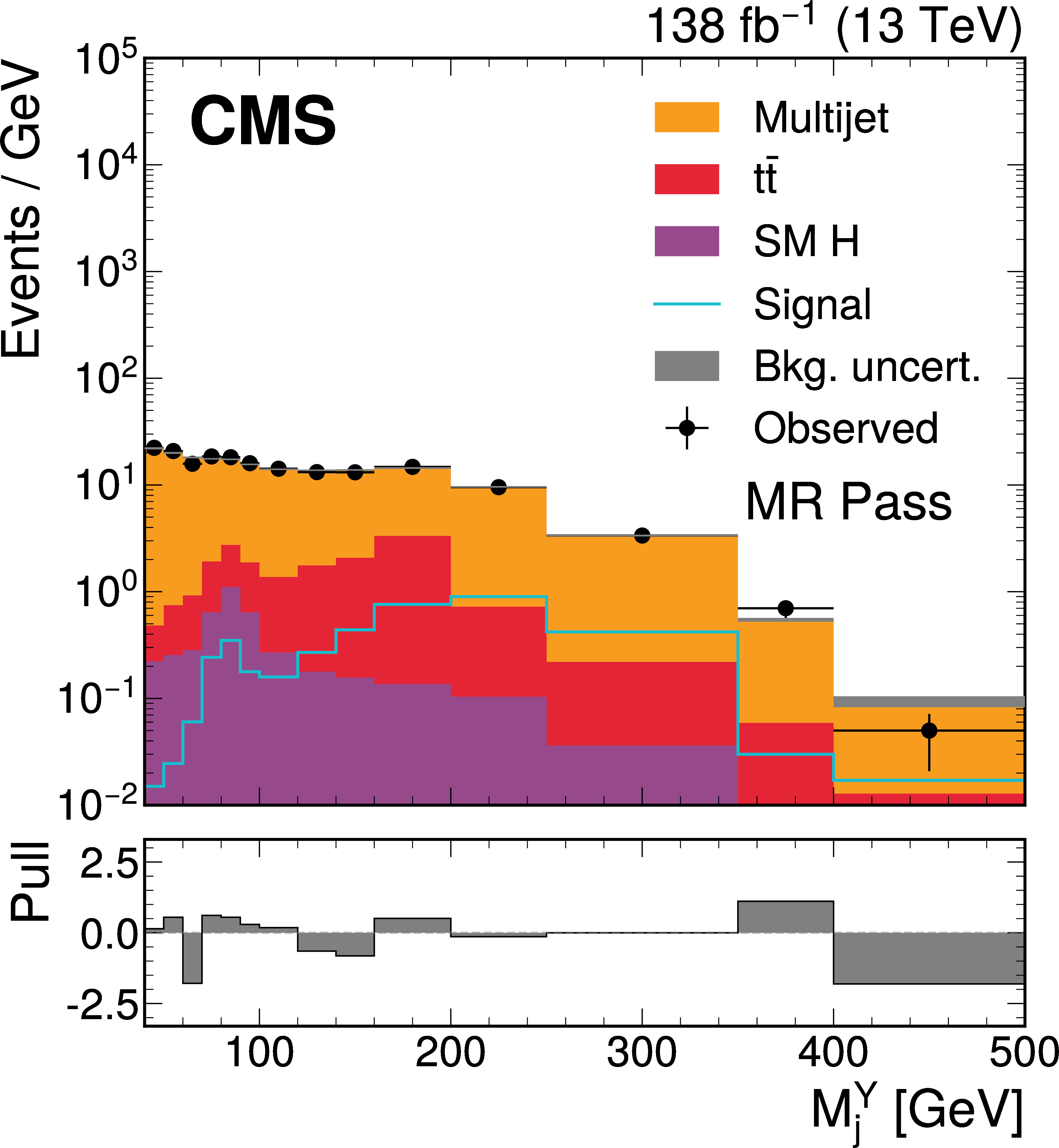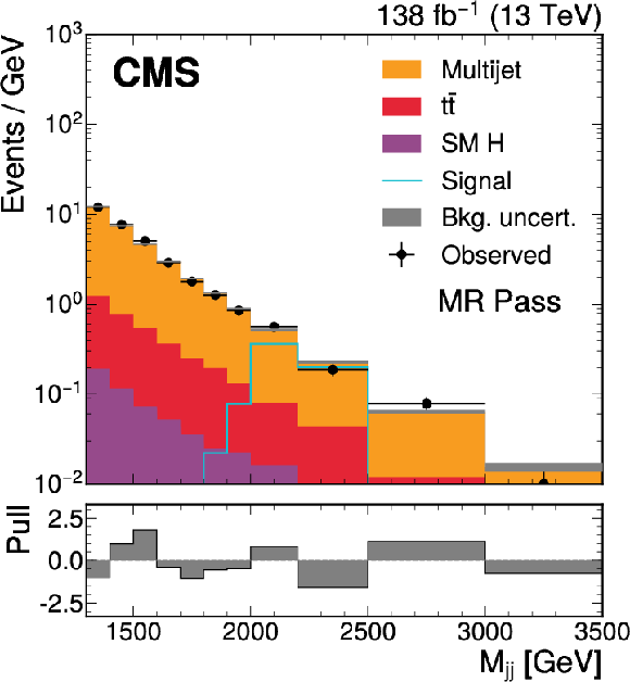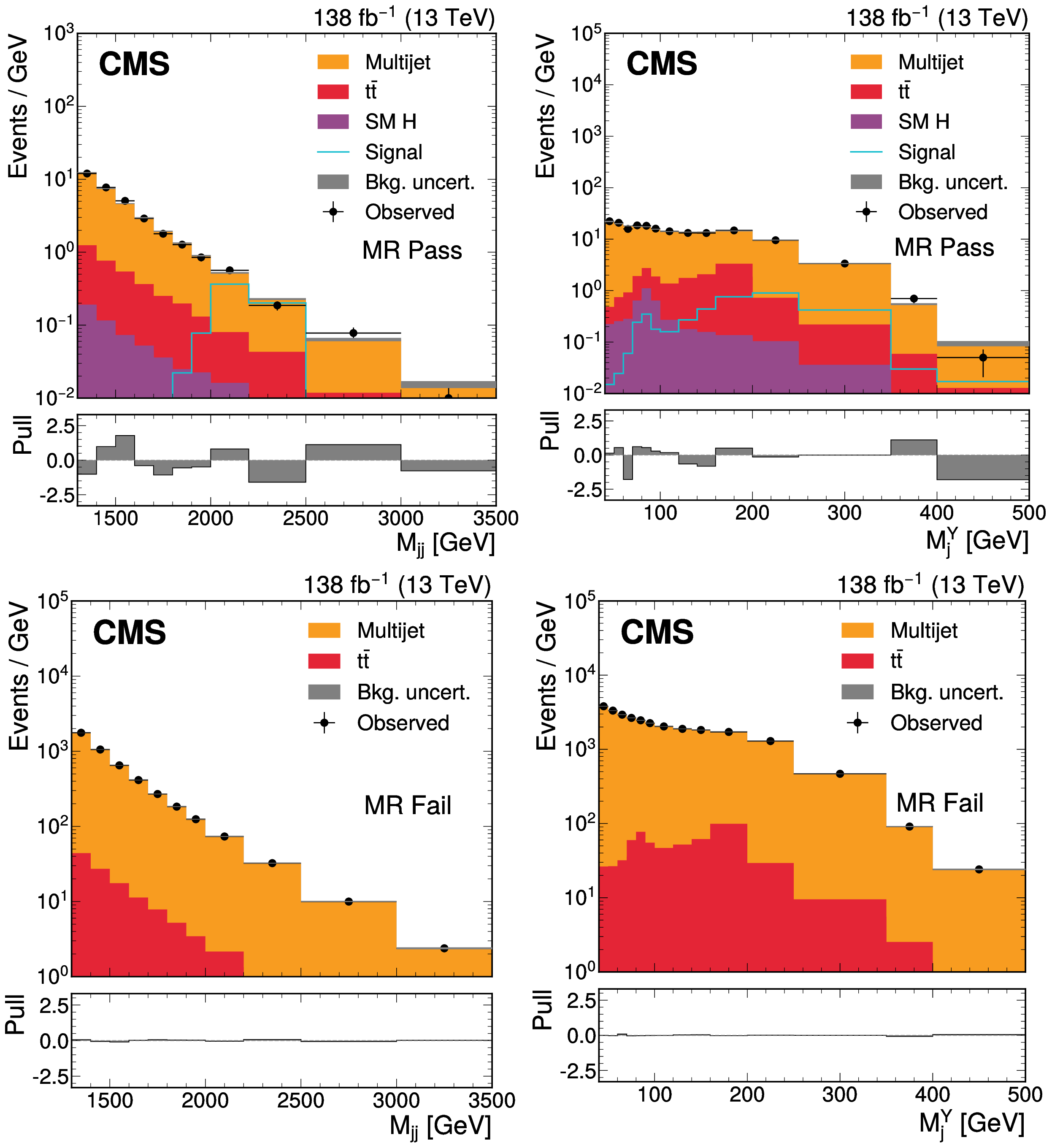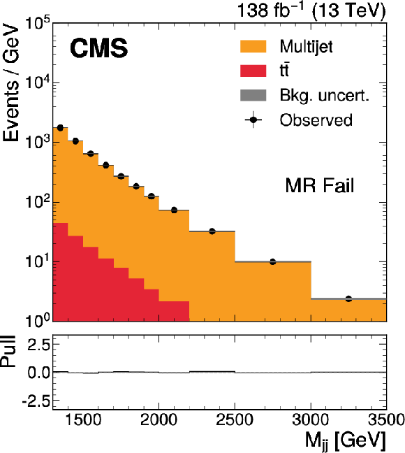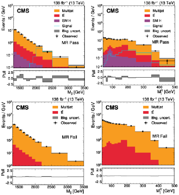 The $ M_\mathrm{jj} $ (left) and $ M_\mathrm{j}^{\mathrm{Y}} $ (right) projections showing the number of observed events per GeV (black markers) compared with the backgrounds estimated in the fit to the data (filled histograms) in the MR. Pass (upper) and Fail (lower) categories are shown. The expected contribution from the signal benchmark with $ M_{\mathrm{X}} = $ 2200 GeV and $ M_{\mathrm{Y}} = $ 250 GeV is overlaid in the MR Pass, assuming a production cross section of 5\unitfb. The high level of agreement between the model and the data in the Fail region is due to the nature of the background estimate. The lower panels show the ``Pull'' defined as (observed events}-\text{expected events) $ /\sqrt{\smash[b]{\sigma_{\text{obs}}^{2} + \sigma_{\text{bkg}}^{2}}} $, where $ \sigma_{\text{obs}} $ and $ \sigma_{\text{bkg}} $ are the total uncertainties in the observation and the background estimation, respectively. |