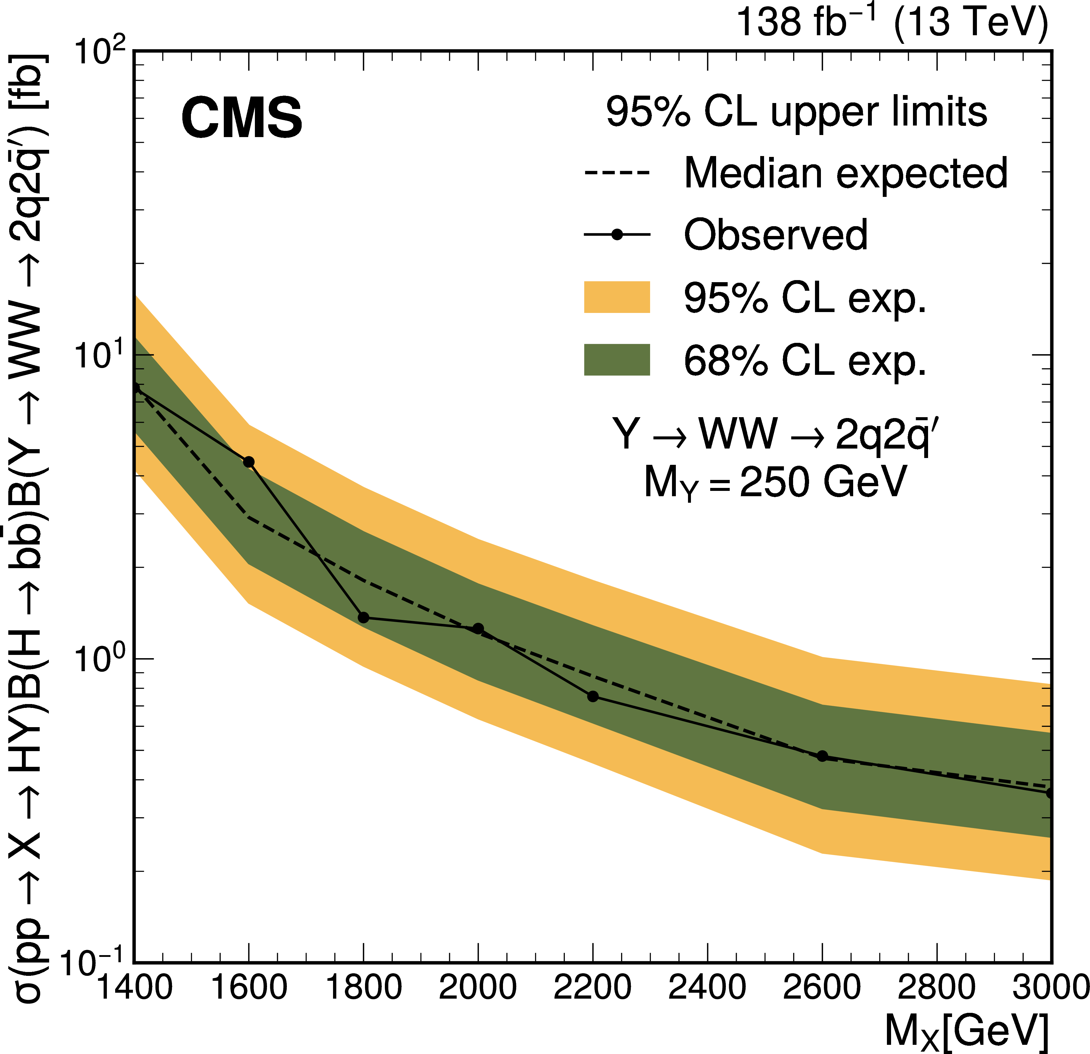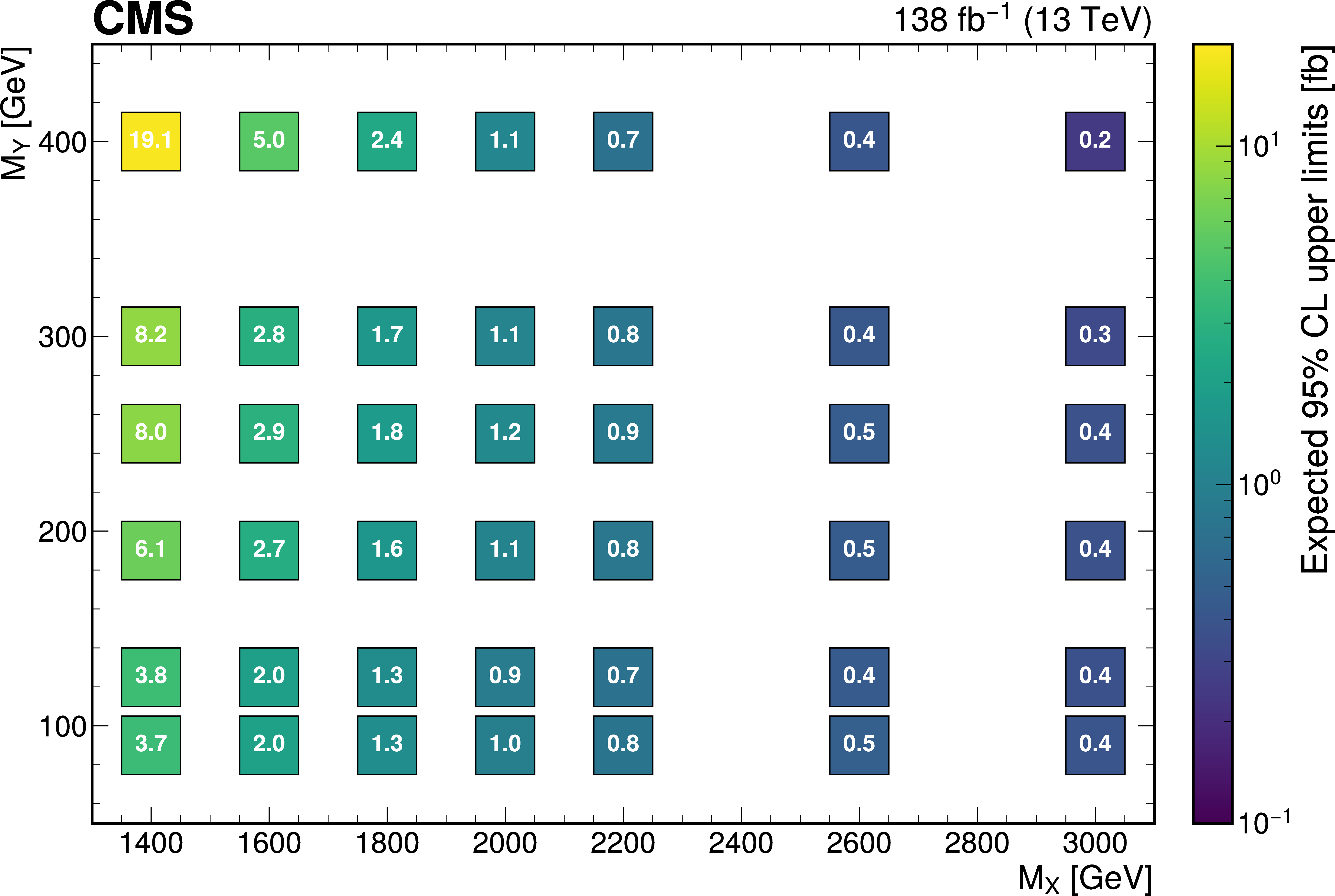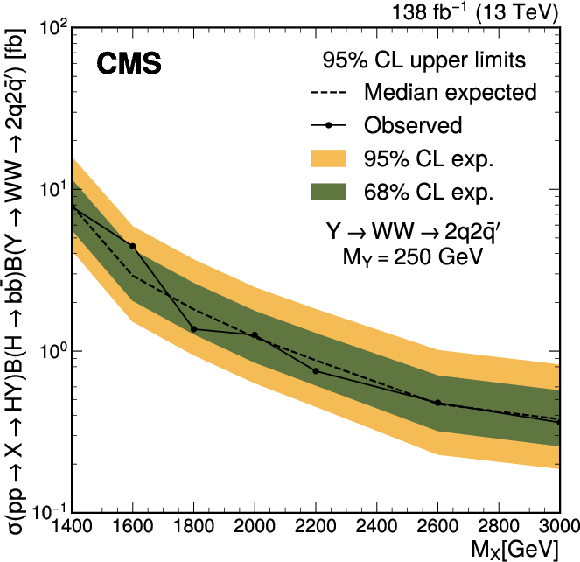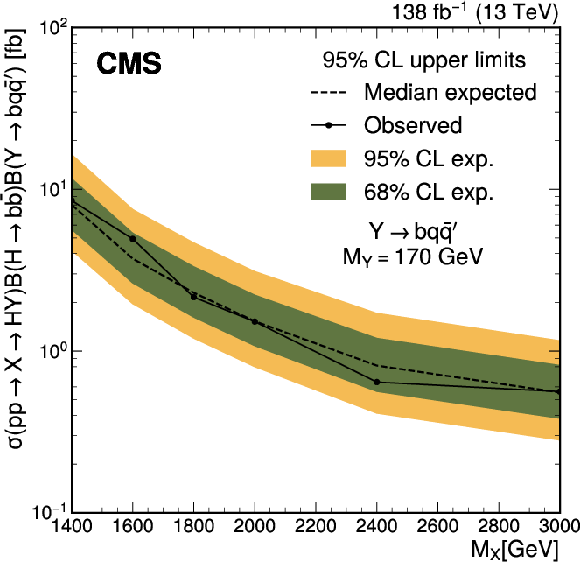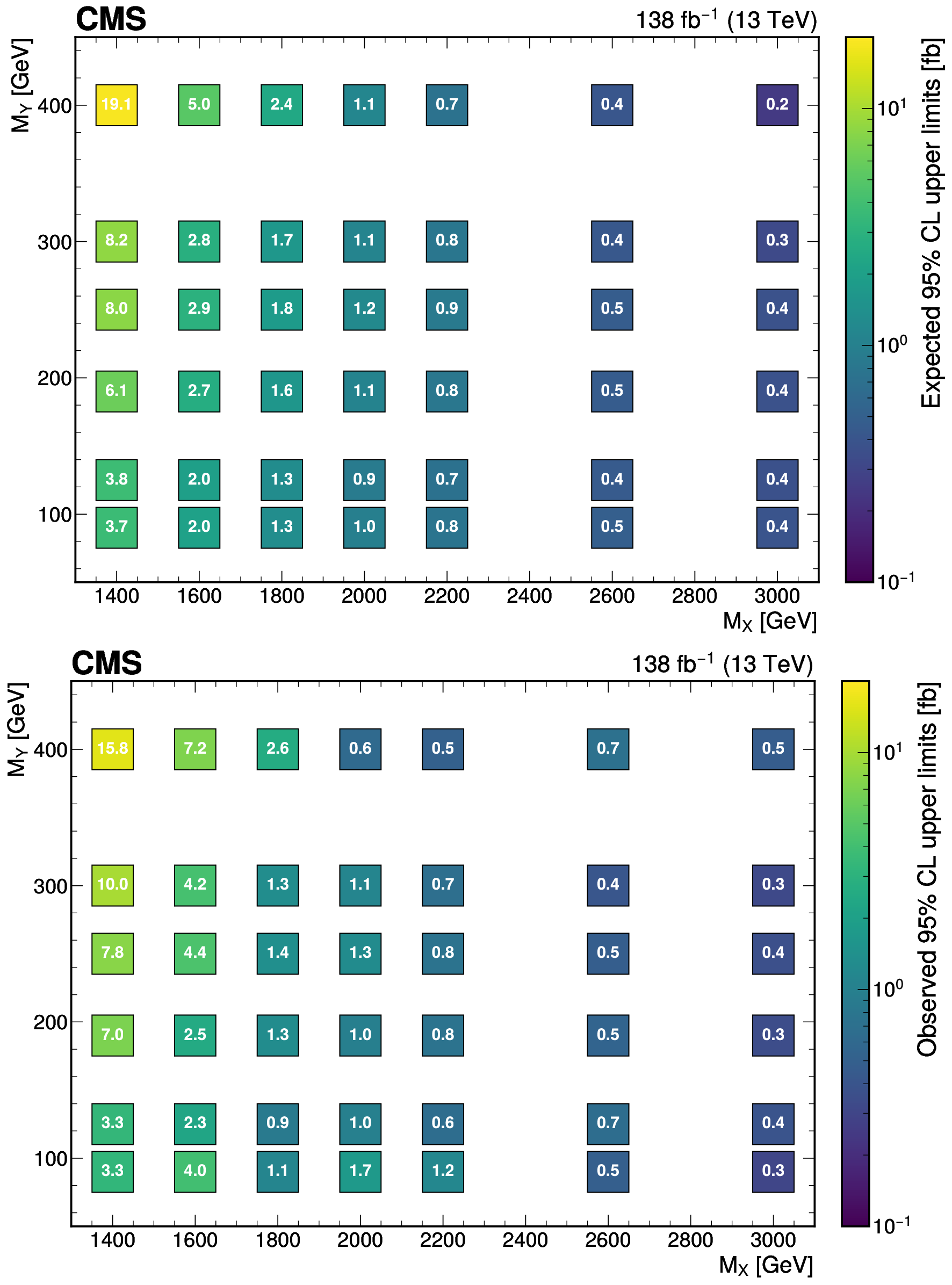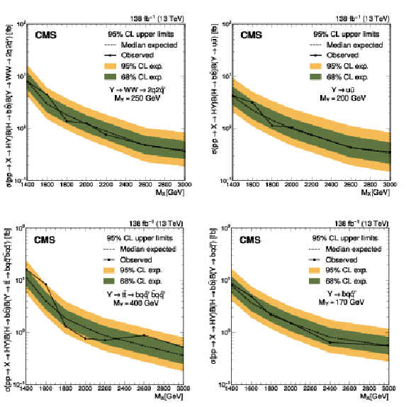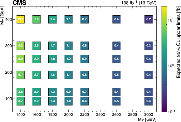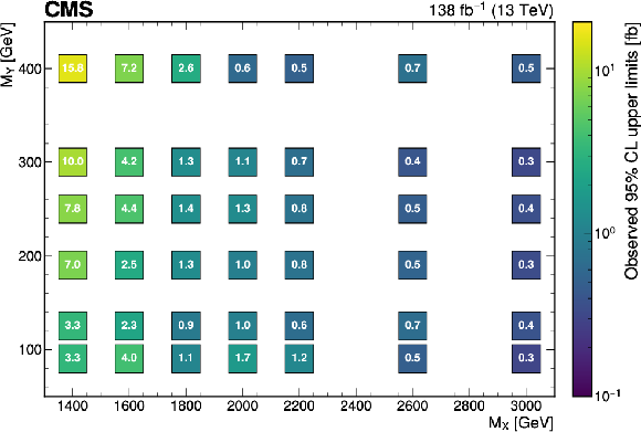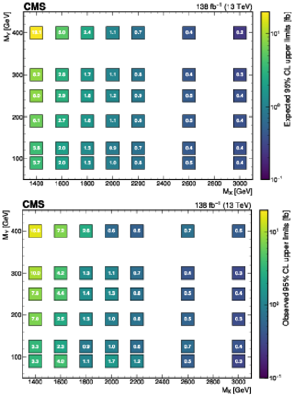 The expected (upper) and observed (lower) 95% confidence level upper limits on $ \sigma(\mathrm{p} \to \mathrm{X} \to \mathrm{H} \mathrm{Y})\mathcal{B}(\mathrm{H}\to\mathrm{b}\overline{\mathrm{b}})\mathcal{B}(\mathrm{Y}\to\mathrm{W}\mathrm{W}\to2\mathrm{q} 2\overline{\mathrm{q}}^\prime) $ for different values of $ M_{\mathrm{X}} $ and $ M_{\mathrm{Y}} $. The limits have been evaluated in discrete steps corresponding to the centers of the boxes. The numbers in the boxes are given in fb. |