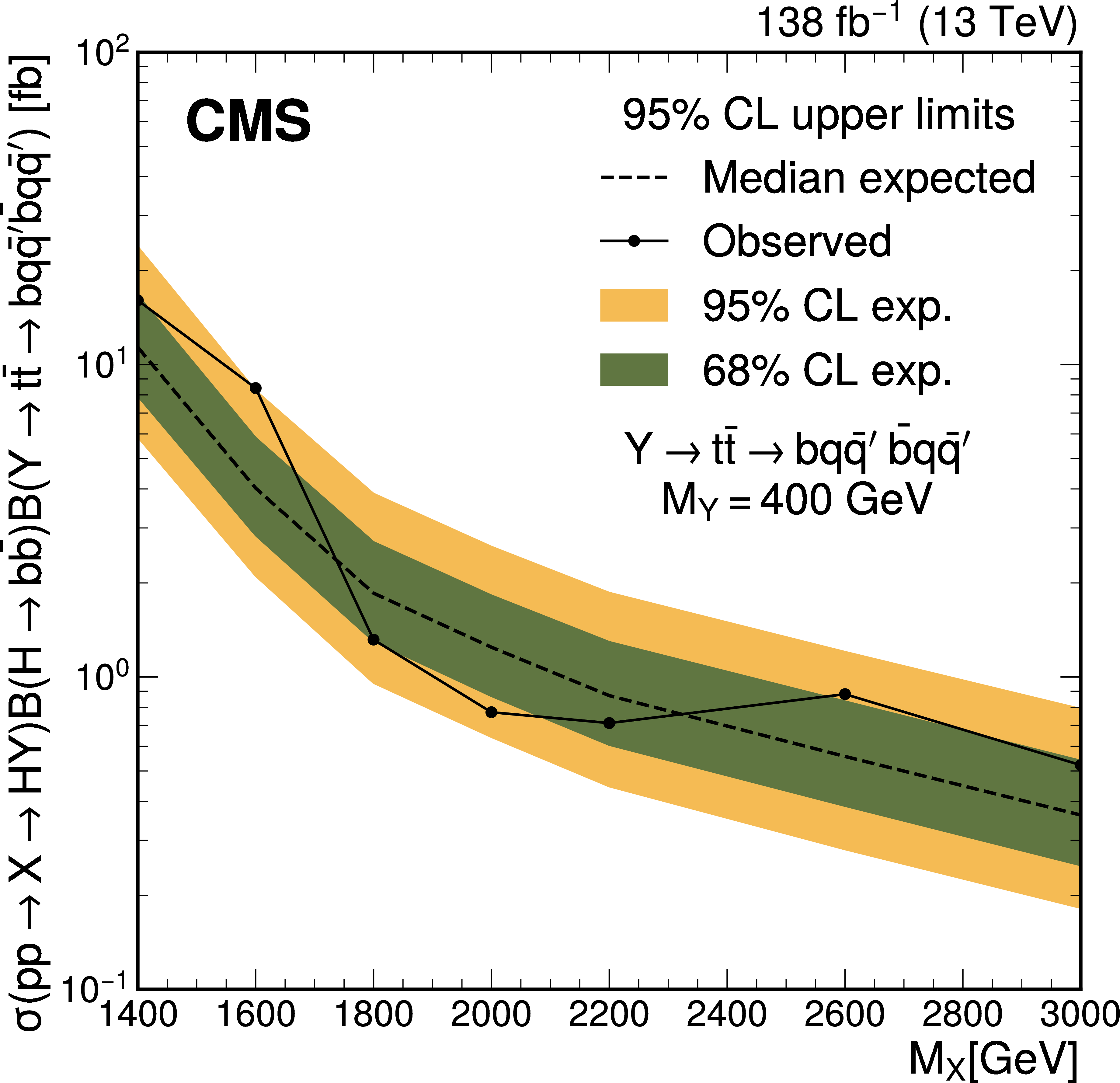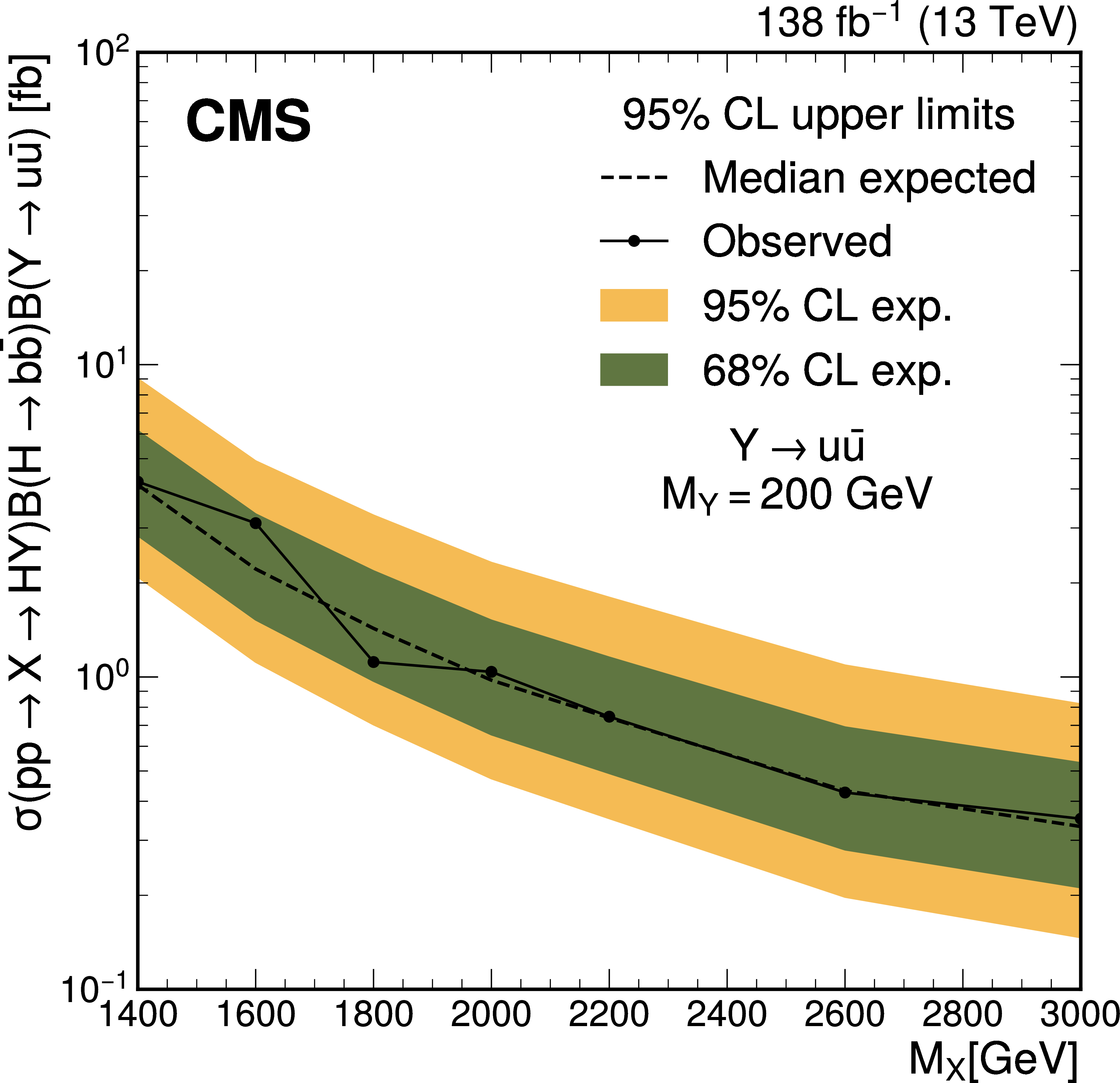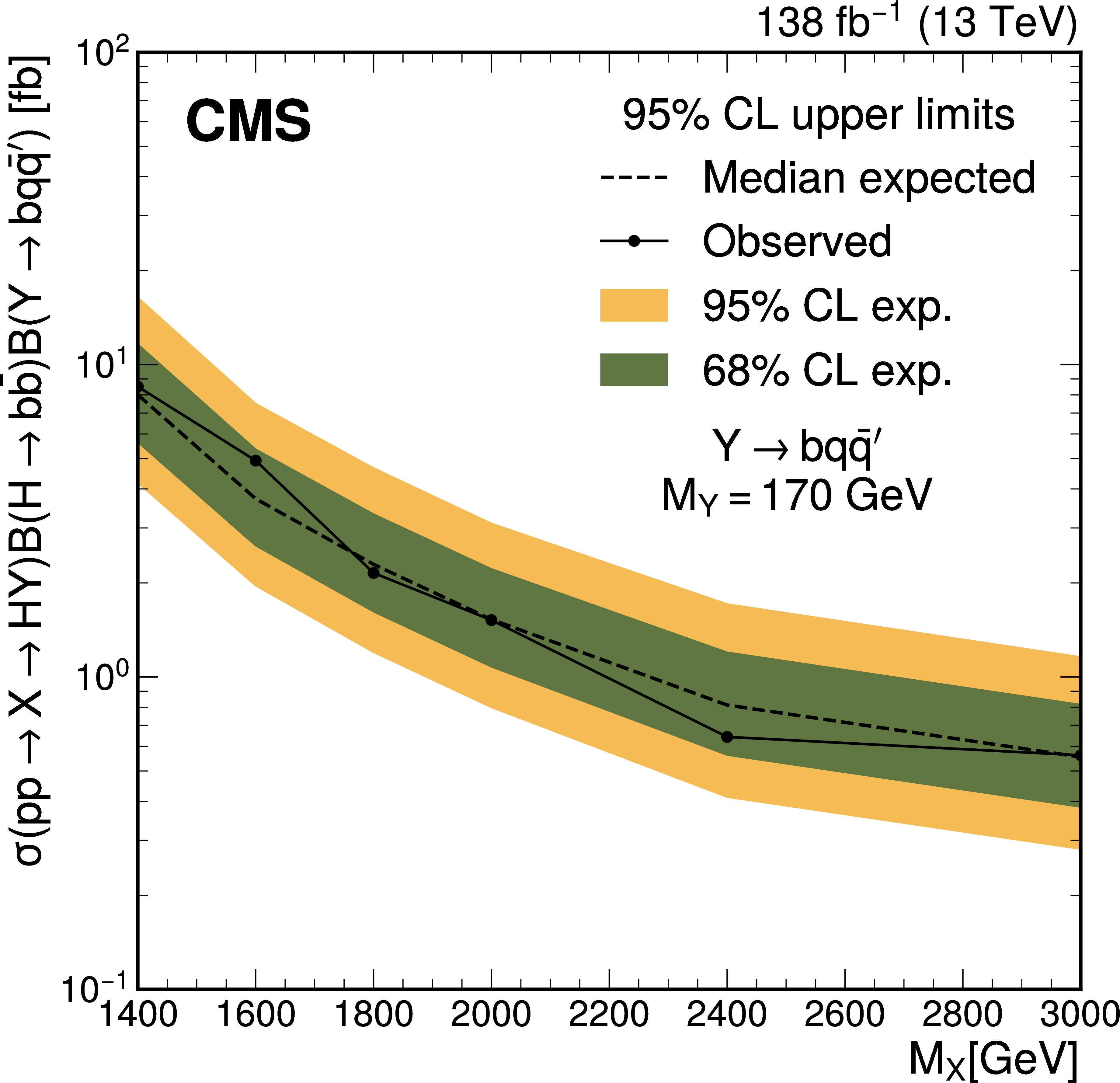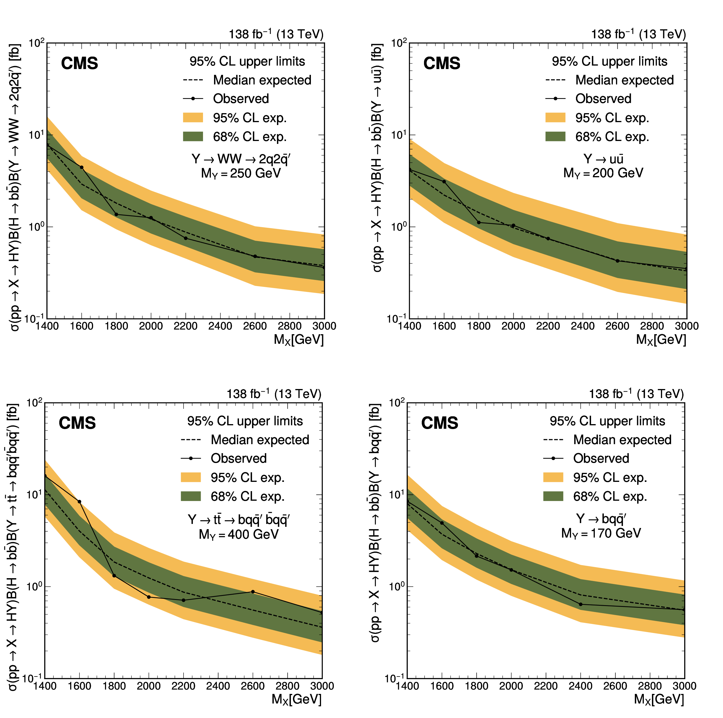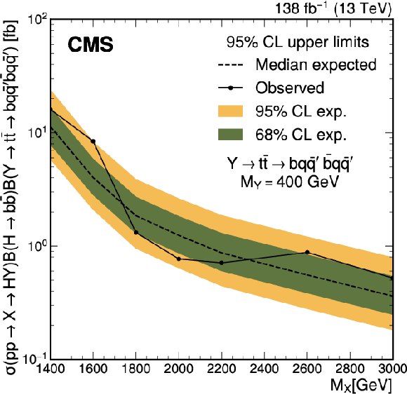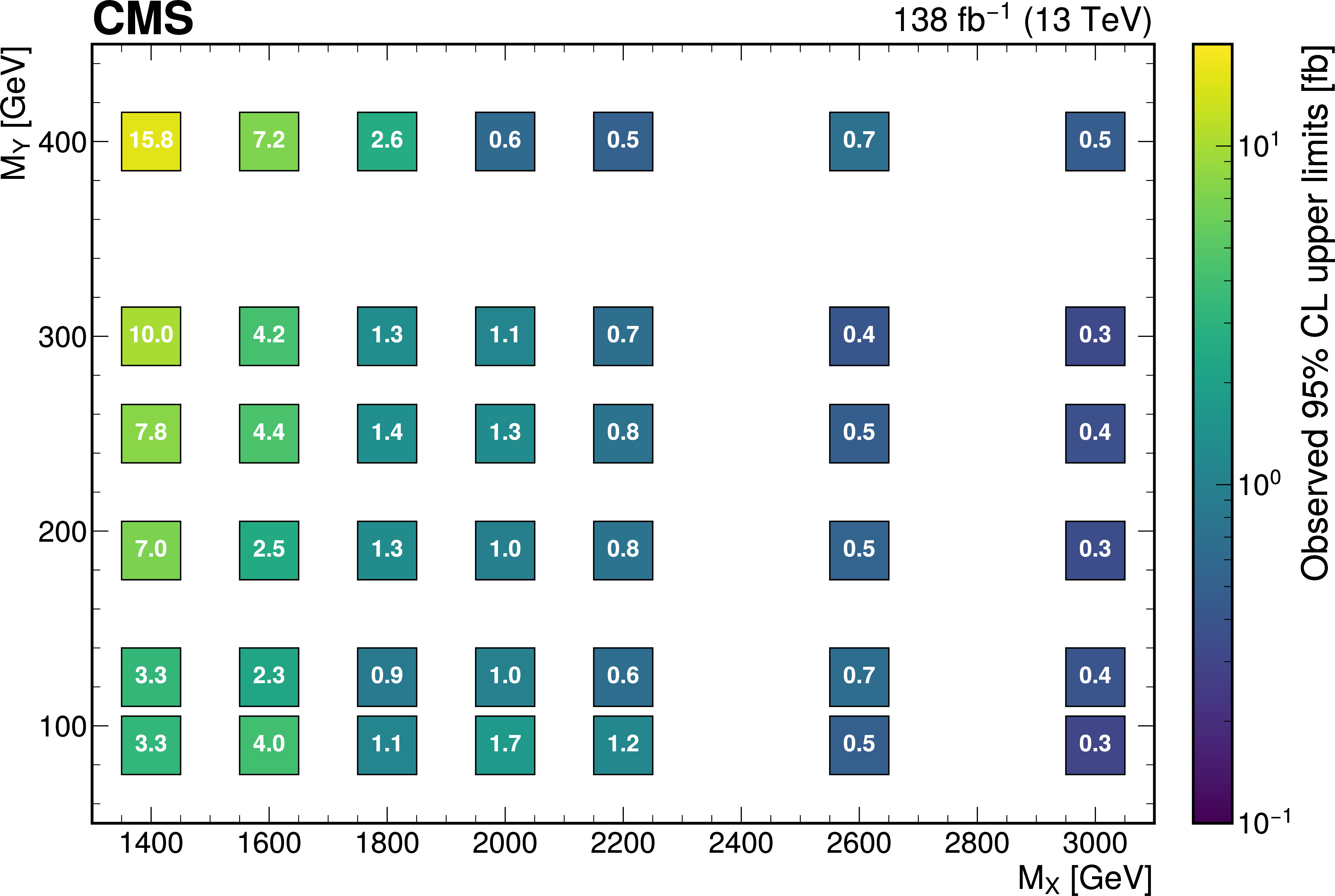 The expected (upper) and observed (lower) 95% confidence level upper limits on $ \sigma(\mathrm{p} \to \mathrm{X} \to \mathrm{H} \mathrm{Y})\mathcal{B}(\mathrm{H}\to\mathrm{b}\overline{\mathrm{b}})\mathcal{B}(\mathrm{Y}\to\mathrm{W}\mathrm{W}\to2\mathrm{q} 2\overline{\mathrm{q}}^\prime) $ for different values of $ M_{\mathrm{X}} $ and $ M_{\mathrm{Y}} $. The limits have been evaluated in discrete steps corresponding to the centers of the boxes. The numbers in the boxes are given in fb. |