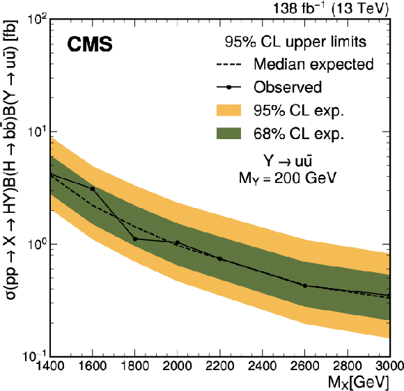 The median expected (dashed line) and observed (solid line) 95% confidence level upper limits on the main and three alternative signal scenarios as a function of $ M_{\mathrm{X}} $. The inner (green) band and outer (yellow) band represent the regions containing 68% and 95%, respectively, of the distribution of limits expected under the background-only hypothesis. |