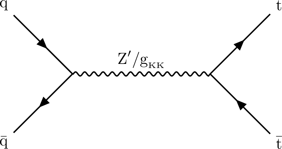 Example Feynman diagrams at leading order for the production and decay of a spin-1 $ \mathrm{Z}^{'} /g_{KK}$ boson (left) and a scalar H or pseudoscalar $ \mathrm{A} $ resonance (right). |