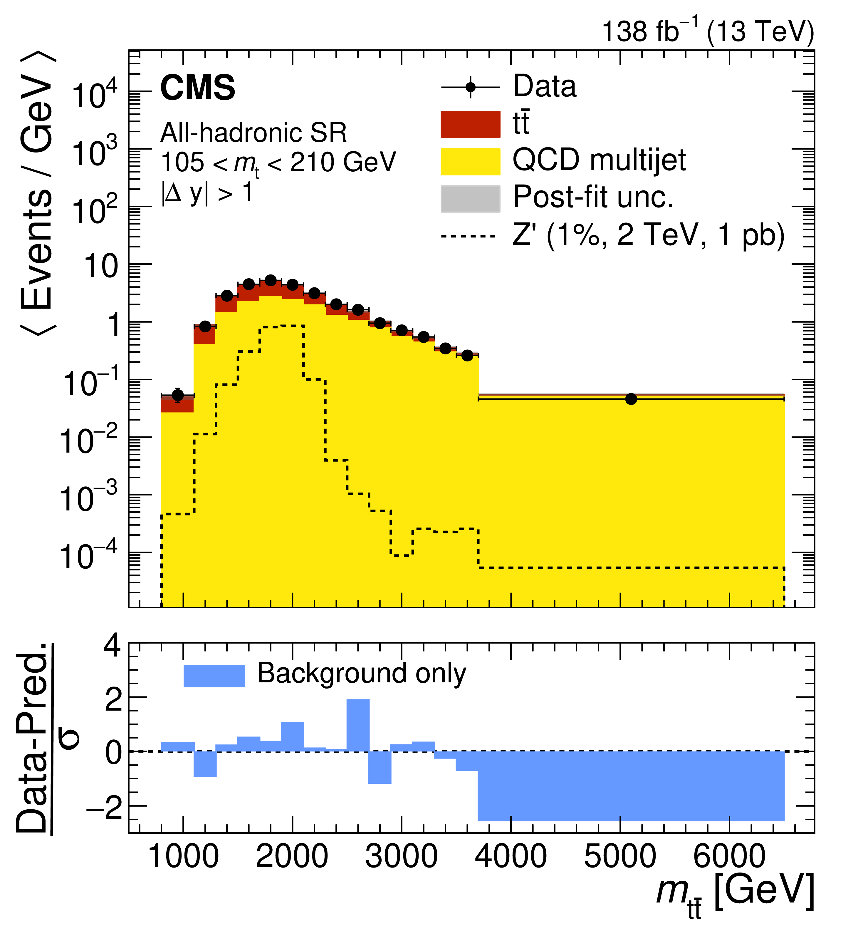 Sources of systematic uncertainties and correlations between them. The correlations take various forms: among data-taking years, among different processes (such as $ \mathrm{t} \overline{\mathrm{t}} $, single top quark production, etc), and/or channels (0\ell, 1\ell, and 2\ell). The $ \mathrm{Z}^{'} $ signal with a relative width of 1% and a mass of 2 TeV is used as a benchmark. The `` $ \mathrm{t} \overline{\mathrm{t}} $ rate'' row corresponds to the overall prior uncertainty in the $ \mathrm{t} \overline{\mathrm{t}} $ production cross section. The `` $ \mathrm{t} \overline{\mathrm{t}} $ shape'' row corresponds to differences in shapes between the NLO simulation and measured values of the $ \mathrm{t} \overline{\mathrm{t}} $ $ p_{\mathrm{T}} $ spectrum at large momentum due to destructive interference from higher-order terms that are not present in the simulation. |
