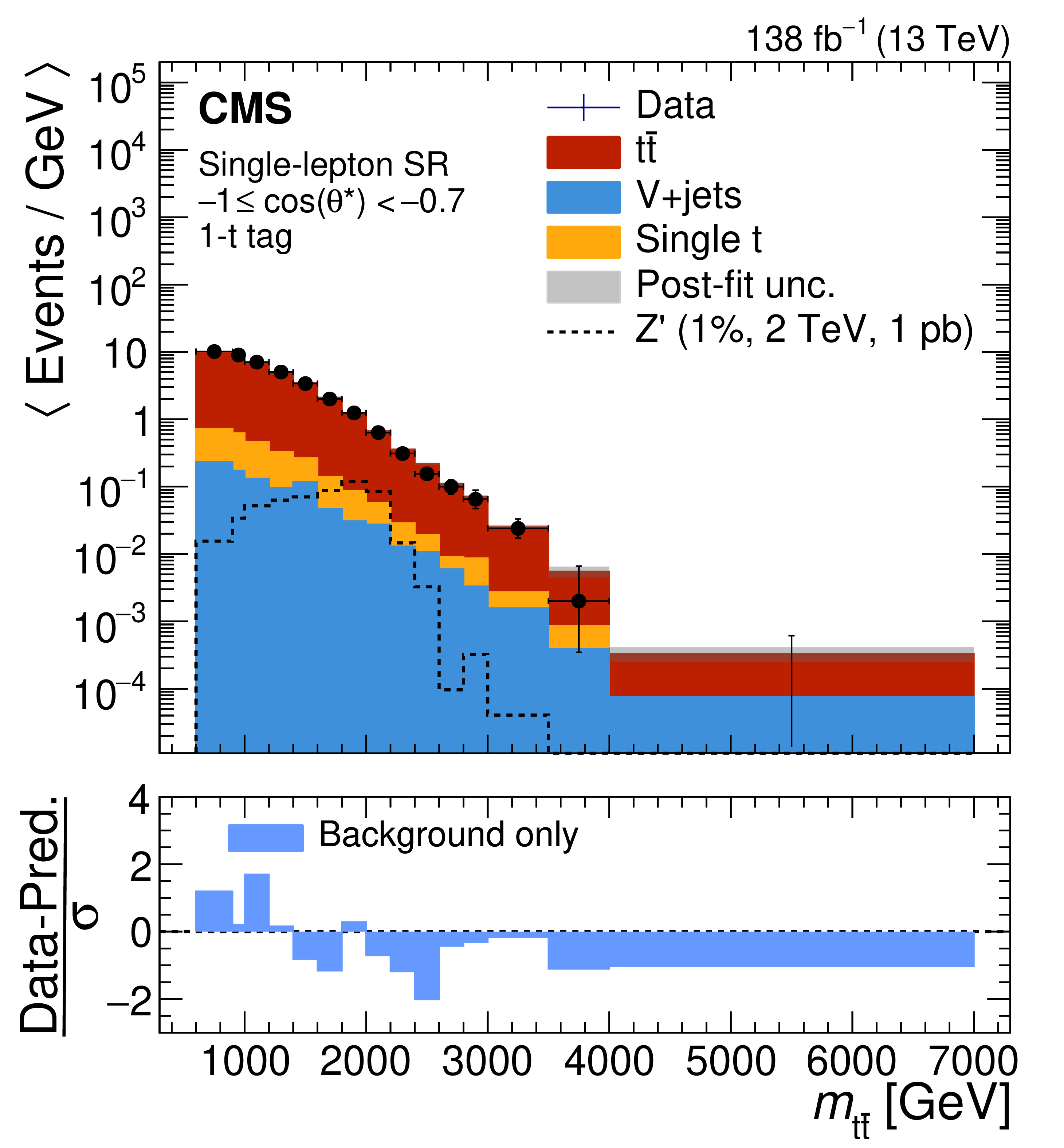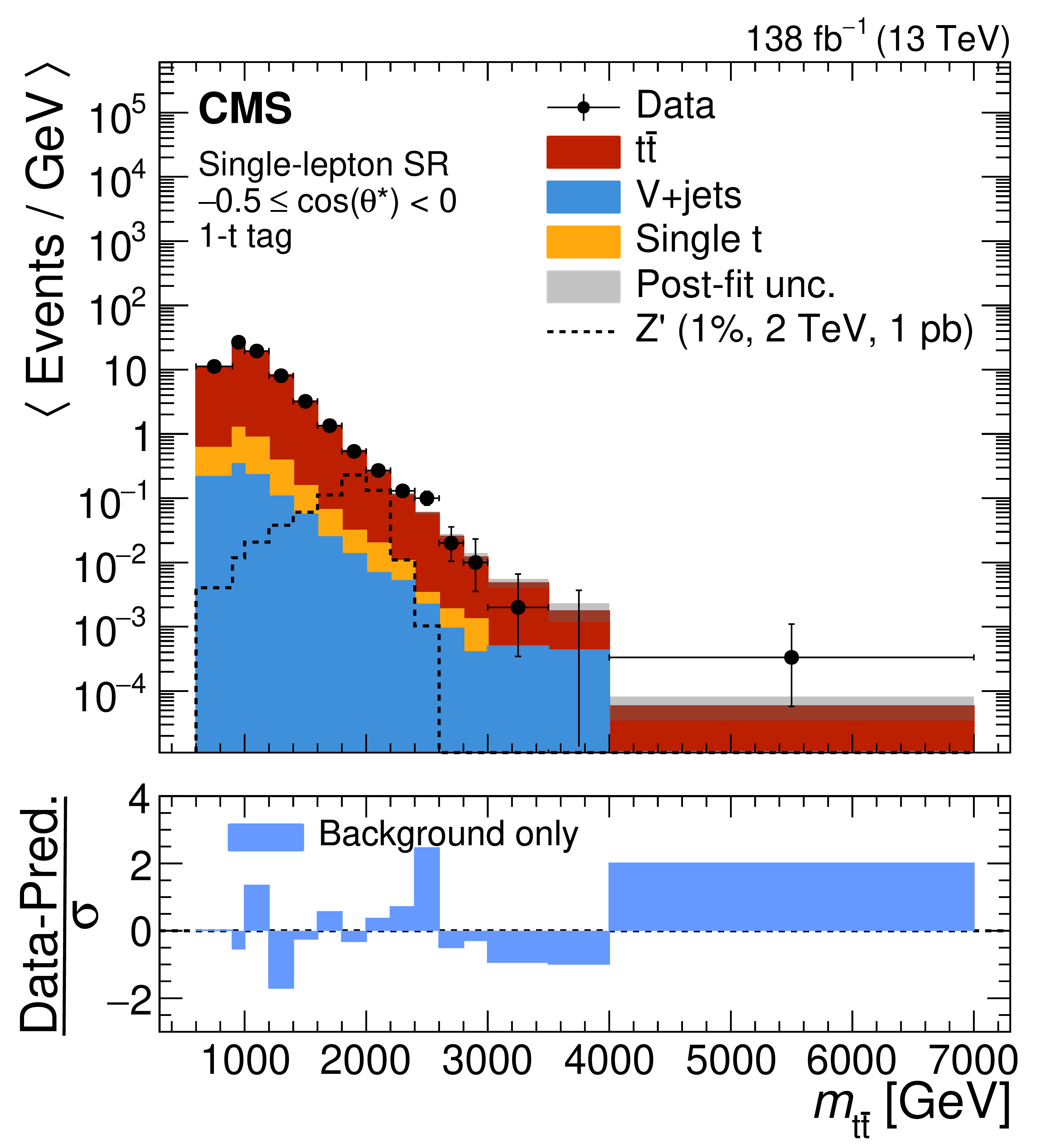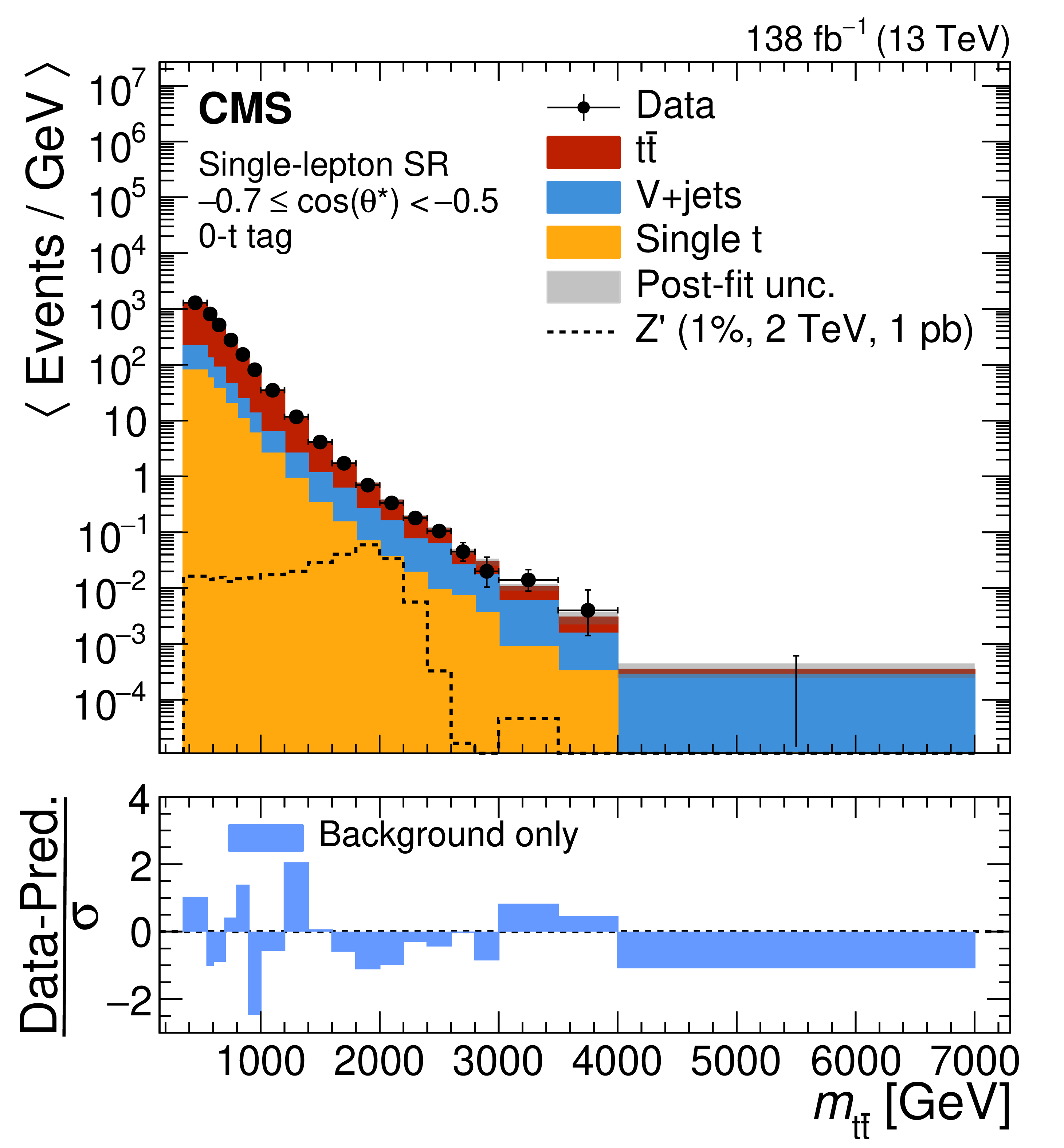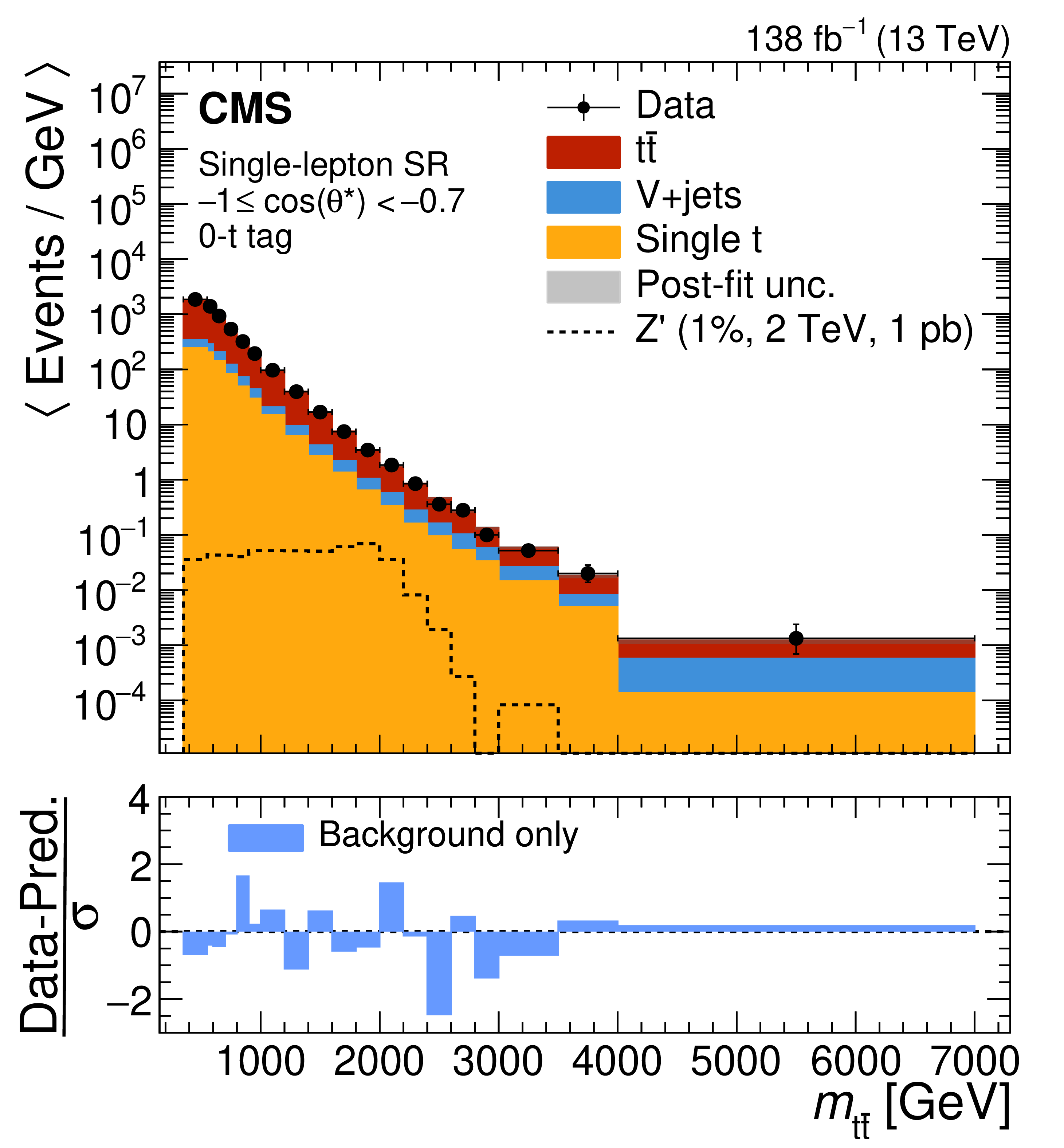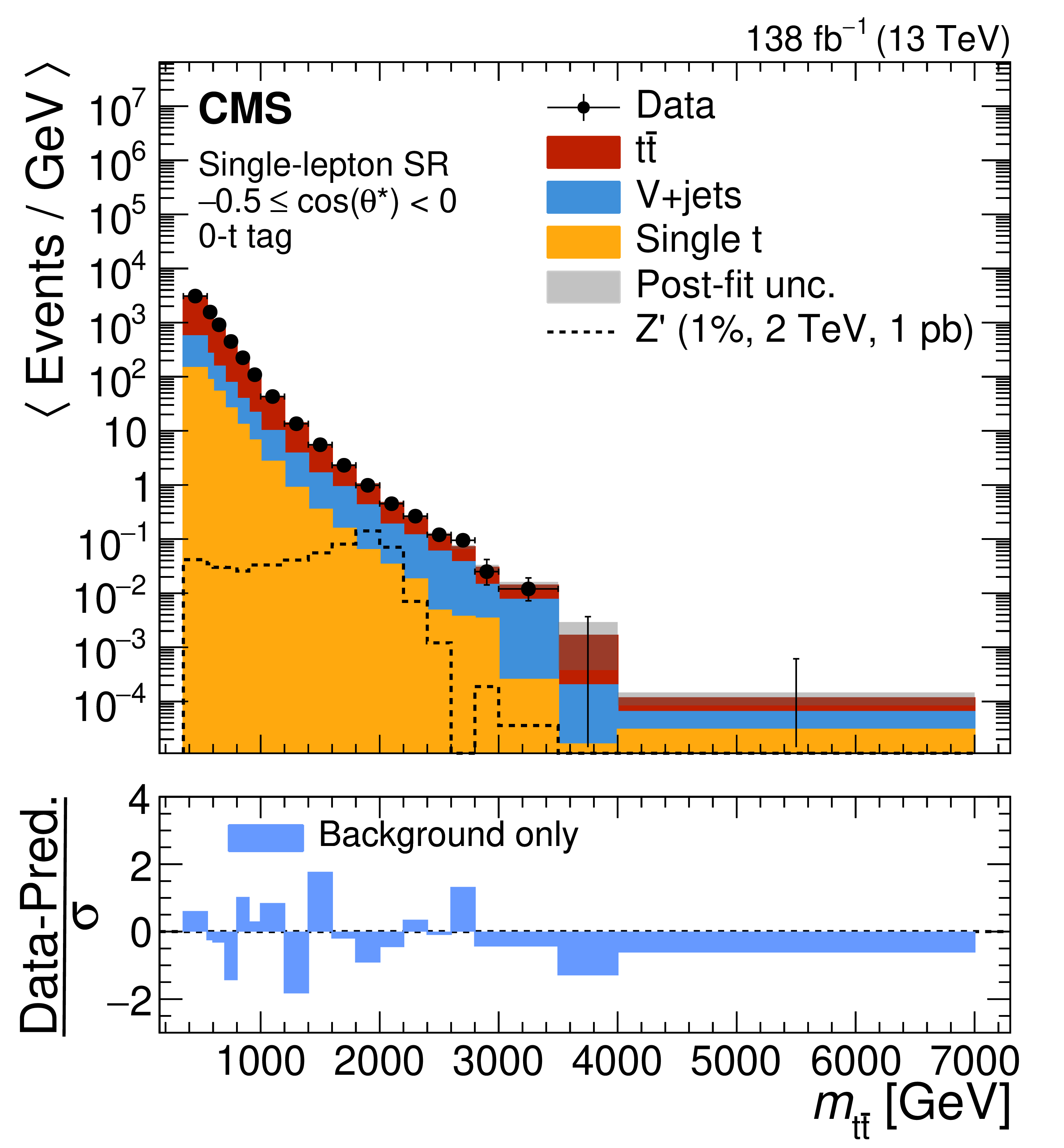 Postfit distributions in $ m_{{\mathrm{t}\overline{\mathrm{t}}} } $ in the single-lepton channel for data and simulation in the first three bins of $ \cos(\theta^\ast) $ in the $ \mathrm{t} \overline{\mathrm{t}} $ SR, shown for the resolved (0 t \text{tag}, left) and merged (1 t \text{tag}, right) categories, under the background-only hypothesis. The horizontal bars on the data points indicate the bin width. For illustrative purposes, the $ \mathrm{Z}^{'} $ boson signal with a relative width of 1% and a mass of 2 TeV is normalized to a cross section of 1\unitpb and overlaid to the backgrounds. The lower panels show the pulls, defined as ((Data-Prediction)$/\sigma $, where $ \sigma $ denotes the total postfit uncertainty in each bin, relative to the SM prediction. |