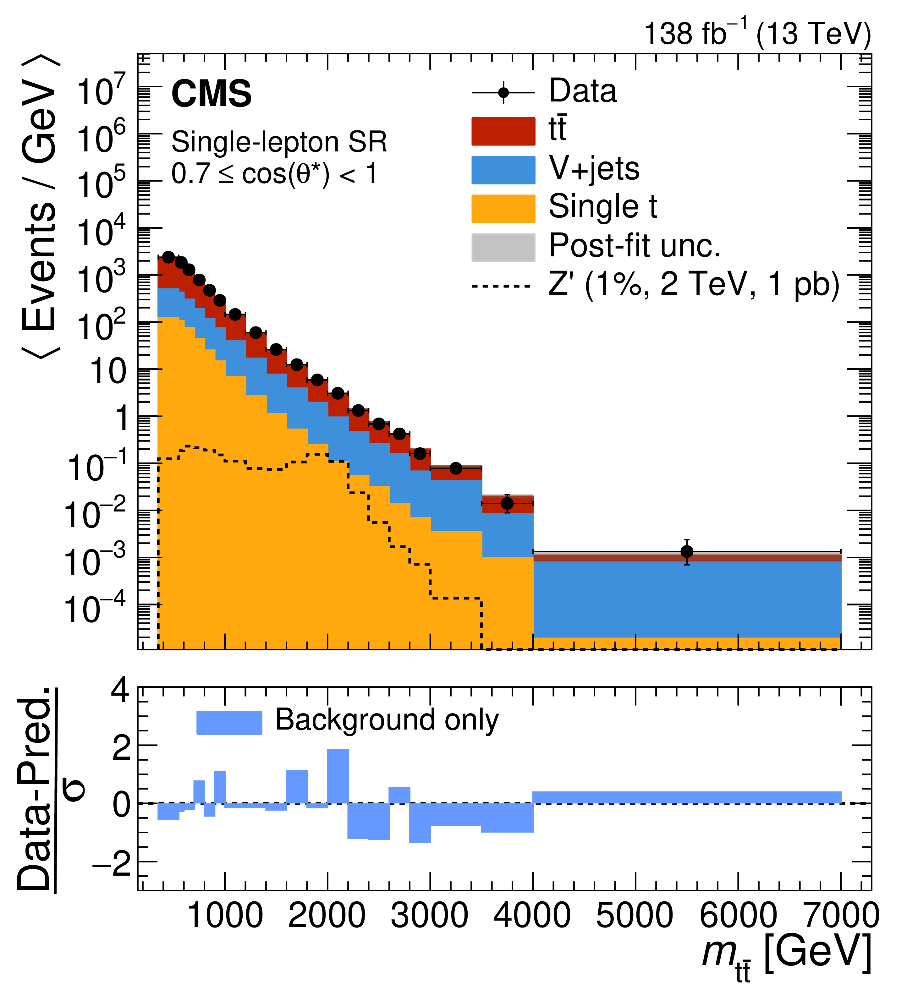 Postfit distributions in $ m_{{\mathrm{t}\overline{\mathrm{t}}} } $ in the single-lepton channel for data and simulation in the last three bins of $ \cos(\theta^\ast) $ in the $ \mathrm{t} \overline{\mathrm{t}} $ SR, shown for the resolved (0 t \text{tag}, left) and merged (1 t \text{tag}, right) categories, under the background-only hypothesis. The horizontal bars on the data points indicate the bin width. In the last two $ \cos(\theta^\ast) $ bins (lower row) the resolved and merged categories are combined. For illustrative purposes, the $ \mathrm{Z}^{'} $ boson signal with a relative width of 1% and a mass of 2 TeV is normalized to a cross section of 1\unitpb and overlaid to the backgrounds. The lower panels show the pulls, defined as (Data-Prediction)/\sigma $, where $ \sigma $ denotes the total postfit uncertainty in each bin, relative to the SM prediction. |