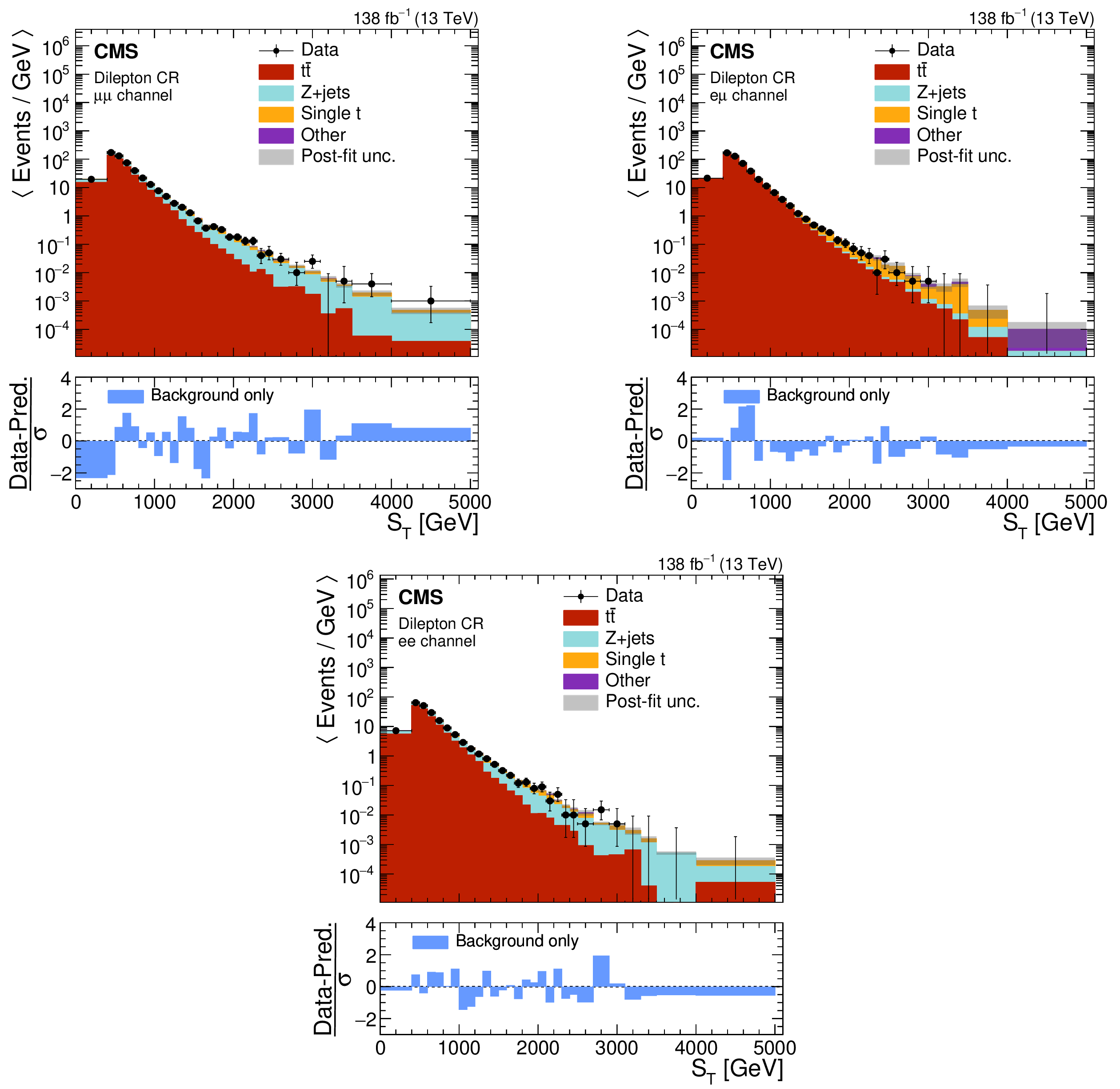Postfit distributions in $ S_{\mathrm{T}} $ for data and simulation in the CR for the dilepton channel. Distributions are shown for the $ \mu\mu $ (upper left), $ \mathrm{e}\mu $ (upper right), and $ \mathrm{e}\mathrm{e} $ (lower) channels, under the background-only hypothesis. The horizontal bars on the data points indicate the bin width. The lower panels show the pulls, defined as (Data-Prediction)$/\sigma$, where $\sigma$ denotes the total postfit uncertainty in each bin, relative to the SM prediction. |