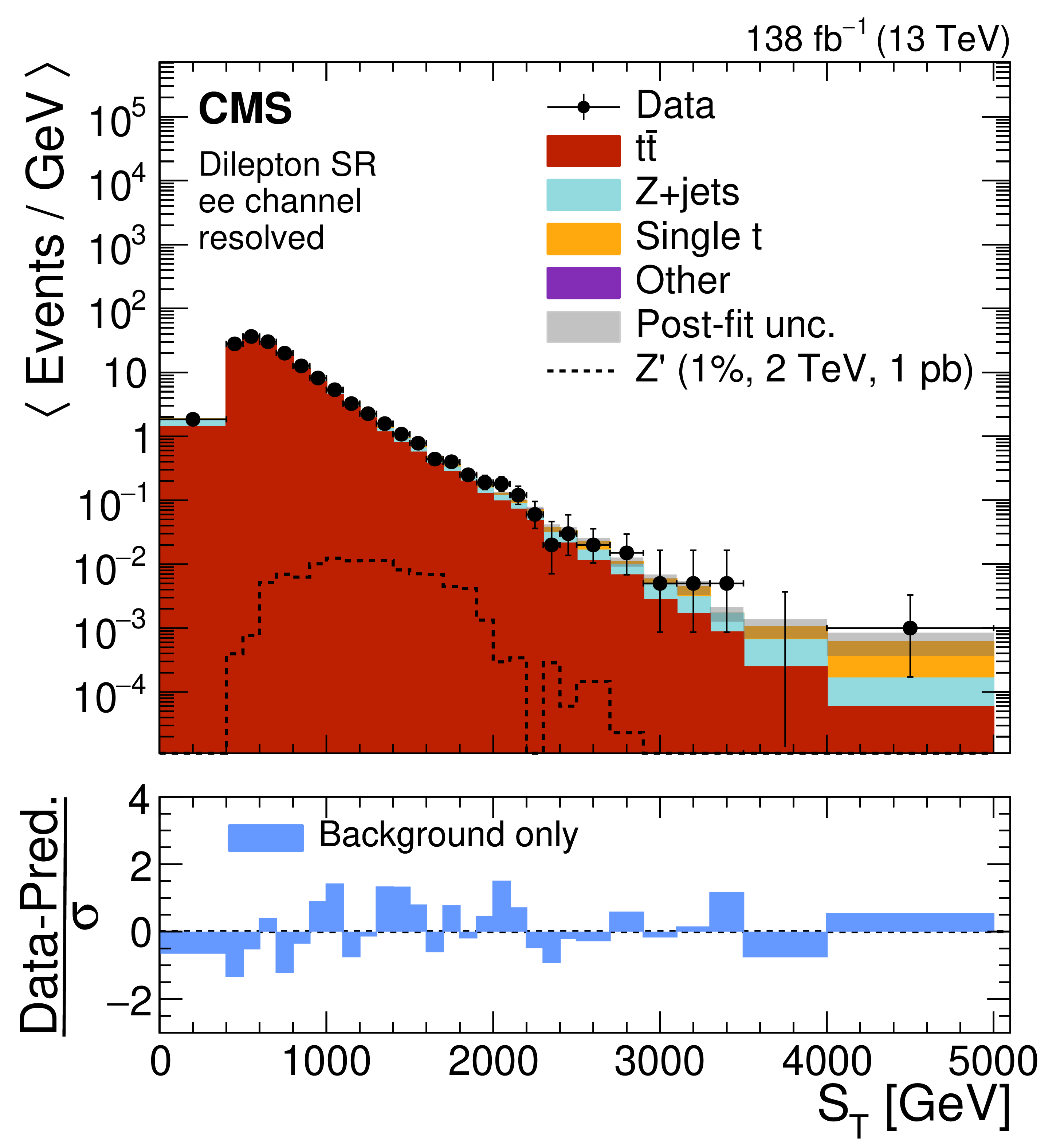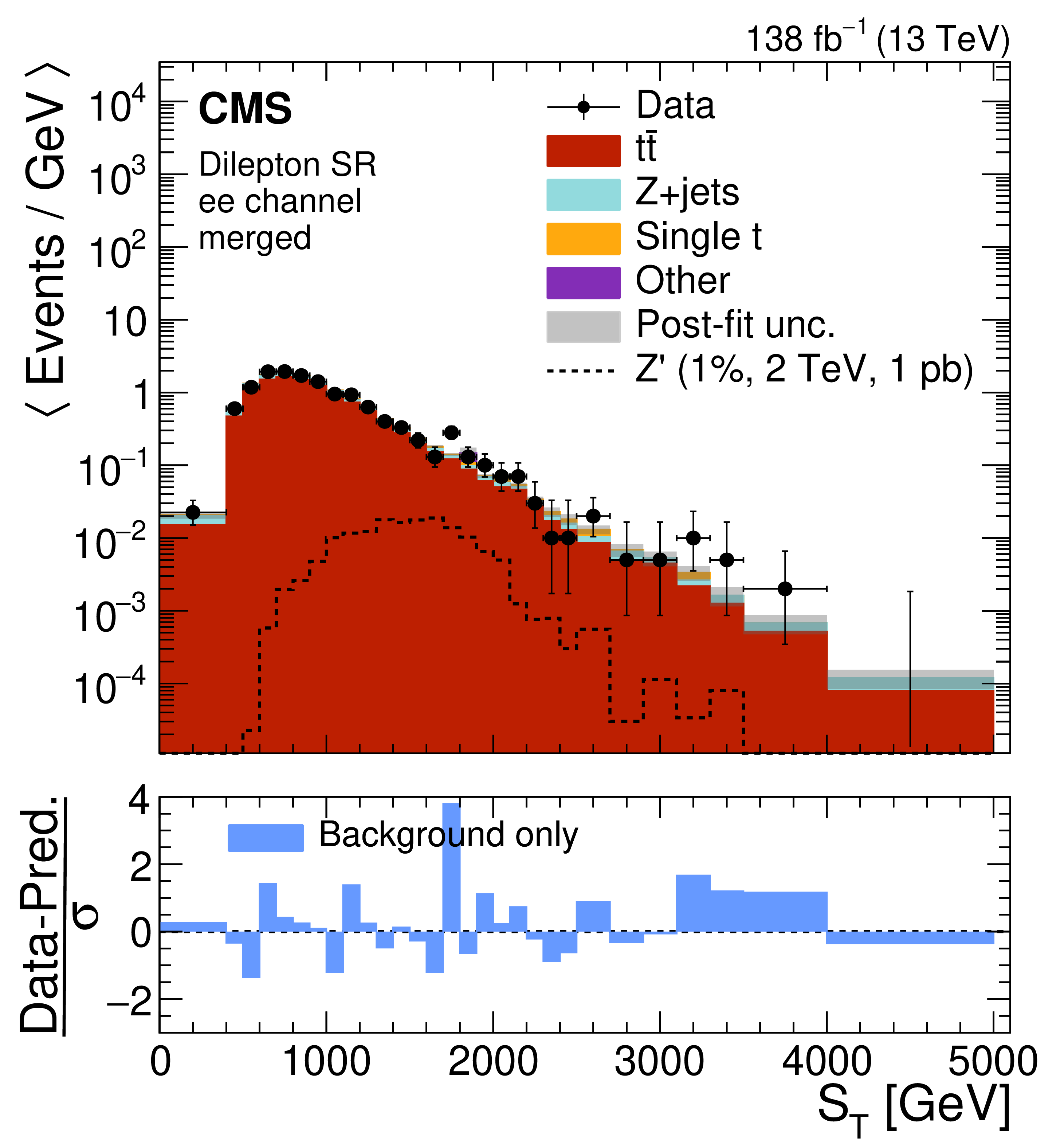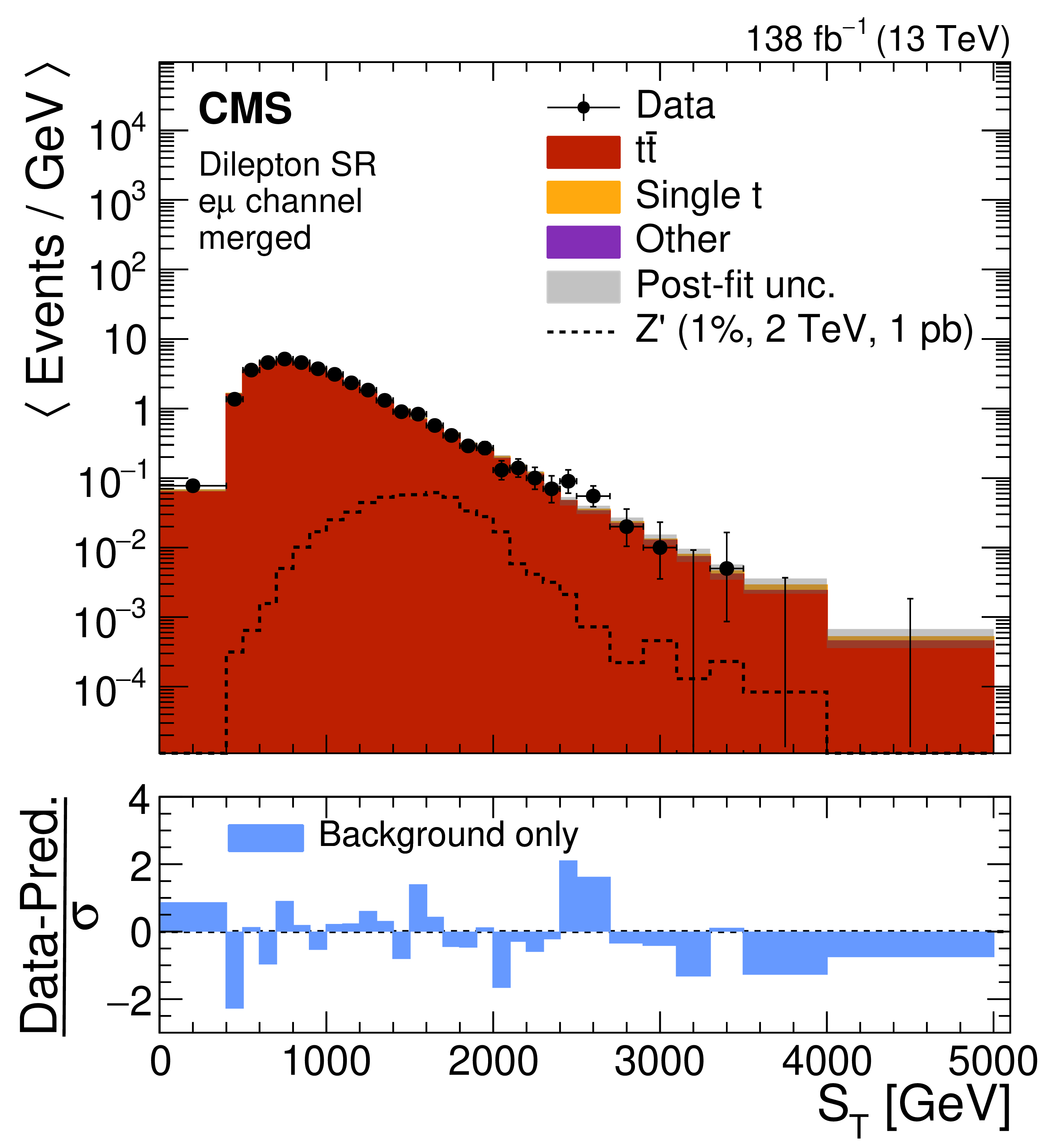 Postfit distributions in $ S_{\mathrm{T}} $ for data and simulation for the resolved (left) and merged (right) categories for the dilepton channel. Distributions are shown for the $ \mu\mu $ (upper), $ \mathrm{e}\mu $ (middle), and $ \mathrm{e}\mathrm{e} $ (lower) channels, under the background-only hypothesis. The horizontal bars on the data points indicate the bin width. For illustrative purposes, the $ \mathrm{Z}^{'} $ boson signal with a relative width of 1% and a mass of 2 TeV is normalized to a cross section of 1 pb and overlaid to the backgrounds. The lower panels show the pulls, defined as (Data-Prediction)$/\sigma$, where $ \sigma$ denotes the total postfit uncertainty in each bin, relative to the SM prediction. |