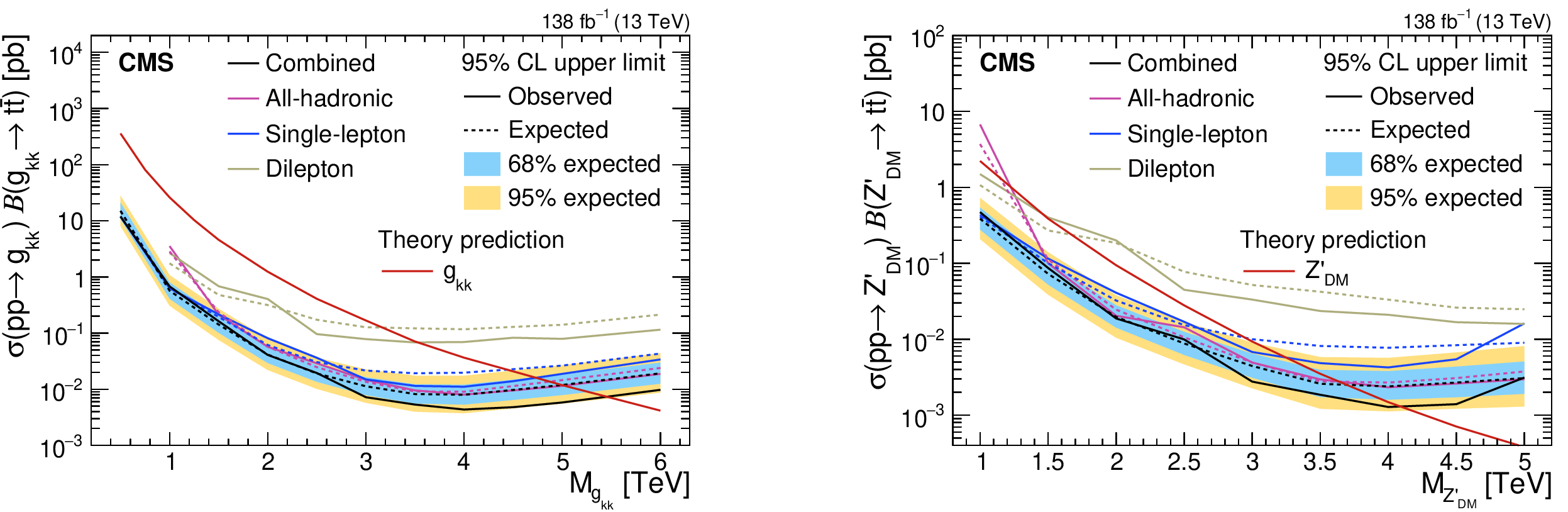 Expected and observed upper limits at 95% CL on the product of the production cross section and branching fraction as functions of the resonance mass. The limits are shown for the Kaluza--Klein gluon (left) and dark matter (right) scenarios. In each panel we plot the expected combined upper limit on the signal strength times branching fraction (black dashed line) together with the 68 (light blue) and 95% (yellow) uncertainty bands, and the corresponding observed upper limit (black solid line). The expected (dashed lines) and observed (solid lines) limits from the individual channels are overlaid: all-hadronic (purple), single-lepton (blue), and dilepton (light brown). The limits are compared with the respective theory predictions shown by the solid red curves. |