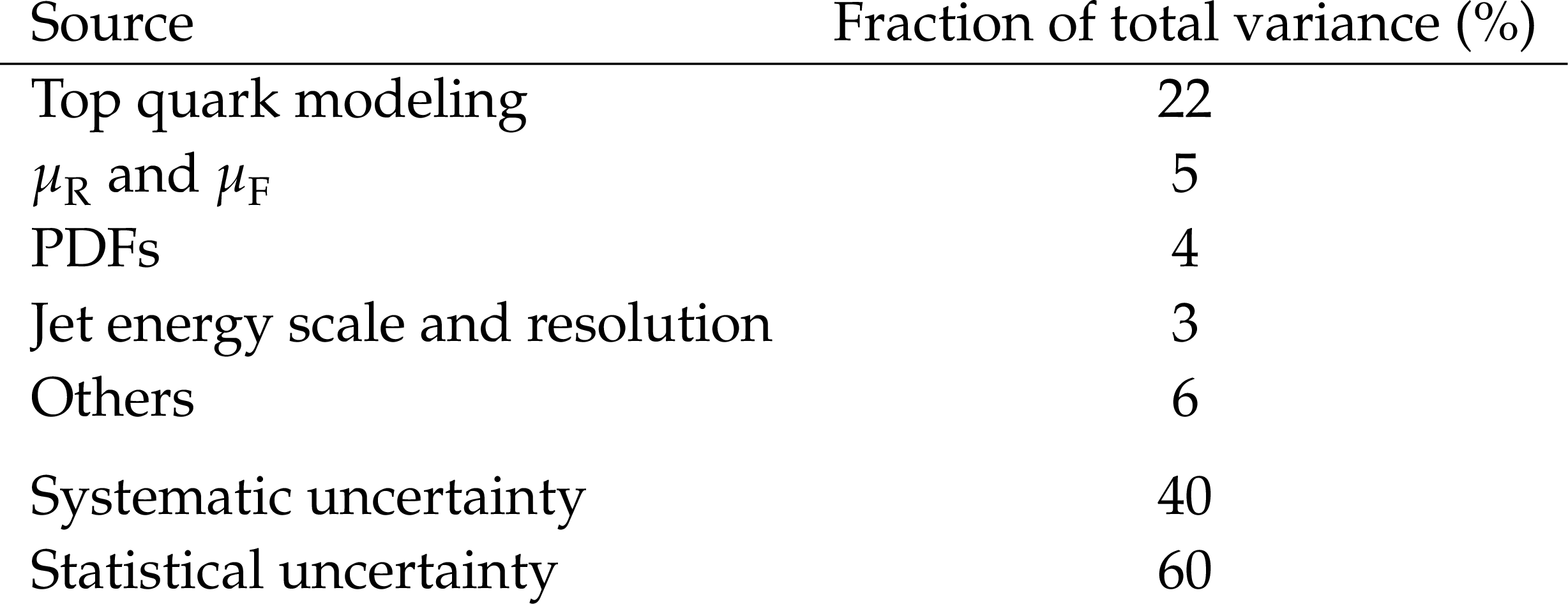 Relative contribution of the dominant sources of uncertainty to the total variance of the upper limits. The benchmark scenario corresponds to a $ \mathrm{Z}^{'} $ signal with a 1% relative width and a mass of 2 TeV. The top-quark modeling category includes nuisance parameters associated with the $ \mathrm{t} \overline{\mathrm{t}} $ production rate, $ \mathrm{t}\text{ tagging} $ efficiency, $ \mathrm{t}\text{ tagging} $ mistag rate, and modeling of the $ \mathrm{t} \overline{\mathrm{t}} $ transverse momentum spectrum. |