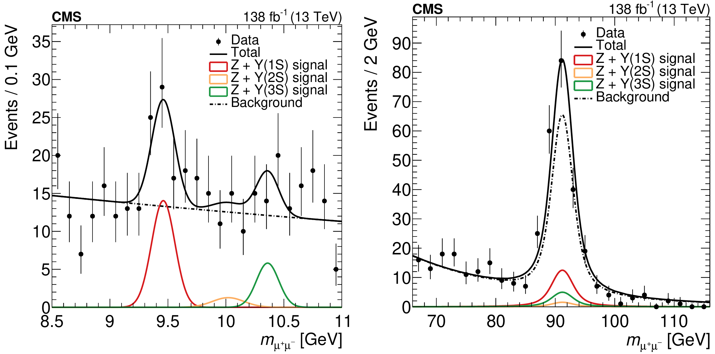 Dimuon invariant mass distributions for the $ \Upsilon\mathrm{(nS)}$ (left) and Z (right) candidates. In each panel, the data are represented by points, with vertical bars indicating the statistical uncertainties. The solid black curve is the overall fit to data. The red, yellow, and green curves correspond to the signal yields for the three $ \Upsilon\mathrm{(nS)} $ states, while the dash-dotted curve represents the background. |