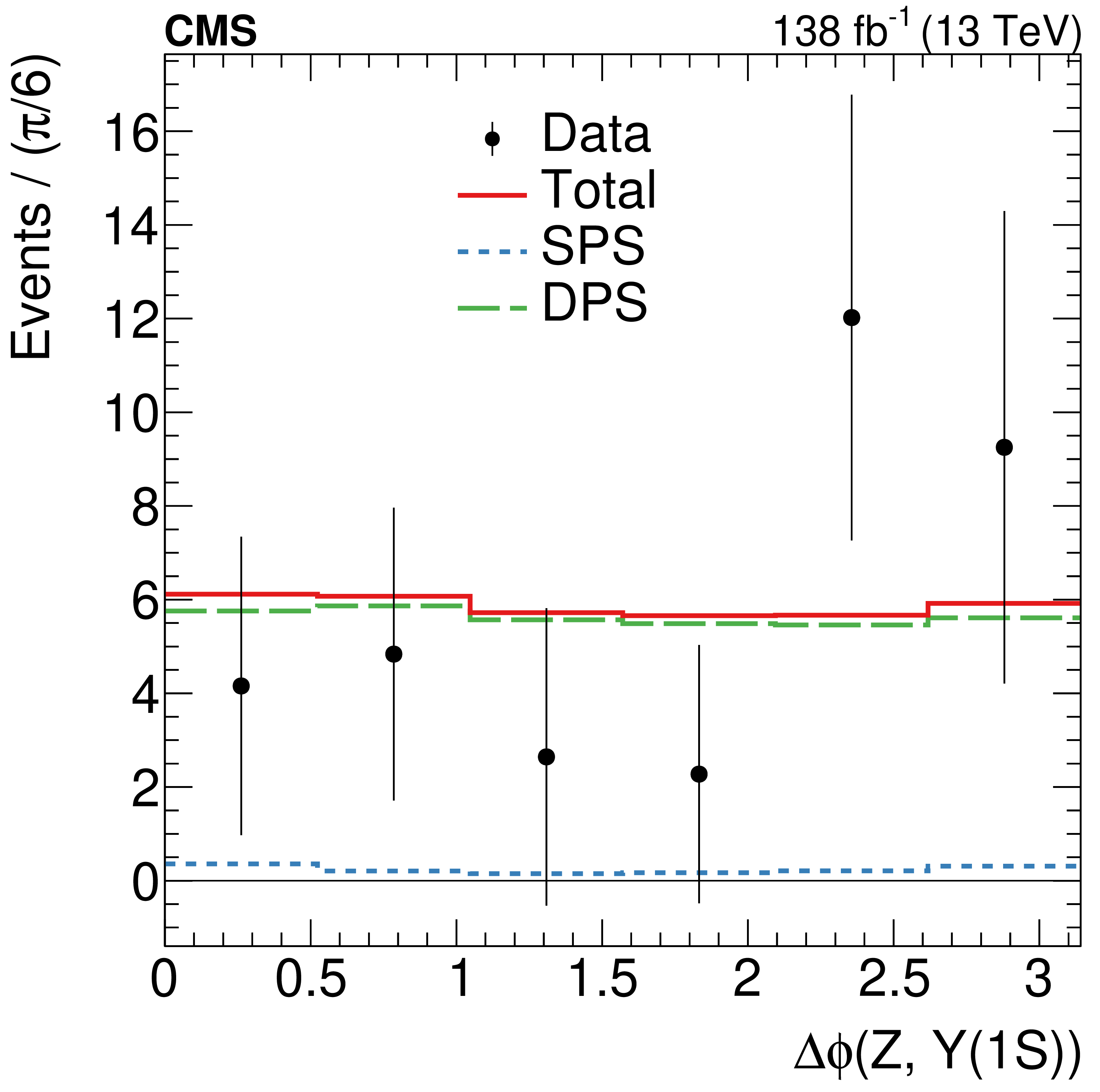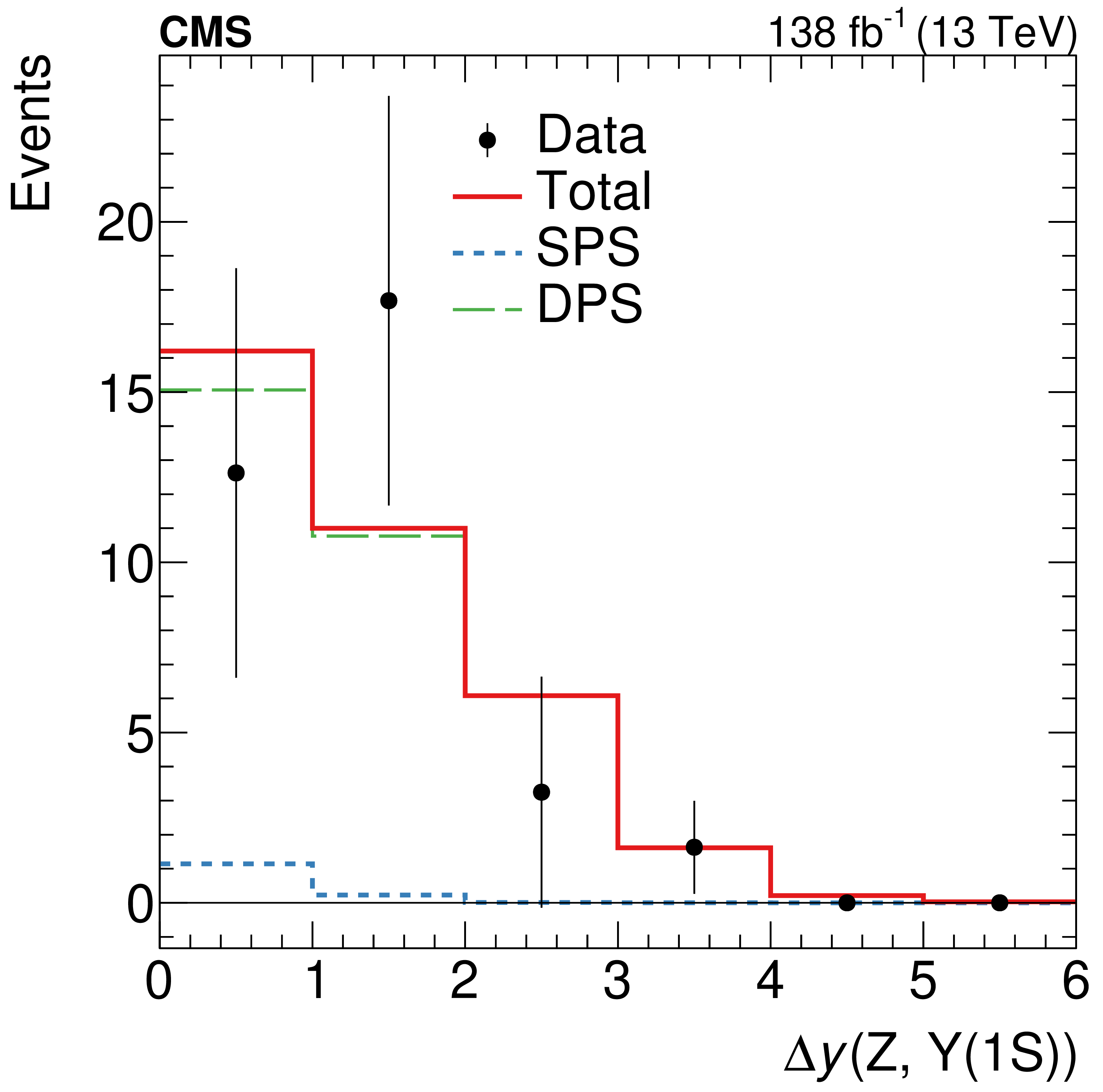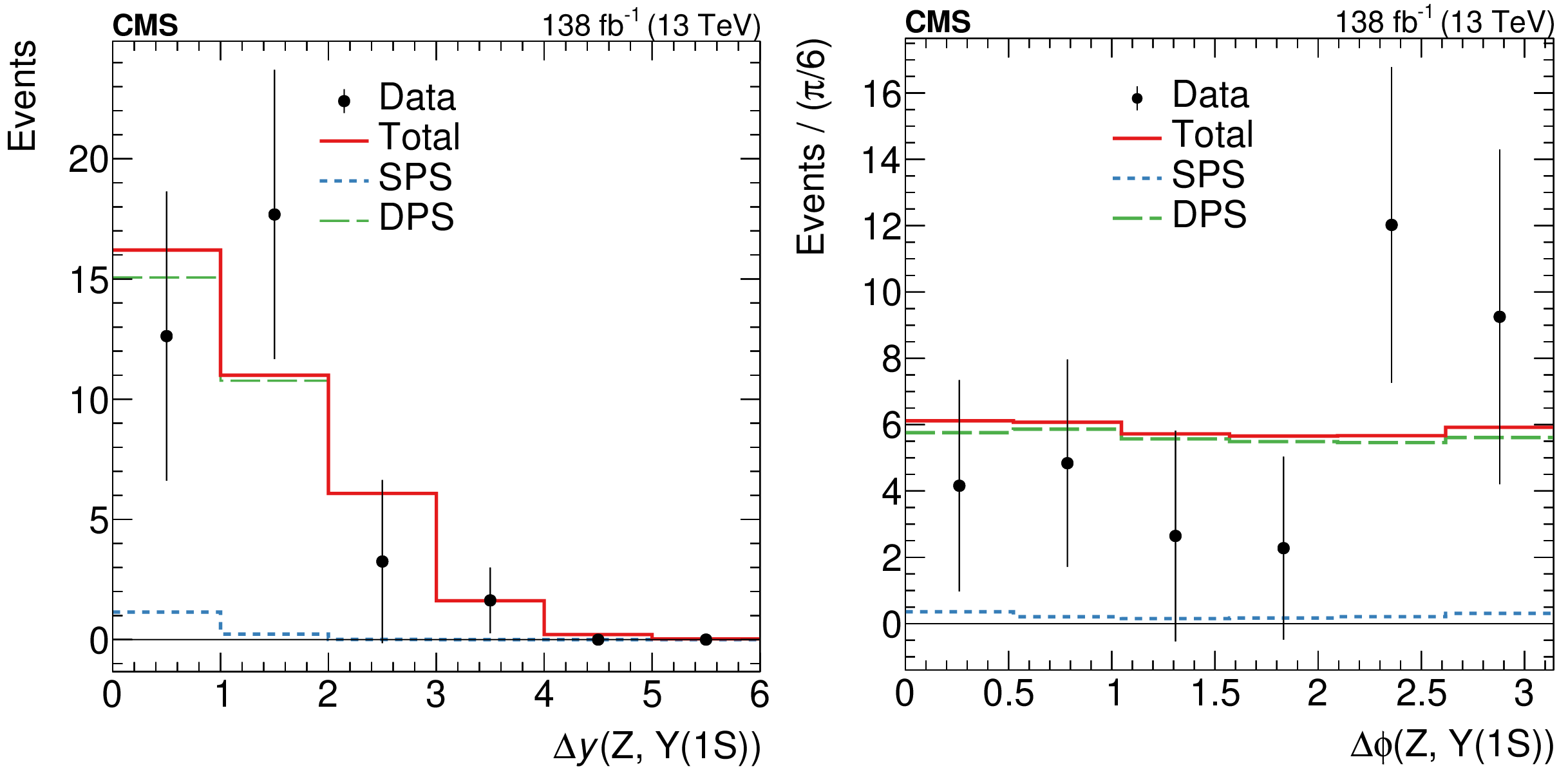 Distributions of the $ \Delta y $ (left) and $ \Delta\phi $ (right) separations between the $ \Upsilon\mathrm{(1S)} $meson and the Z boson in data (black points with vertical bars indicating the statistical uncertainties), and the extracted DPS (green histogram), SPS (blue histogram), and SPS+DPS (red histogram) contributions from the template fit to data. The distributions and corresponding uncertainties are obtained after the application of $\textit{sPlot} $ weights from an unbinned template fit to the $ \Delta y $ and $ \Delta\phi $ variables. |