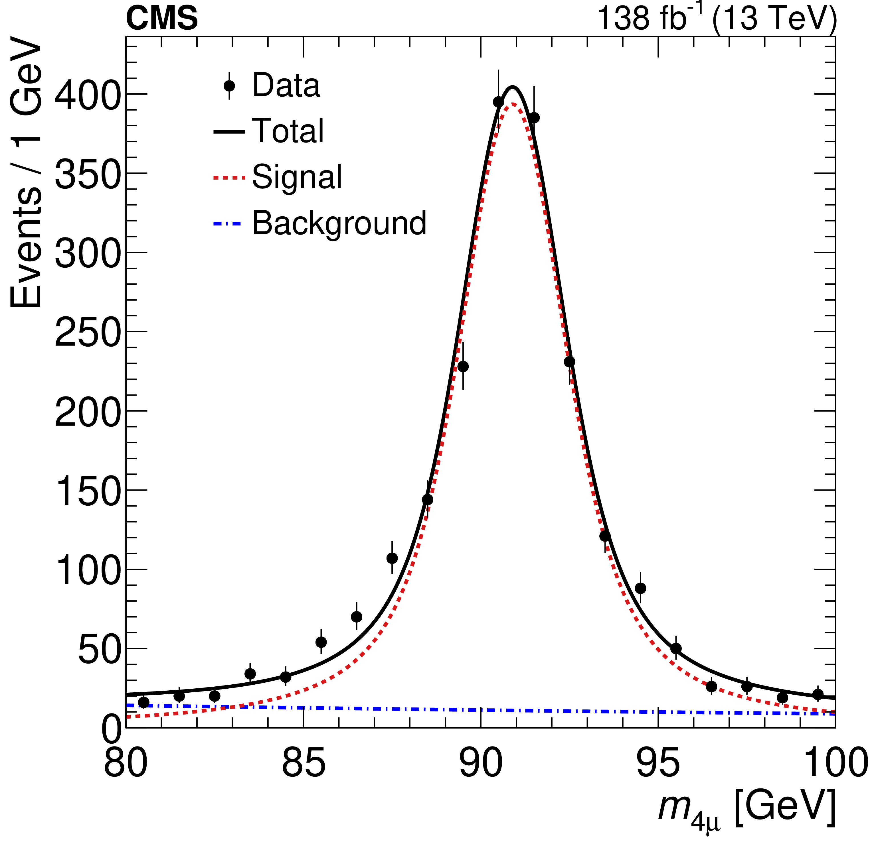 The $ m_{4\mu} $ distribution in the normalization channel with vertical bars on the data points indicating the statistical uncertainties. The result of the full fit is shown with the solid black line, while the signal and background components are shown with the dashed red and dash-dotted blue lines, respectively. |