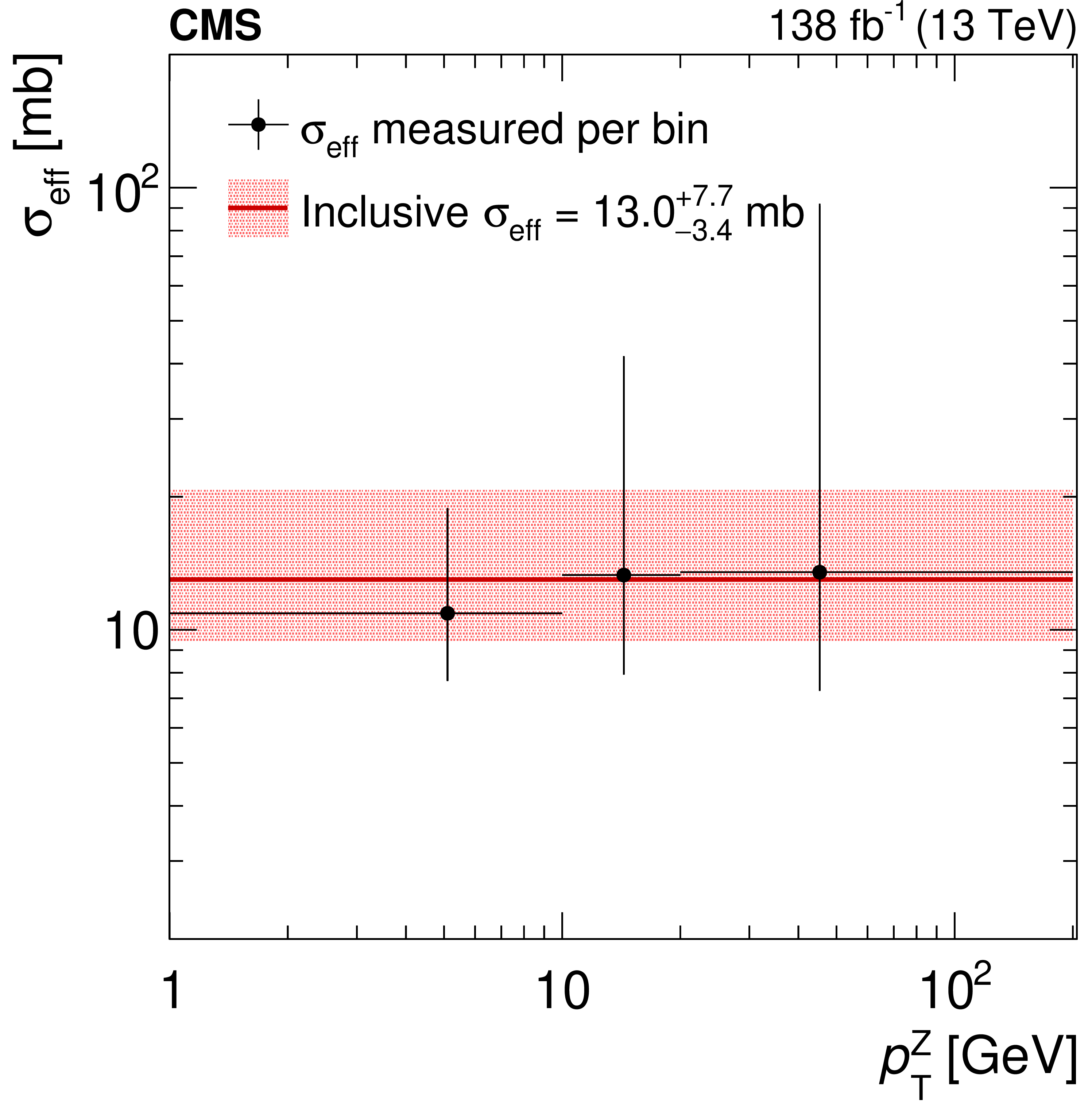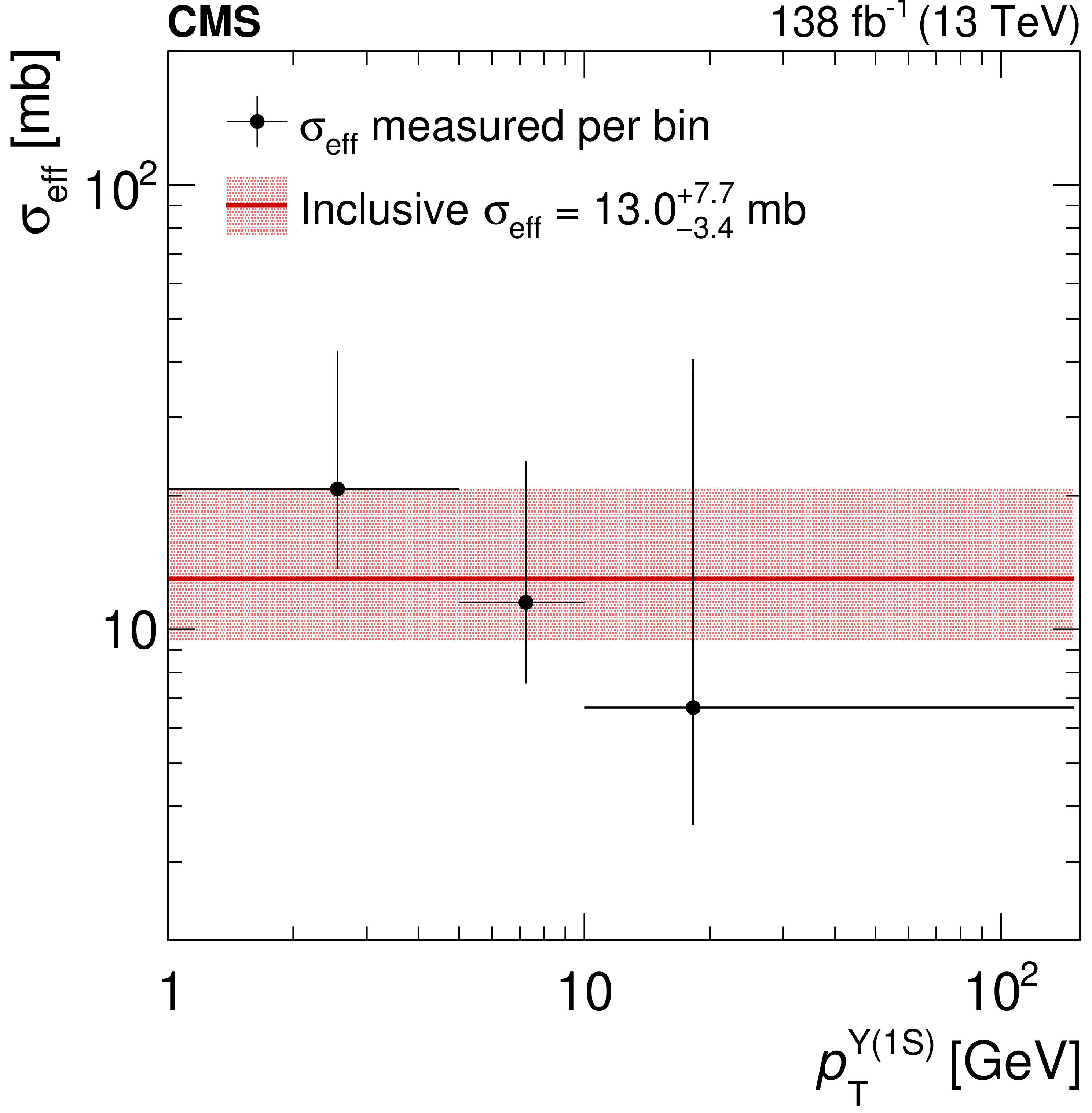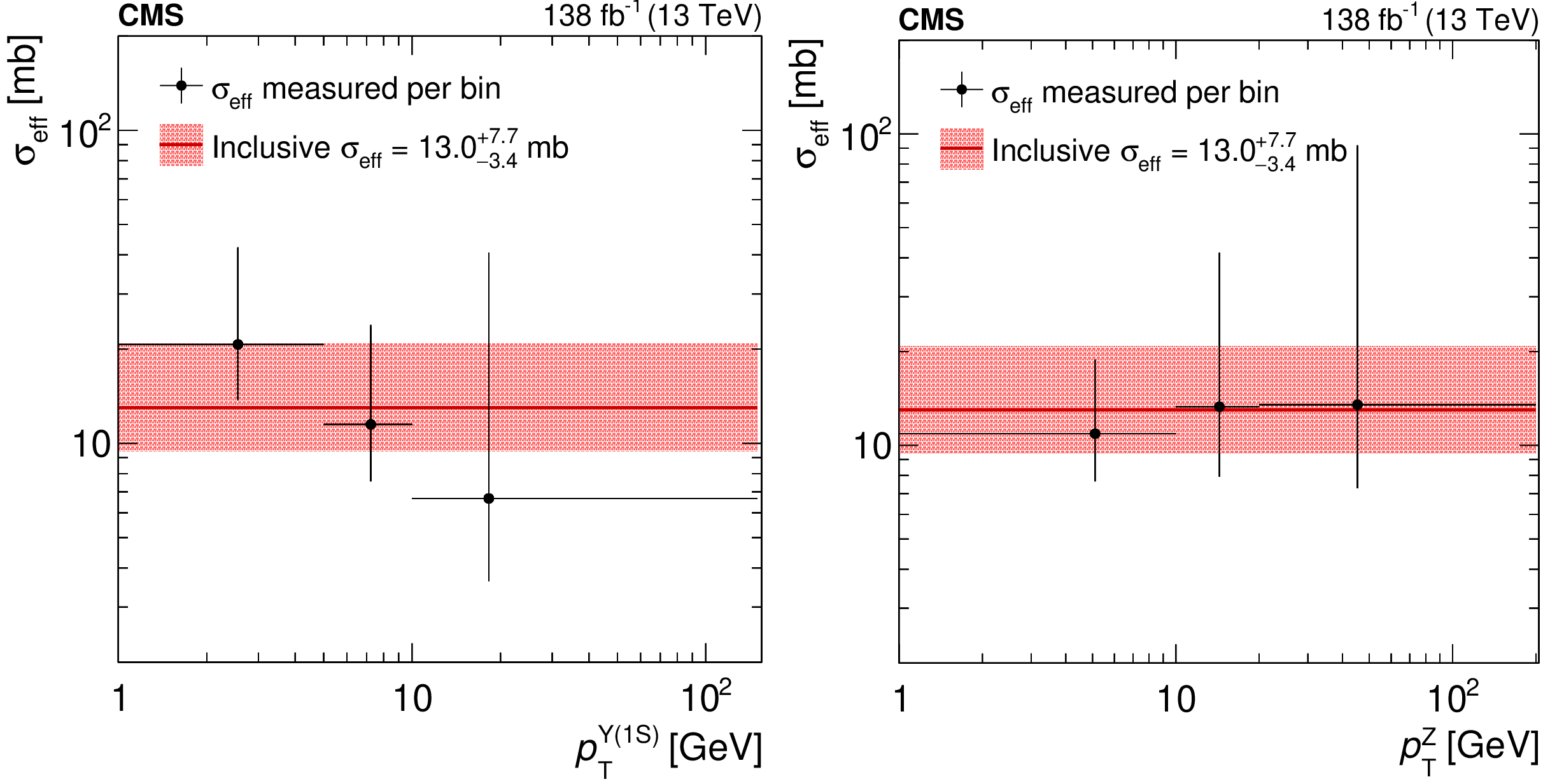 Measurements of $ \sigma_\text{eff} $ in bins of the $ \Upsilon\mathrm{(1S)} $meson (left) and Z boson (right) $ p_{\mathrm{T}} $. The data are represented by the points with the black vertical bars showing the total uncertainties, which are dominated by the statistical uncertainty. The horizontal bars represent the bin widths, and the $ x $ axis position of each marker corresponds to the weighted average of the $ p_{\mathrm{T}} $ distribution within the respective bin. The red line indicates the nominal value found for the inclusive $ \sigma_\text{eff} $, and the pink shaded region shows its total uncertainties. |