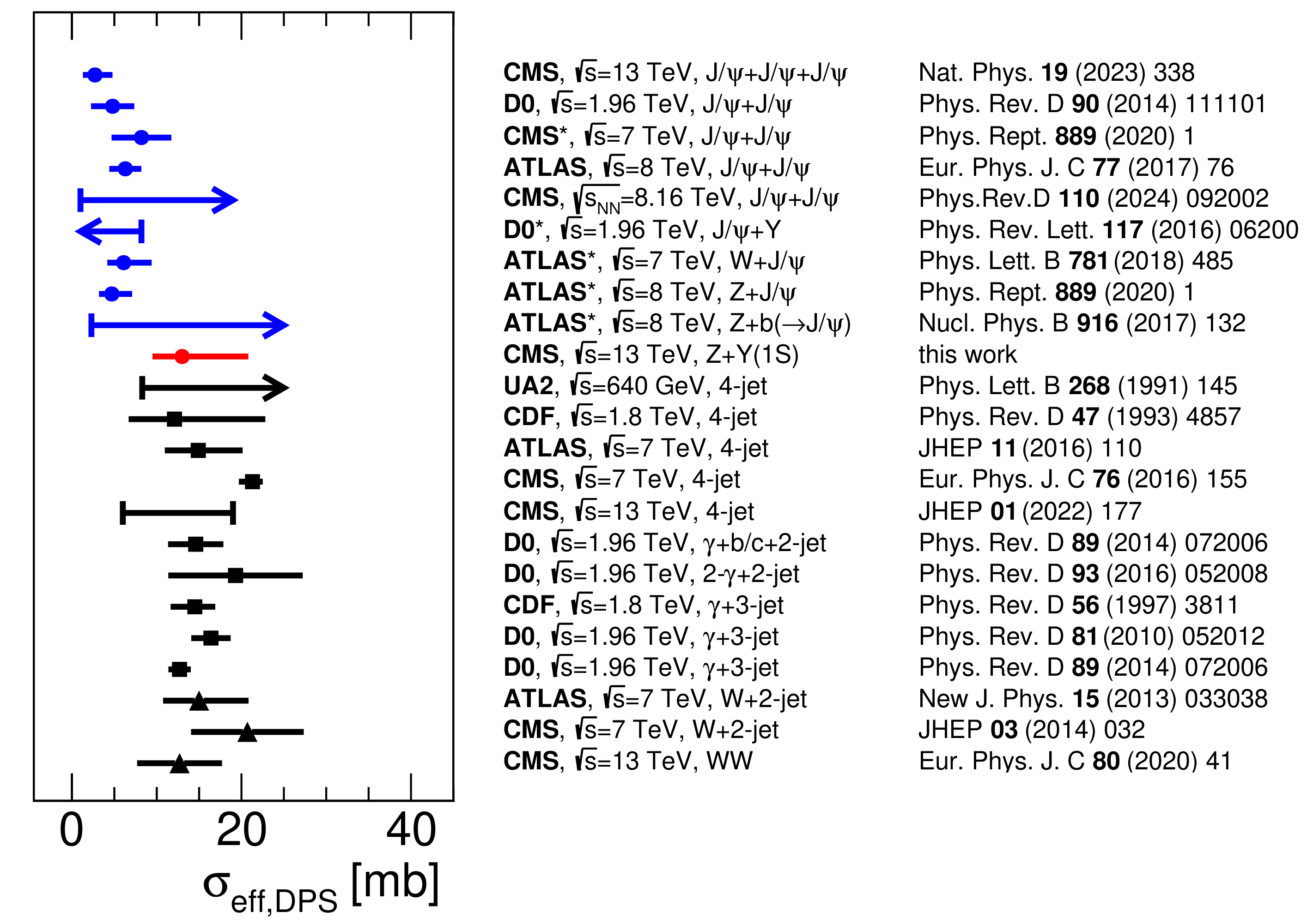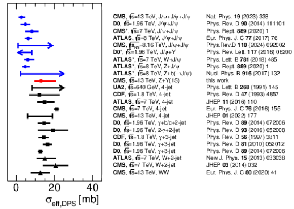 A summary of $ \sigma_\text{eff} $ results measured using quarkonia (blue) and harder objects (black). The present result is shown in red. Arrows indicate that only the lower limits on $ \sigma_\text{eff} $ are available. The error bar without the central value corresponds to a range of $ \sigma_\text{eff} $ extractions using different MC models from a CMS 4-jet analysis [67]. For the results marked with an asterisk, more recent theoretical reinterpretations based on improved calculations of the corresponding SPS cross section are plotted. |