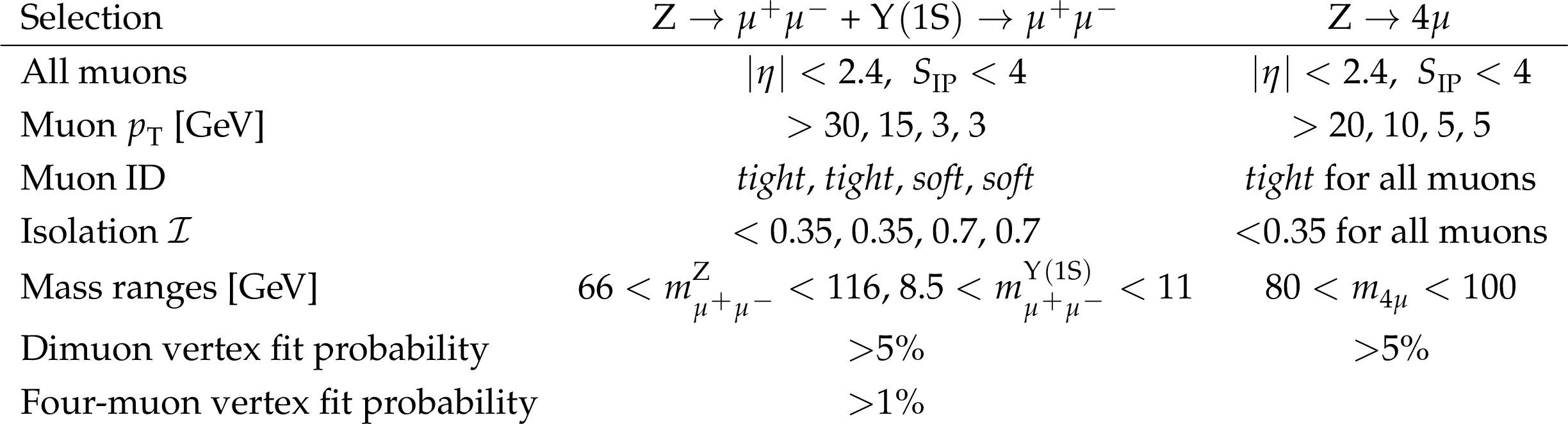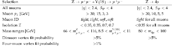 Summary of selection criteria applied to the signal $ \mathrm{Z}(\to\mu^{+}\mu^{-}) + \Upsilon{\textrm{(1\mathrm{S})}}(\to\mu^{+}\mu^{-}) $ and normalization $ \mathrm{Z}\to4\mu $ channels. The ``$ \text{---} $'' sign means that the selection is not applied. |