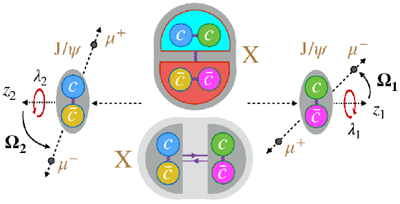{Internal structure models for the particle $ \mathrm{X} $.} The particle $ \mathrm{X} $, composed of $ {\mathrm{c}}{\mathrm{c}}{\overline{\mathrm{c}}}{\overline{\mathrm{c}}} $, is shown at rest. Two models of the internal structure of $ \mathrm{X} $ are presented: a tightly-bound tetraquark (upper) and a loosely-bound molecule of two mesons (lower). The colours assigned to individual quarks or quark pairs denote possible colour charge assignments in strong interactions, where attractive forces are mediated by gluon exchange (shown as wavy lines) and meson exchange (shown as a solid pair of arrows). The $ \mathrm{X} $ decays into two $ \mathrm{J}/\psi $ mesons with spin projections $ \lambda_i $ along their respective directions of motion; each meson then decays into a $ \mu^{+}\mu^{-} $ pair. The polar and azimuthal angles $ \mathbf{\Omega}_{i}=(\theta_{i}, \Phi_{i}) $ describe the direction of the $ \mu^{-} $ relative to the $ z_i $ axis, which is defined to point opposite to the $ \mathrm{X} $ direction in the centre-of-mass frame of the corresponding $ \mathrm{J}/\psi $ meson, for $ i = $ 1 and 2. |