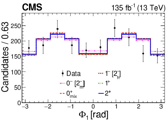 Angular distributions. Distribution of the decay angles: $ \Phi $ (upper row), $ \cos\theta_1, \cos\theta_2 $ (second row), production angles defined with respect to axis $ z $: $ \Phi_1, \cos\theta^* $ (third row), and defined with respect to axis $ z' $: $ \Phi_1', \cos\theta^{\prime *} $ (lower row) in the range 6.2 $ < m_{4\mu} < $ 8.0 GeV presented together with the five $ J^P_i $ signal models. The background is subtracted from the data, based on the expected distributions, and systematic uncertainties are not incorporated in these plots. The $ 0^{-} $ and 2 $ _m^{-} $ distributions are identical, as are those of $ 1^{-} $ and 2 $ _h^{-} $. |