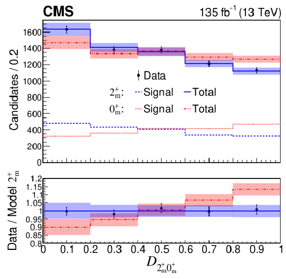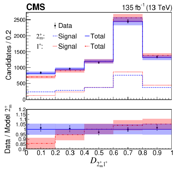 Optimal observables. Distributions of $ \mathcal{D}_{ij} $ that are optimal for separating the 2 $ _{m}^+ $ model against the 0 $ _{m}^+ $ (upper left), 0 $ _{h}^+ $ (upper right), $ 1^- $ (lower left), and $ 1^+ $ (lower right) models in the range 6.2 $ < m_{4\mu} < $ 8.0 GeV. Distributions for signal only (dashed) and for signal plus background (solid and dash-dot-dotted) models are compared to the experimental data points with error bars, with uncertainty bands representing post-fit model uncertainties, which are partially correlated with the data. The $ 1^{-} $ and 2 $ _h^{-} $ distributions are identical, apart from systematic uncertainties arising from polarization effects. The lower panels display the ratios of the data and of the model predictions to the mean expectations from the 2 $ _{m}^+ $ model. |
