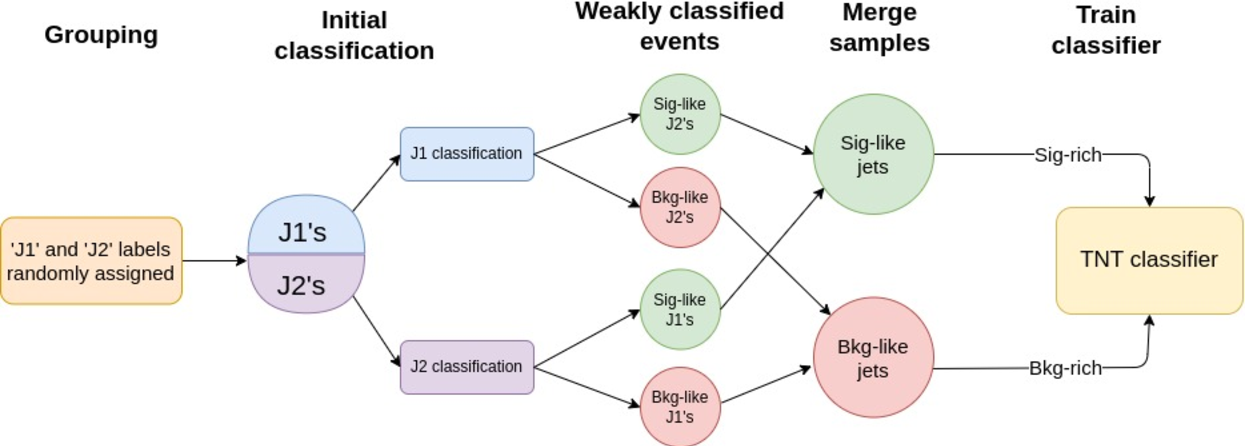 A flowchart outlining how the samples for the weakly supervised training were constructed in the TNT method. The two jets in the dijet candidate were randomly assigned labels J1 and J2. For each event, the J1 (J2) jet is placed into either a signal-like or background-like sample based on the autoencoder scores evaluated on the J2 (J1) jet. The samples of signal-like (background-like) J1's and signal-like (background-like) J2's were merged together to construct a single sample of signal-like (background-like) jets. The TNT classifier is then trained to distinguish between these two samples. |