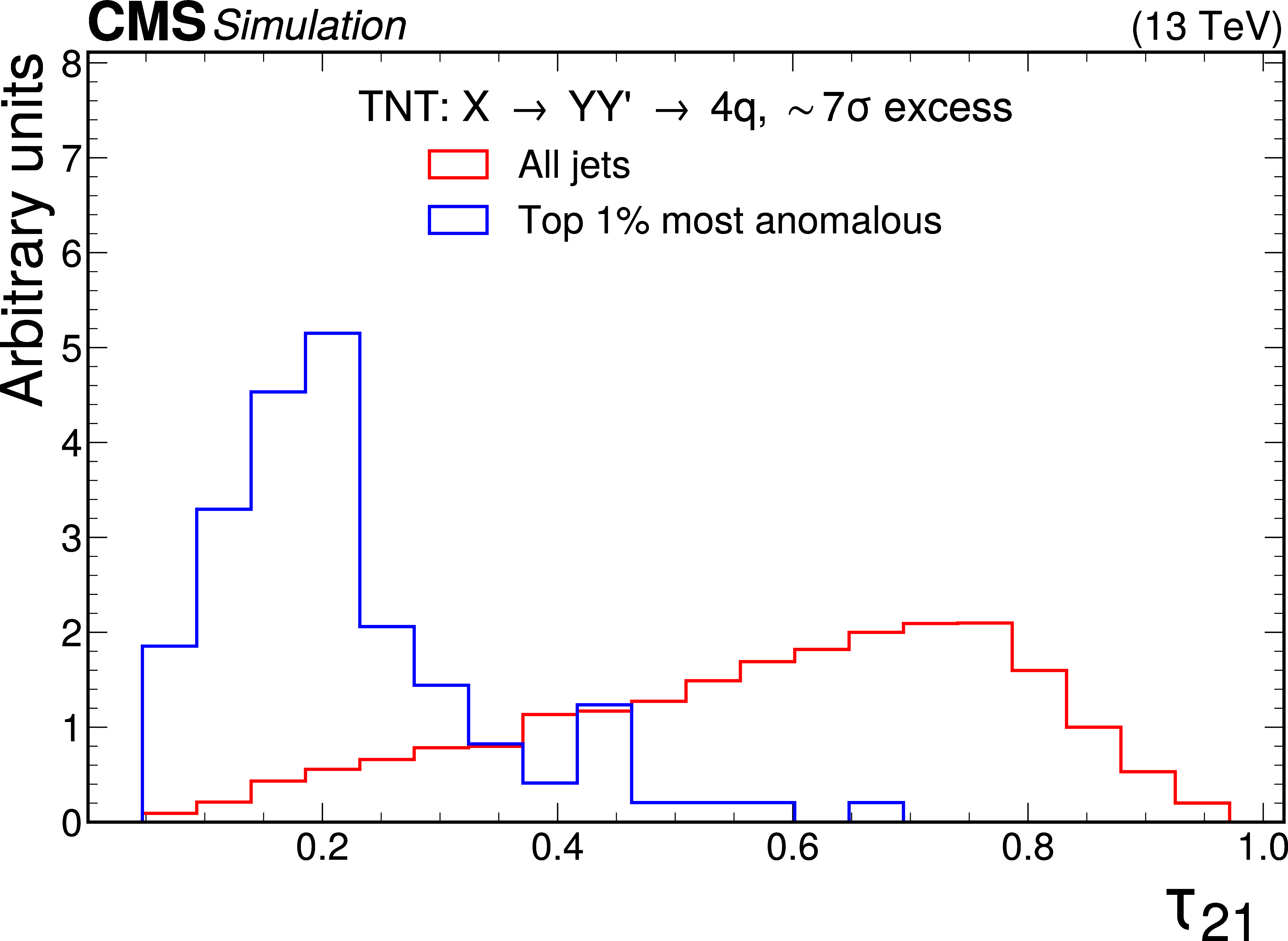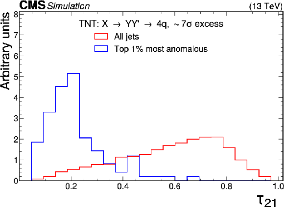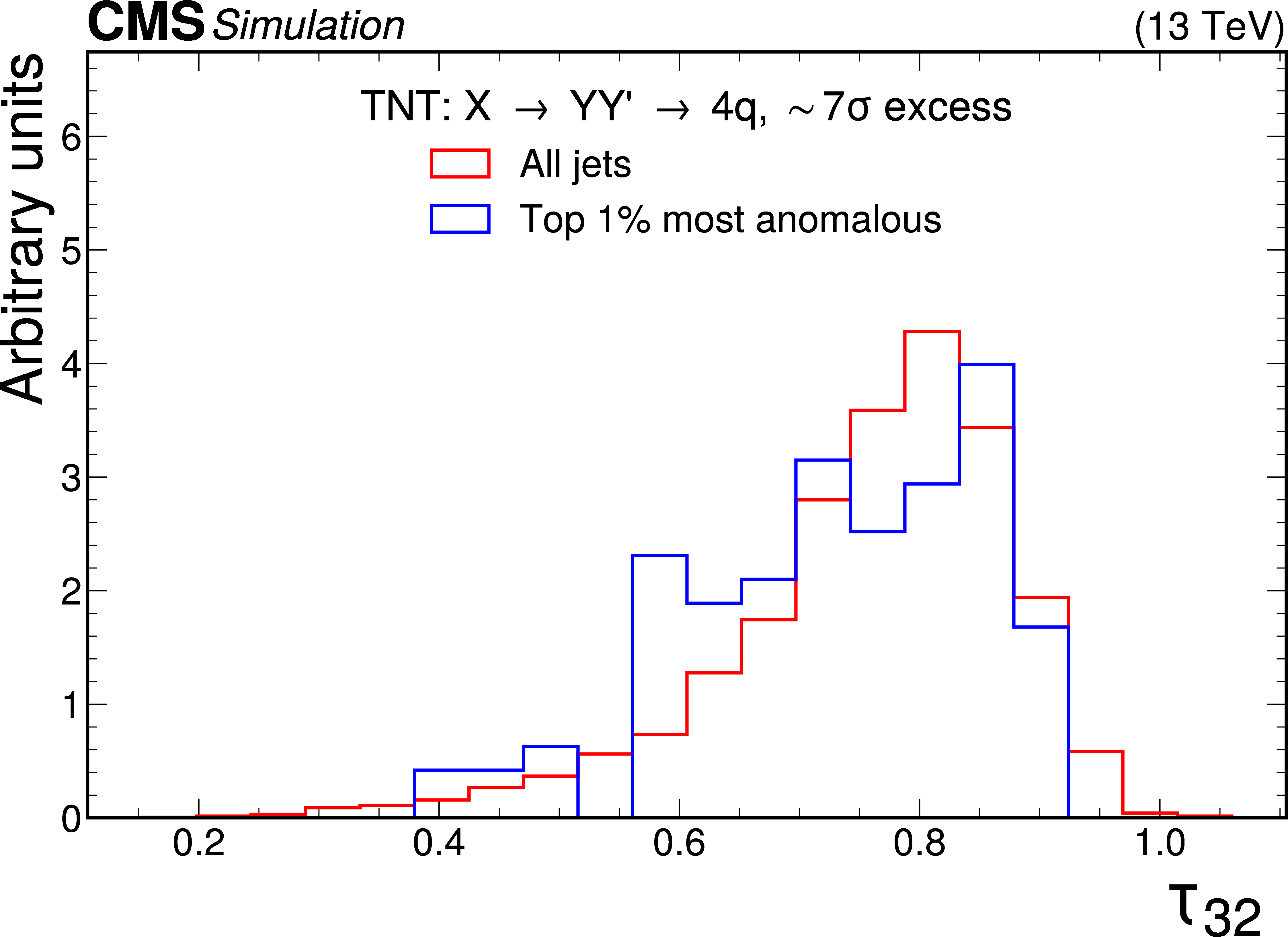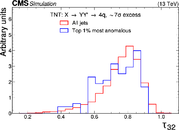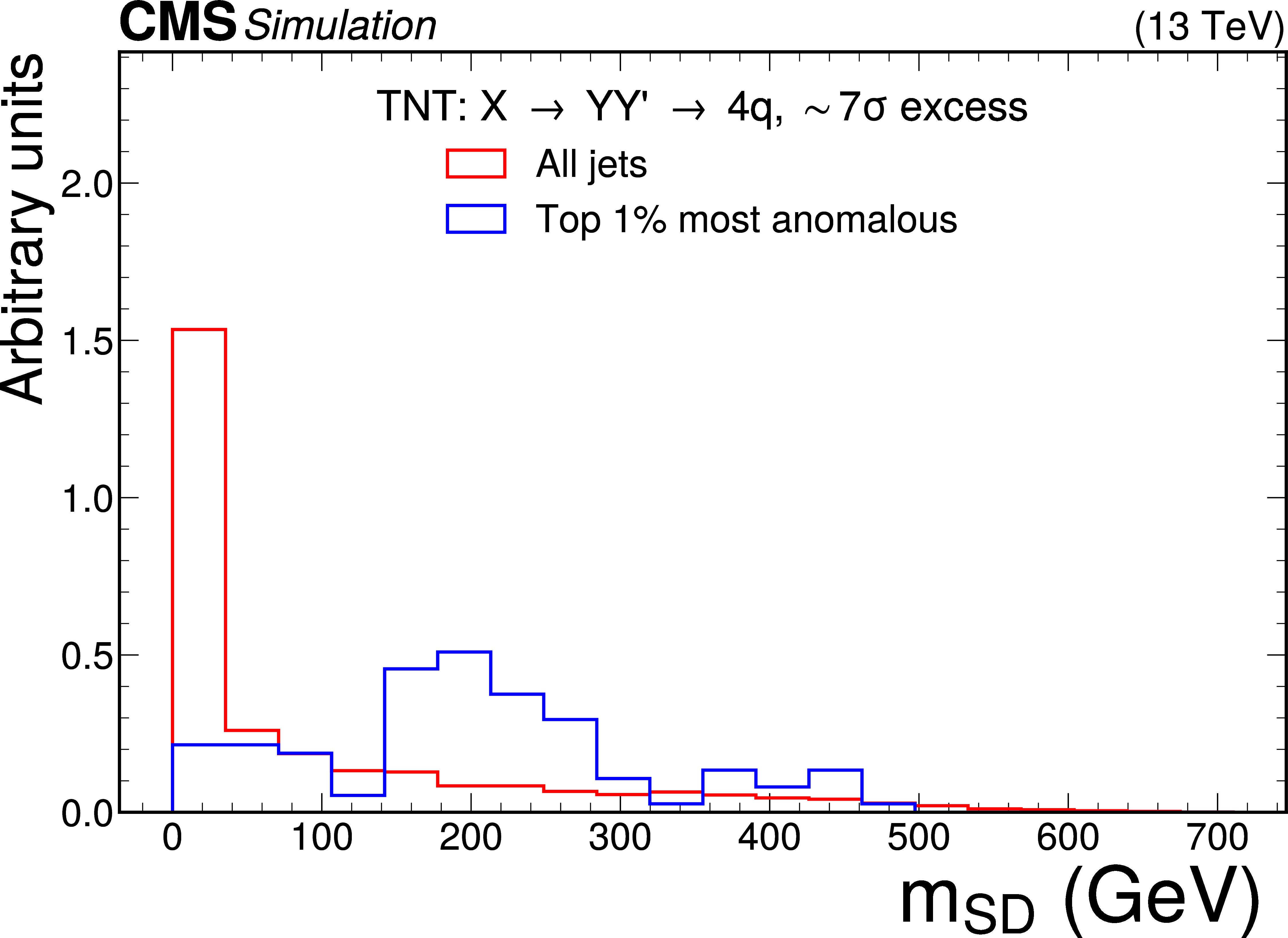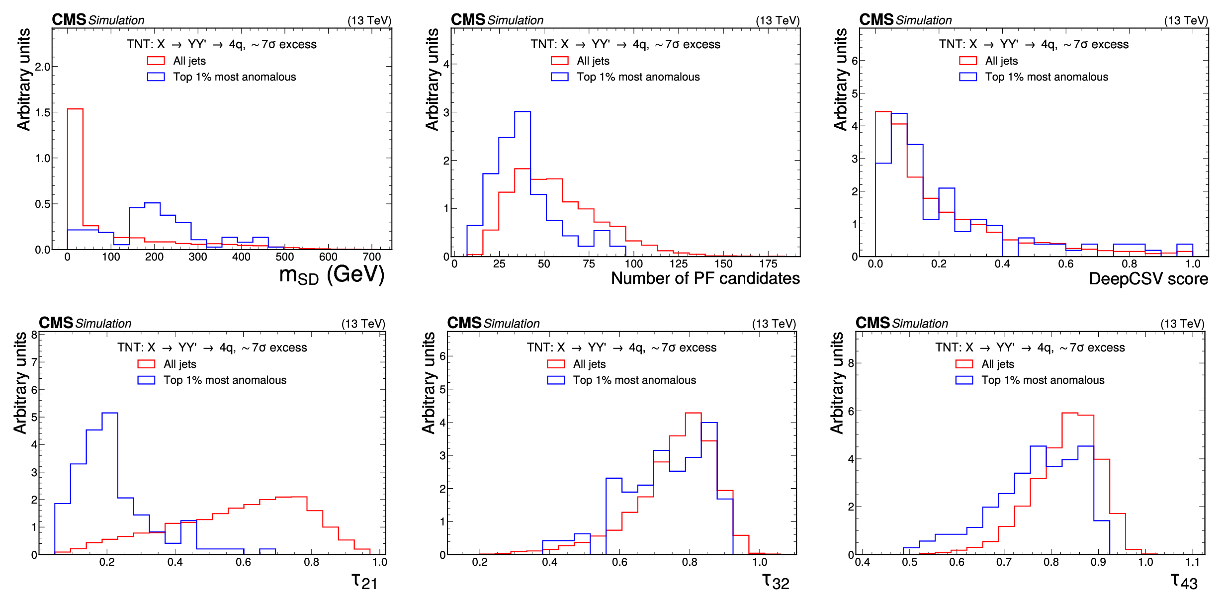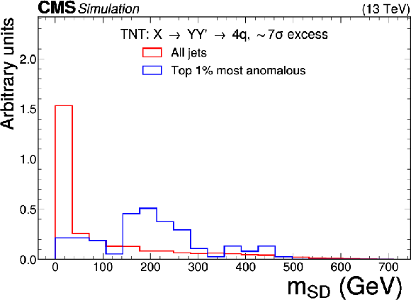 Excess interpretation example for the TNT method trained on a simulated sample, with an injection an $ \mathrm{X}\to \mathrm{Y}\mathrm{Y'} \to 4 \mathrm{q} $ signal with a cross section of 24 fb, $ M_\mathrm{X} $ = 3 TeV, and $ M_{\mathrm{Y}/\mathrm{Y'}} = $ 170 GeV. The plots compare the properties of the jets with the highest anomaly score (blue) as compared to those for all jets in the region of the excess (red). The two-pronged nature of the anomaly is evident from the low $ \tau_{21} $ scores, and the approximate mass of the Y and Y' resonance can be seen as a peak in the jet mass ($ m_\mathrm{SD} $) distribution. |