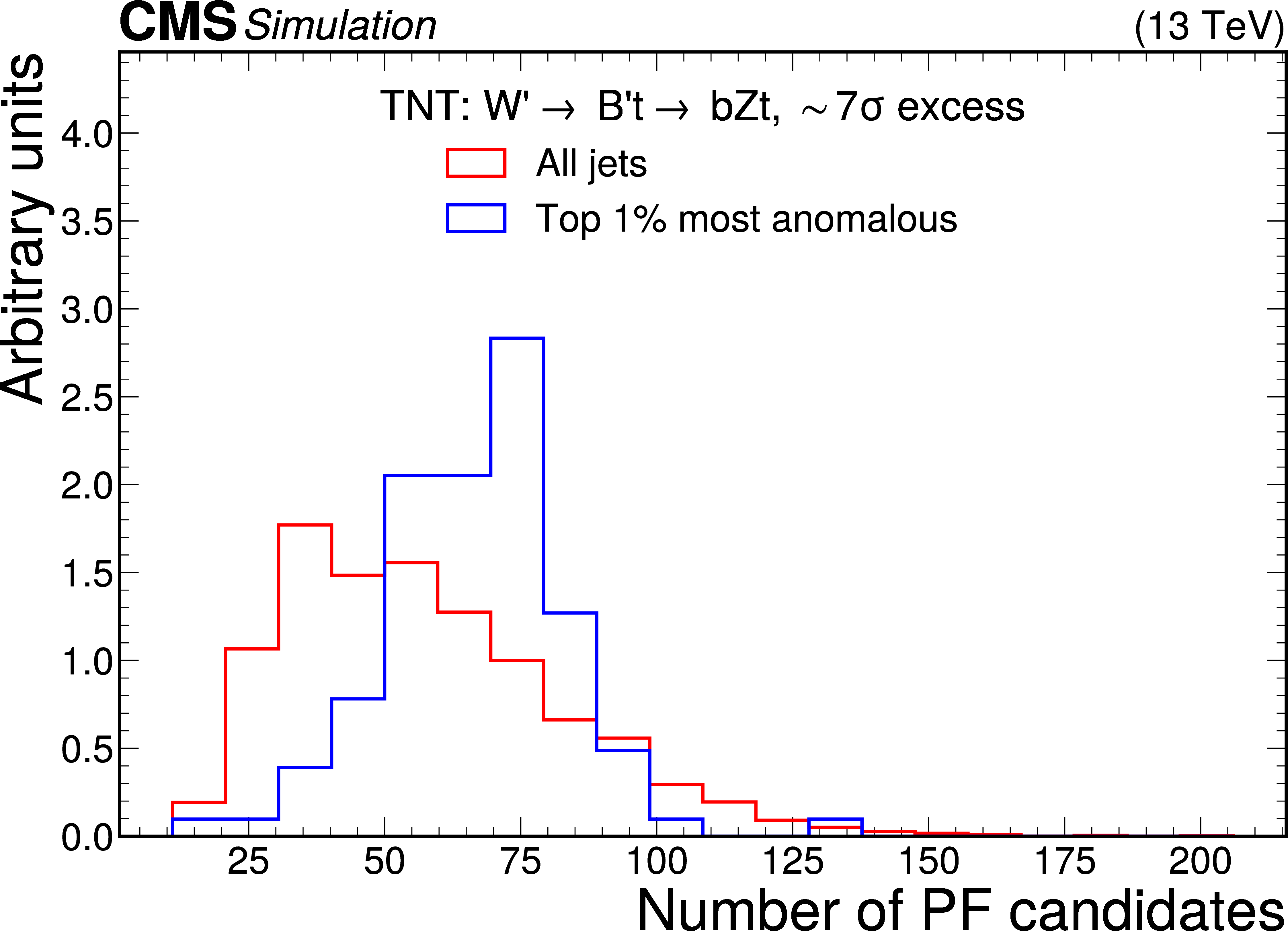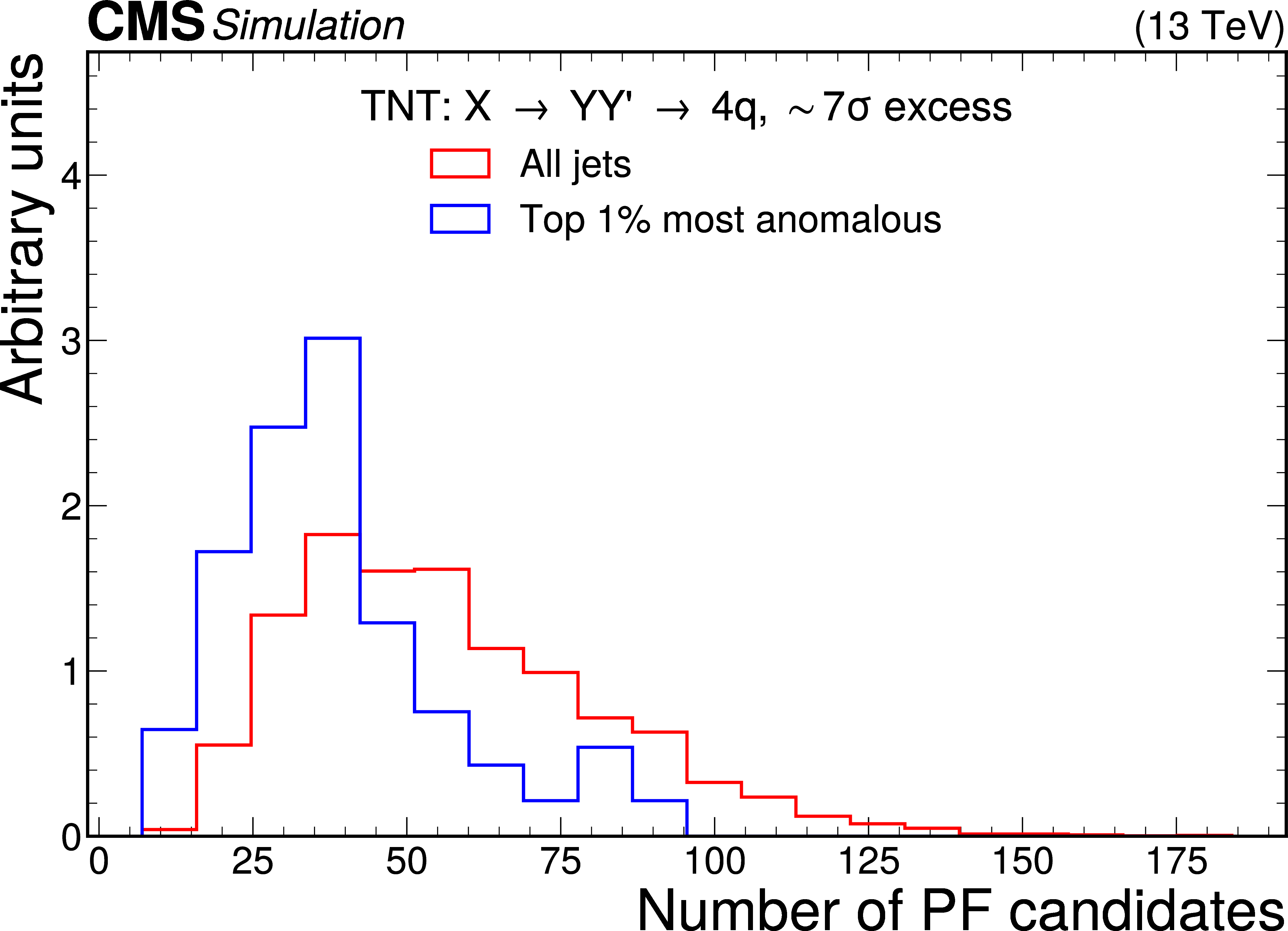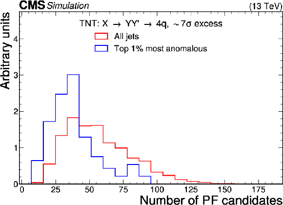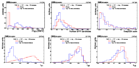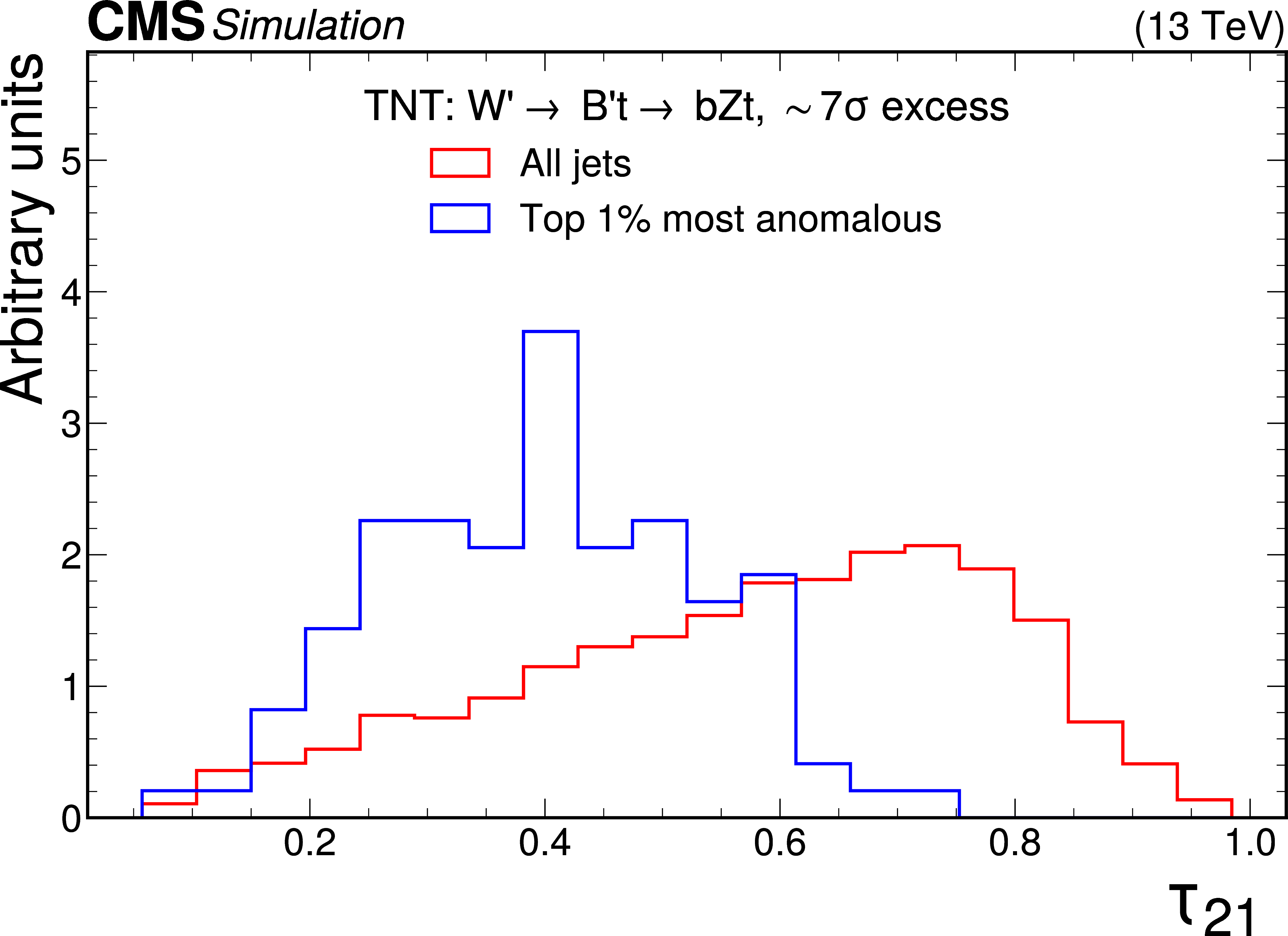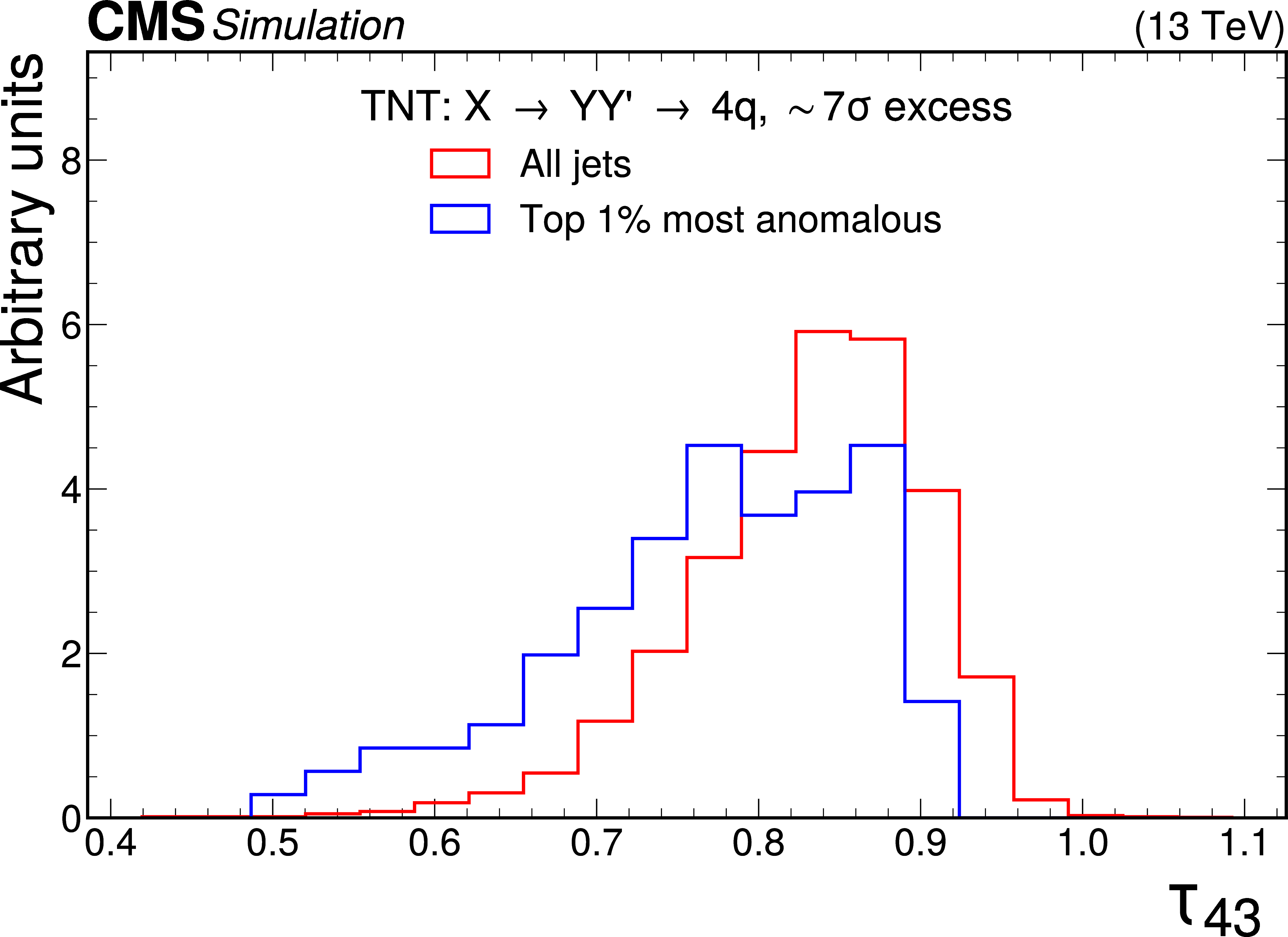 Excess interpretation example for the TNT method trained on a simulated sample, with an injection an $ \mathrm{X}\to \mathrm{Y}\mathrm{Y'} \to 4 \mathrm{q} $ signal with a cross section of 24 fb, $ M_\mathrm{X} $ = 3 TeV, and $ M_{\mathrm{Y}/\mathrm{Y'}} = $ 170 GeV. The plots compare the properties of the jets with the highest anomaly score (blue) as compared to those for all jets in the region of the excess (red). The two-pronged nature of the anomaly is evident from the low $ \tau_{21} $ scores, and the approximate mass of the Y and Y' resonance can be seen as a peak in the jet mass ($ m_\mathrm{SD} $) distribution. |