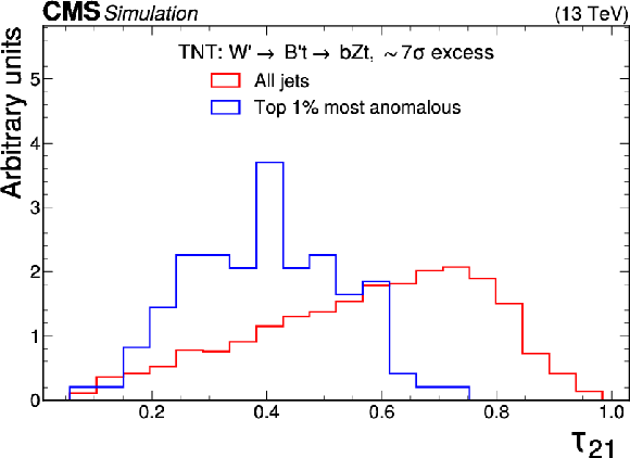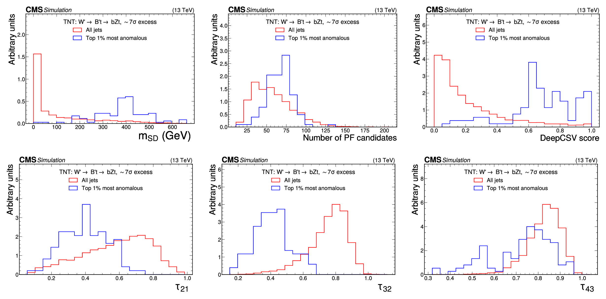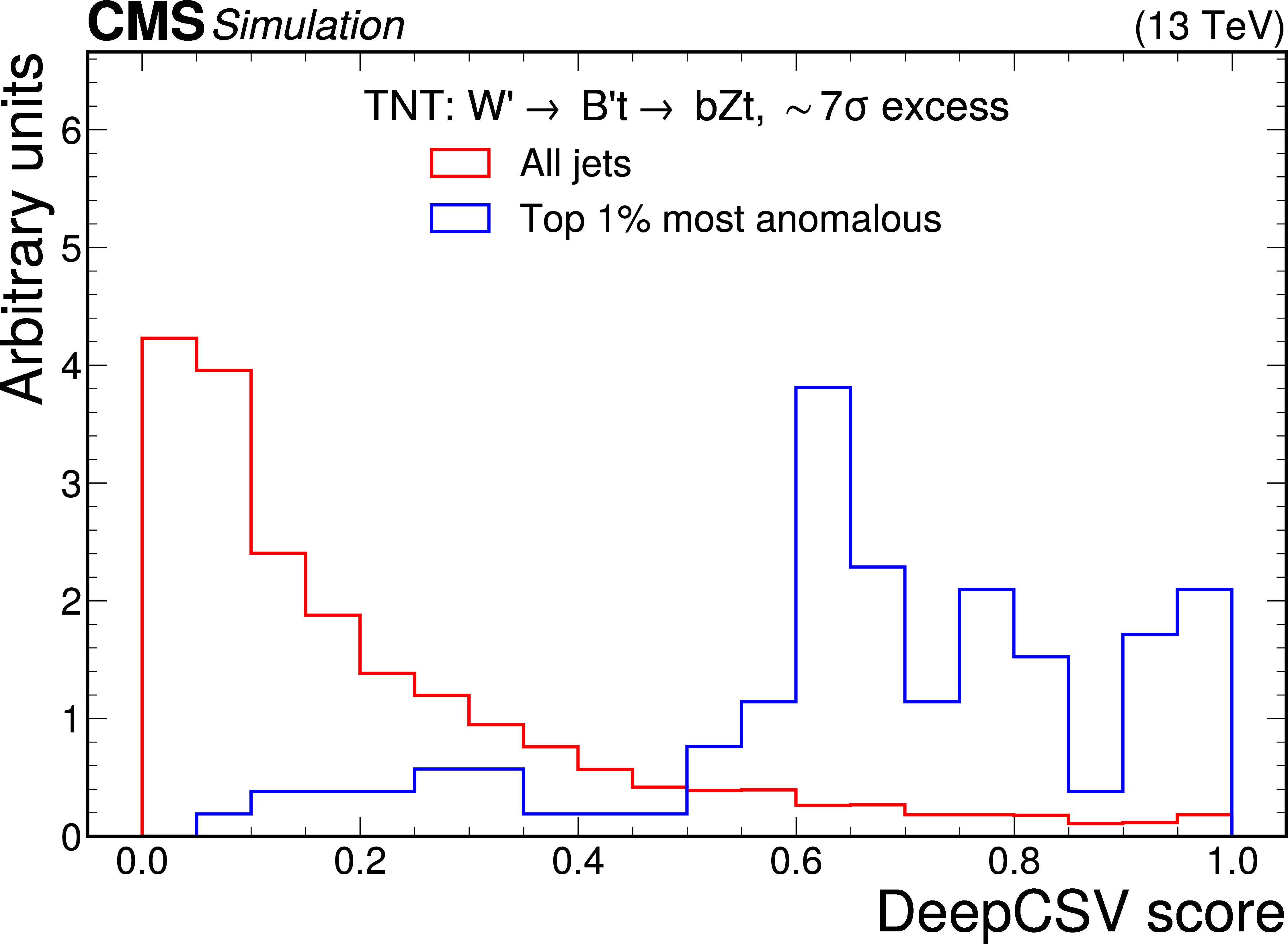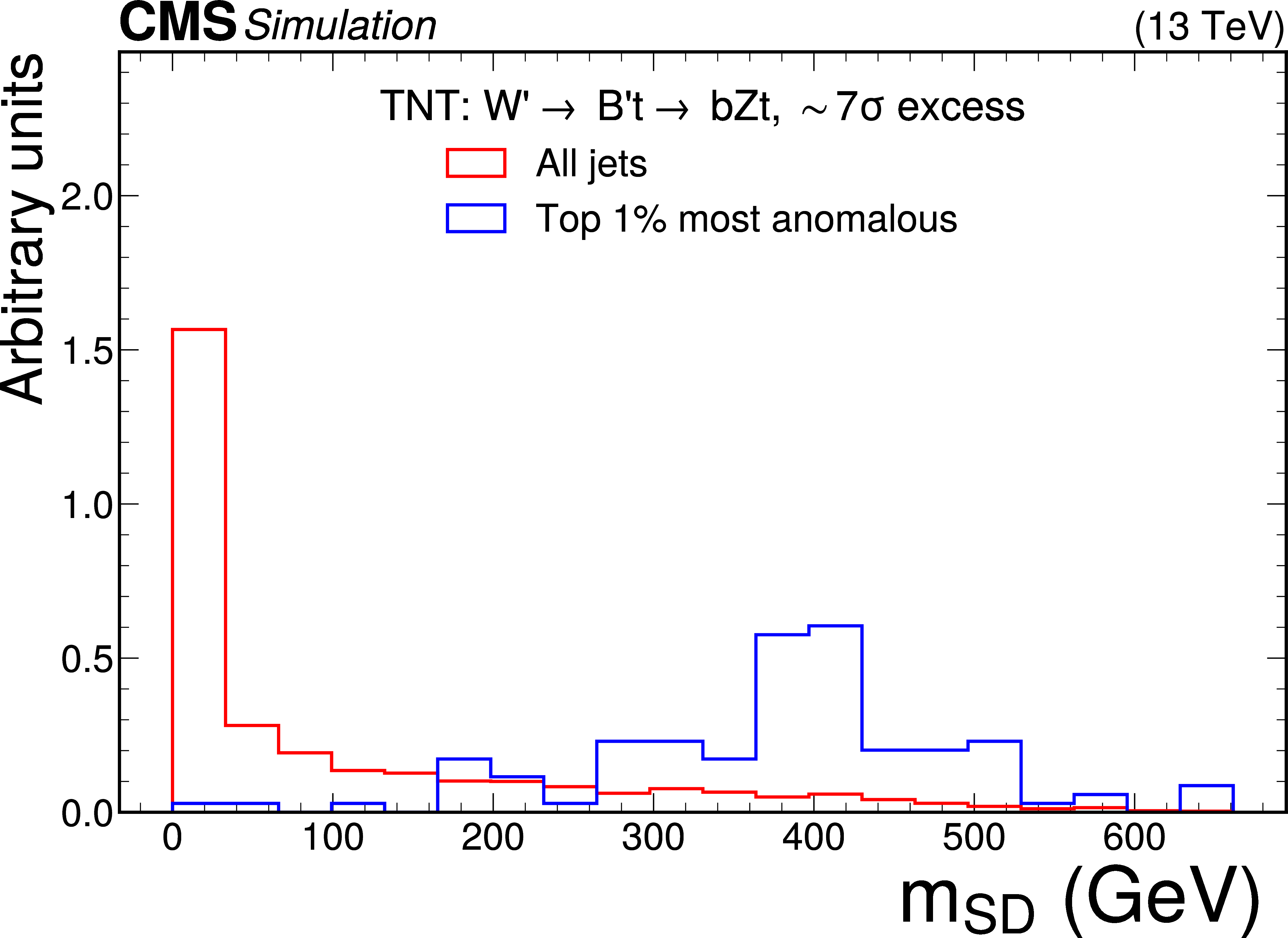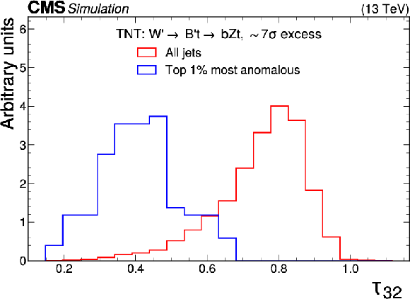 Excess interpretation example for the TNT method trained on a simulated sample, with an injection of a $ \mathrm{W^{'}} \to \mathrm{B'}\mathrm{t} \to \mathrm{b} \mathrm{Z} \mathrm{t} $ signal with a cross section of 97 fb, $ M_{\mathrm{W^{'}}} = $ 3 TeV, and $ M_{\mathrm{B'}} = $ 400 GeV. The plots compare the properties of the jets with the highest anomaly score (blue) as compared to those for all jets in the region of the excess (red). The three-pronged nature of the signal is clear from the low $ \tau_{32} $ scores, the presence of b tags from the high DEEPCSV score, and peaks in the jet mass ($ m_\mathrm{SD} $) at 170 GeV and 400 GeV indicate the top quark and $ B' $ resonances. |