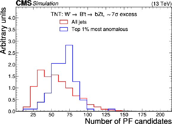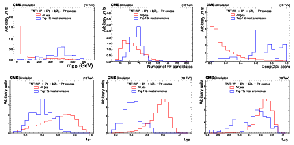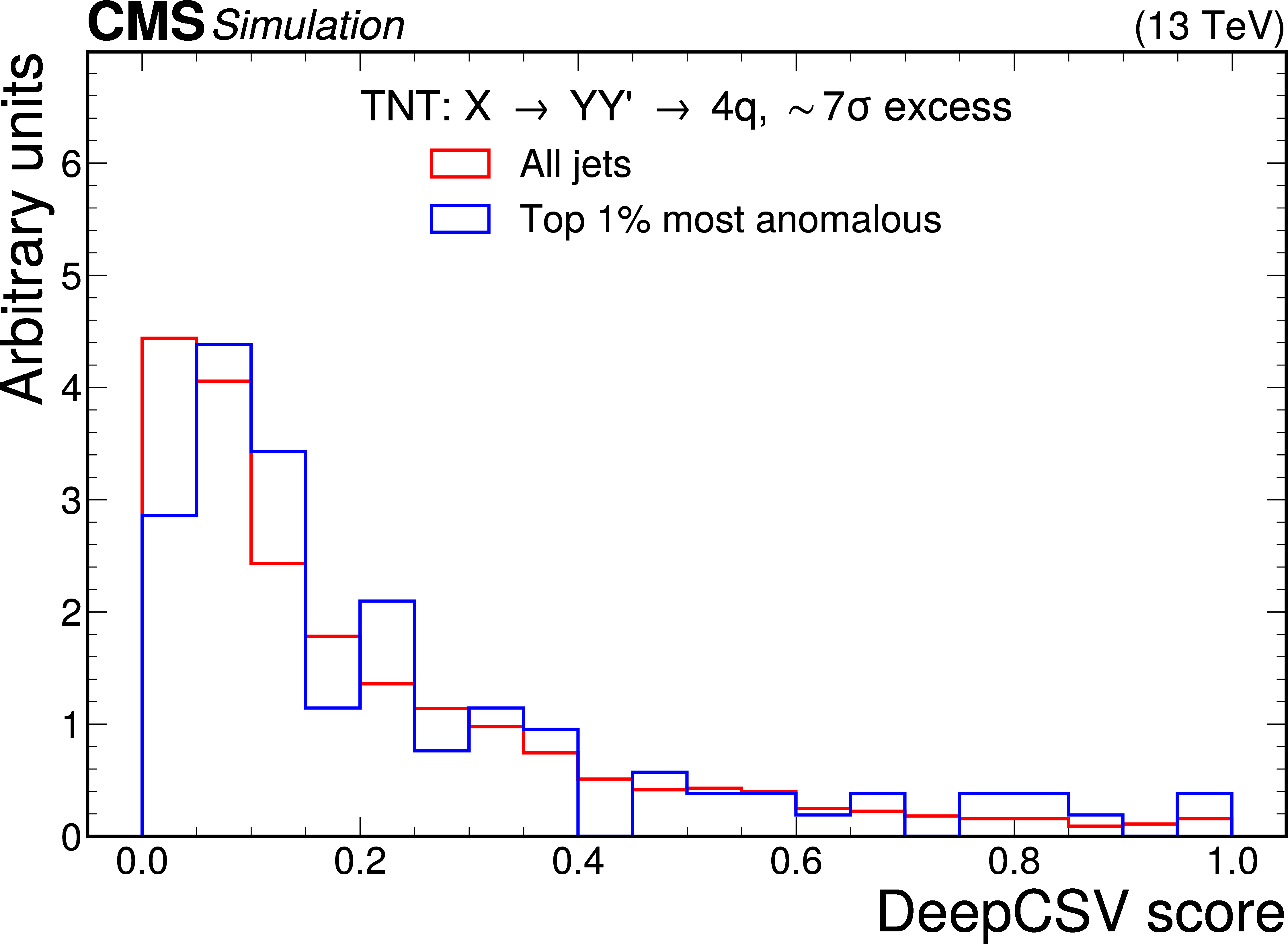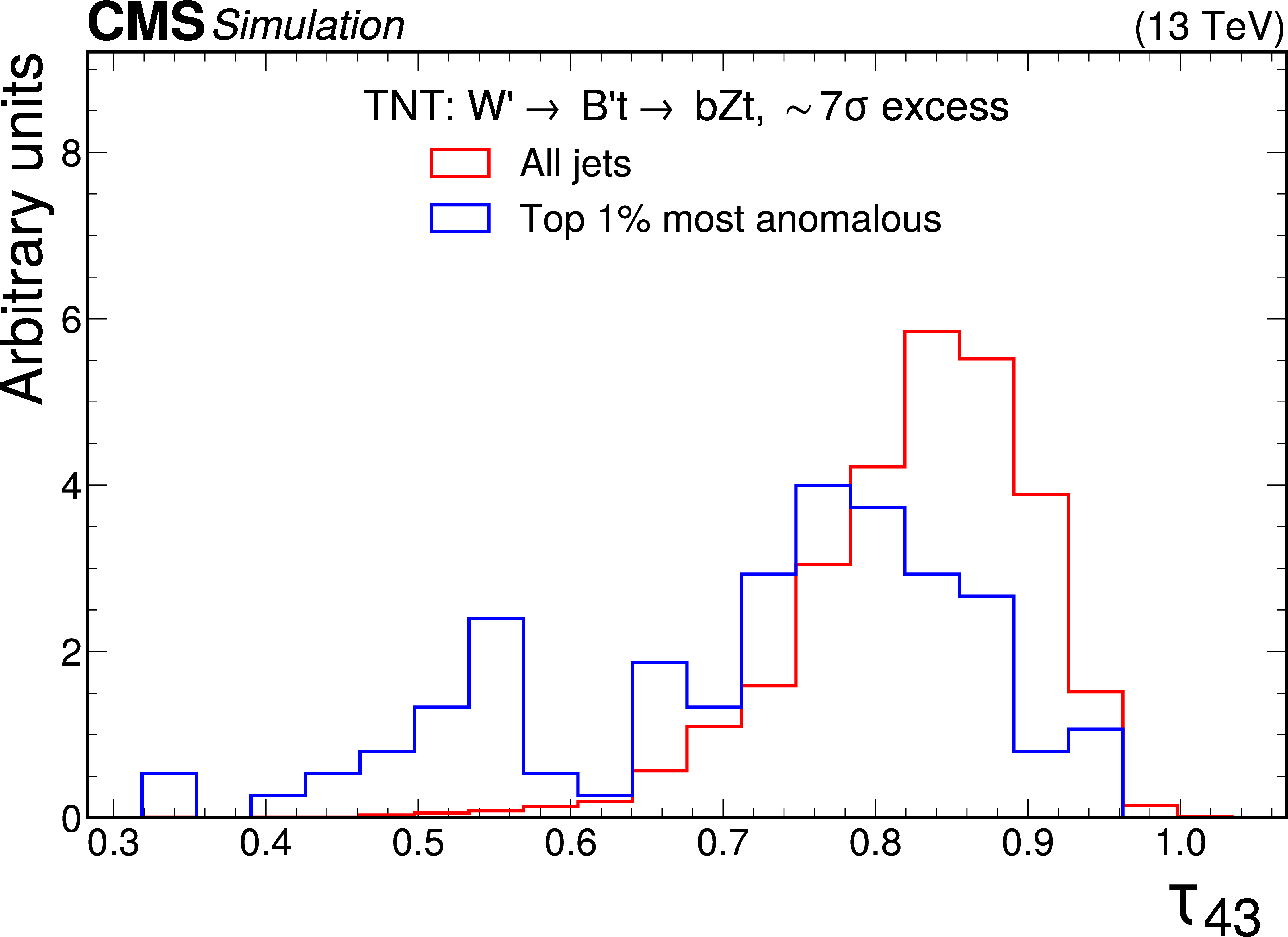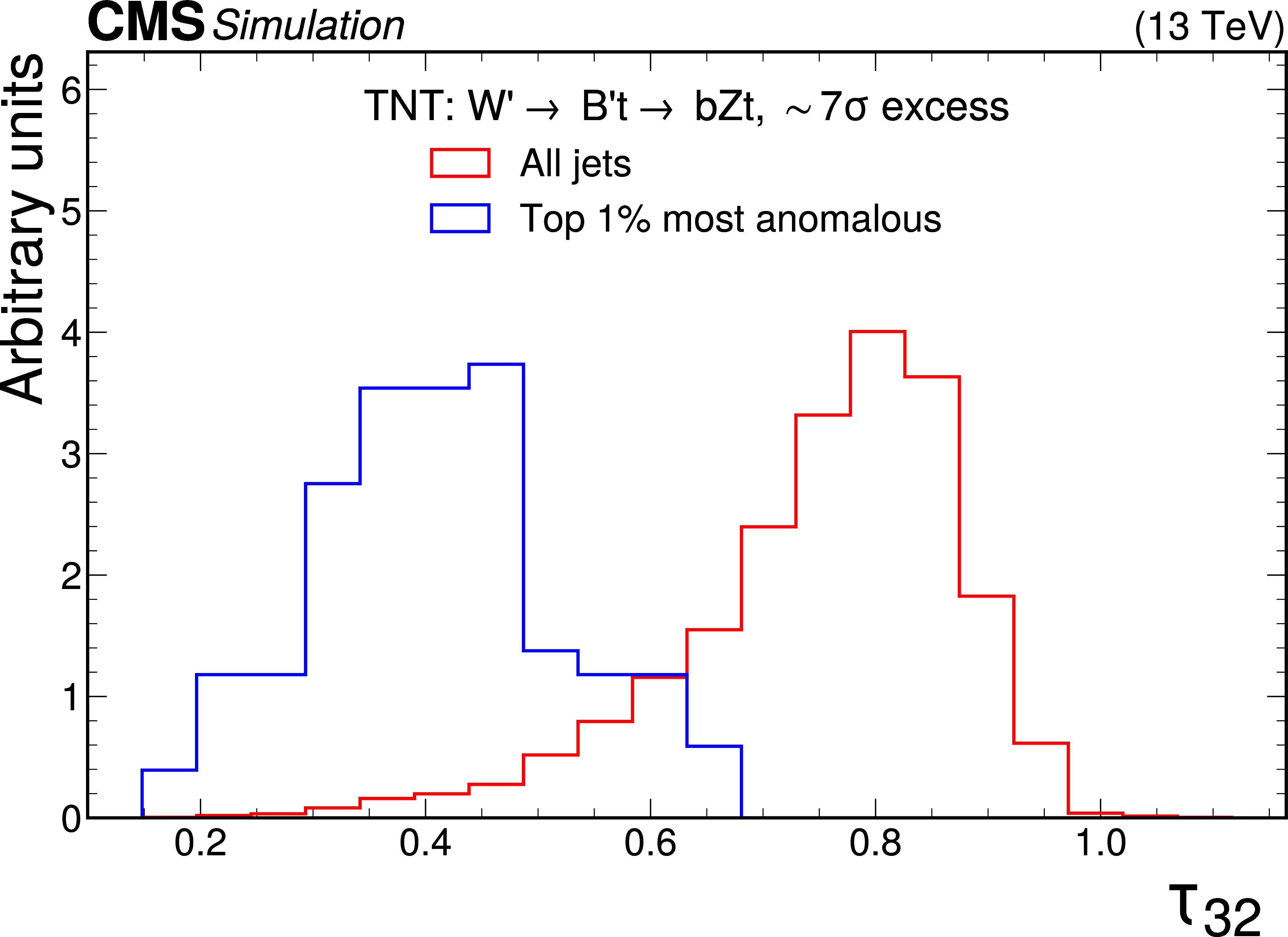 Excess interpretation example for the TNT method trained on a simulated sample, with an injection of a $ \mathrm{W^{'}} \to \mathrm{B'}\mathrm{t} \to \mathrm{b} \mathrm{Z} \mathrm{t} $ signal with a cross section of 97 fb, $ M_{\mathrm{W^{'}}} = $ 3 TeV, and $ M_{\mathrm{B'}} = $ 400 GeV. The plots compare the properties of the jets with the highest anomaly score (blue) as compared to those for all jets in the region of the excess (red). The three-pronged nature of the signal is clear from the low $ \tau_{32} $ scores, the presence of b tags from the high DEEPCSV score, and peaks in the jet mass ($ m_\mathrm{SD} $) at 170 GeV and 400 GeV indicate the top quark and $ B' $ resonances. |
