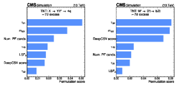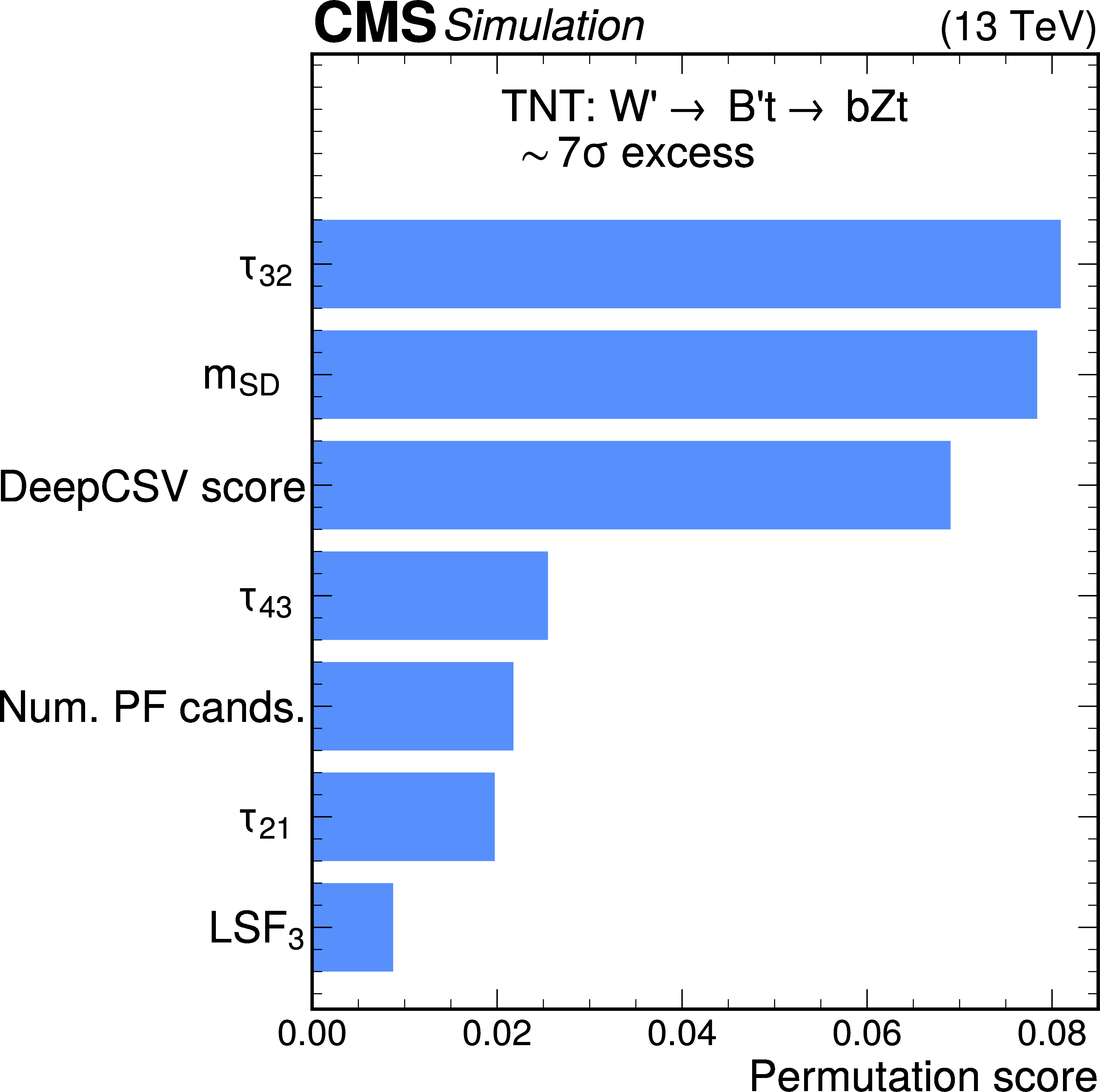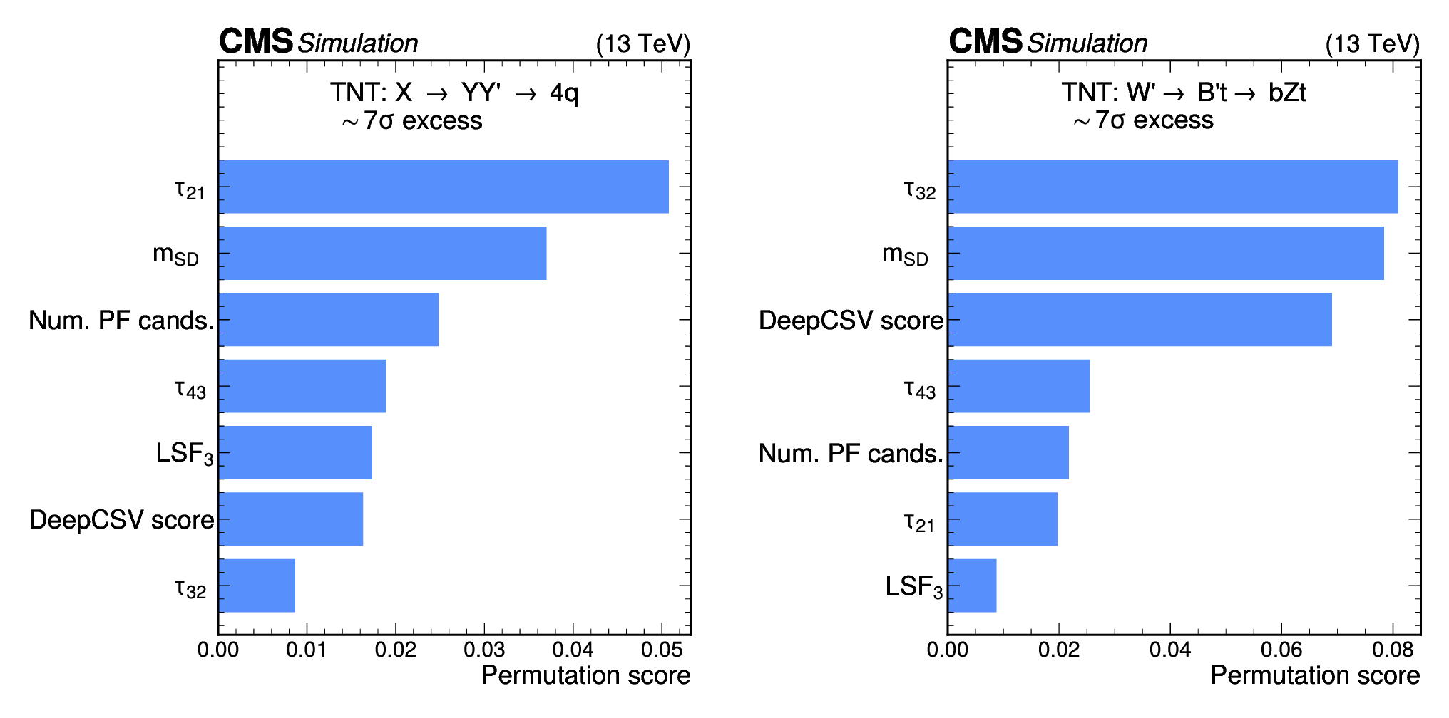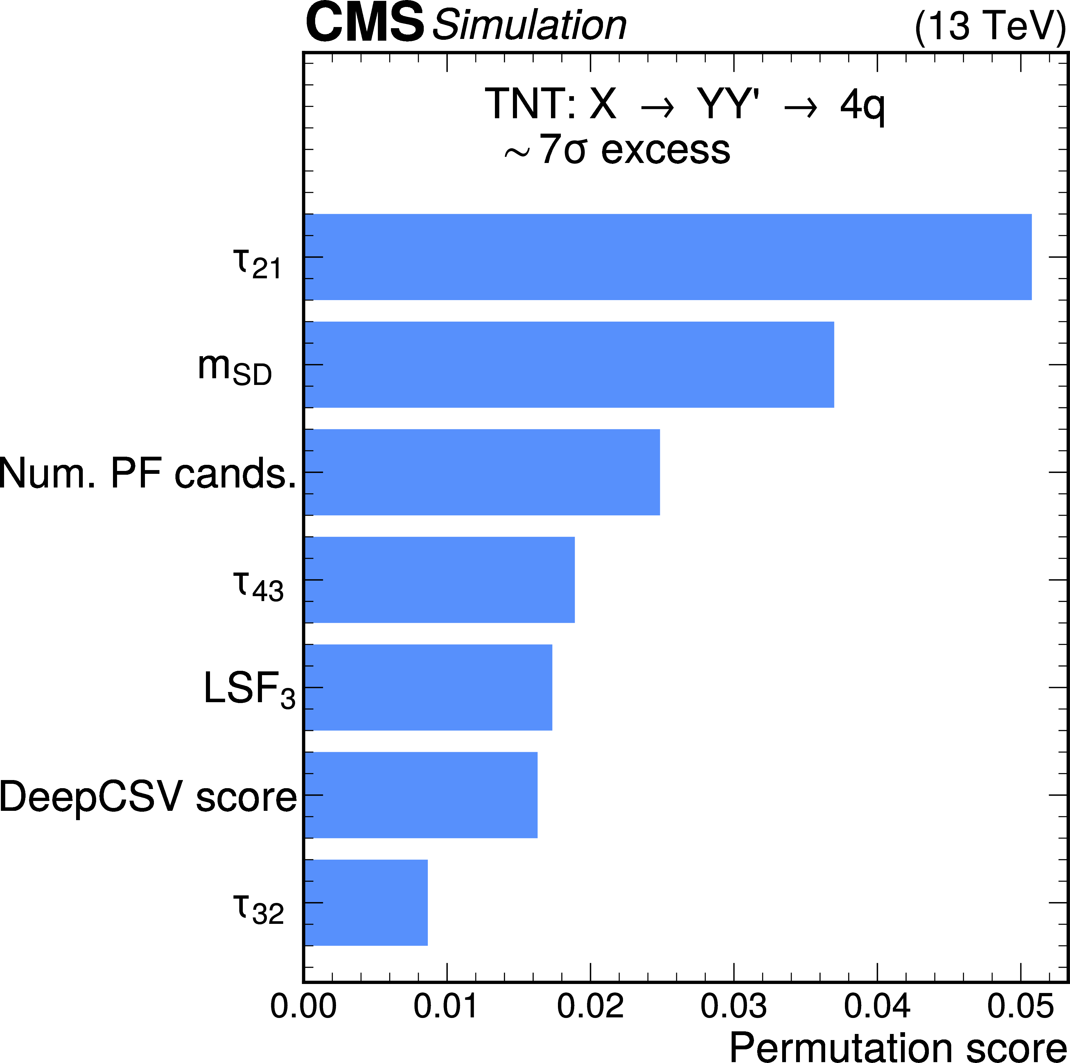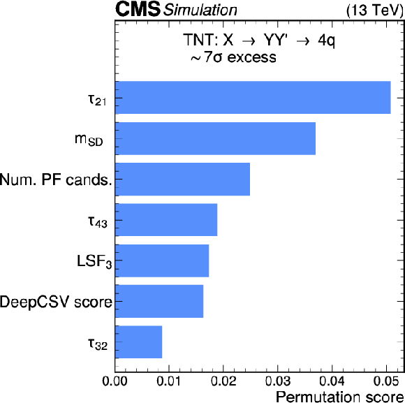 Excess interpretation examples for the TNT method trained on a simulated sample, with an injection of an $ \mathrm{X}\to \mathrm{Y}\mathrm{Y'} \to 4 \mathrm{q} $ signal with a cross section of 24 fb (left) and a $ \mathrm{W^{'}} \to \mathrm{B'}\mathrm{t} \to \mathrm{b} \mathrm{Z} \mathrm{t} $ signal with a cross section of 97 fb (right). The sensitivity of the anomaly score to the different input observables is assessed to aid in the determination of the properties of the excess. For the $ \mathrm{X}\to \mathrm{Y}\mathrm{Y'} \to 4 \mathrm{q} $ injection, the $ \tau_{21} $ and jet masses are seen to be the most important observables. For the $ \mathrm{W^{'}} \to \mathrm{B'}\mathrm{t} \to \mathrm{b} \mathrm{Z} \mathrm{t} $ injection, the $ \tau_{32} $, jet masses, and b tagging score are seen to be the most important observables. |