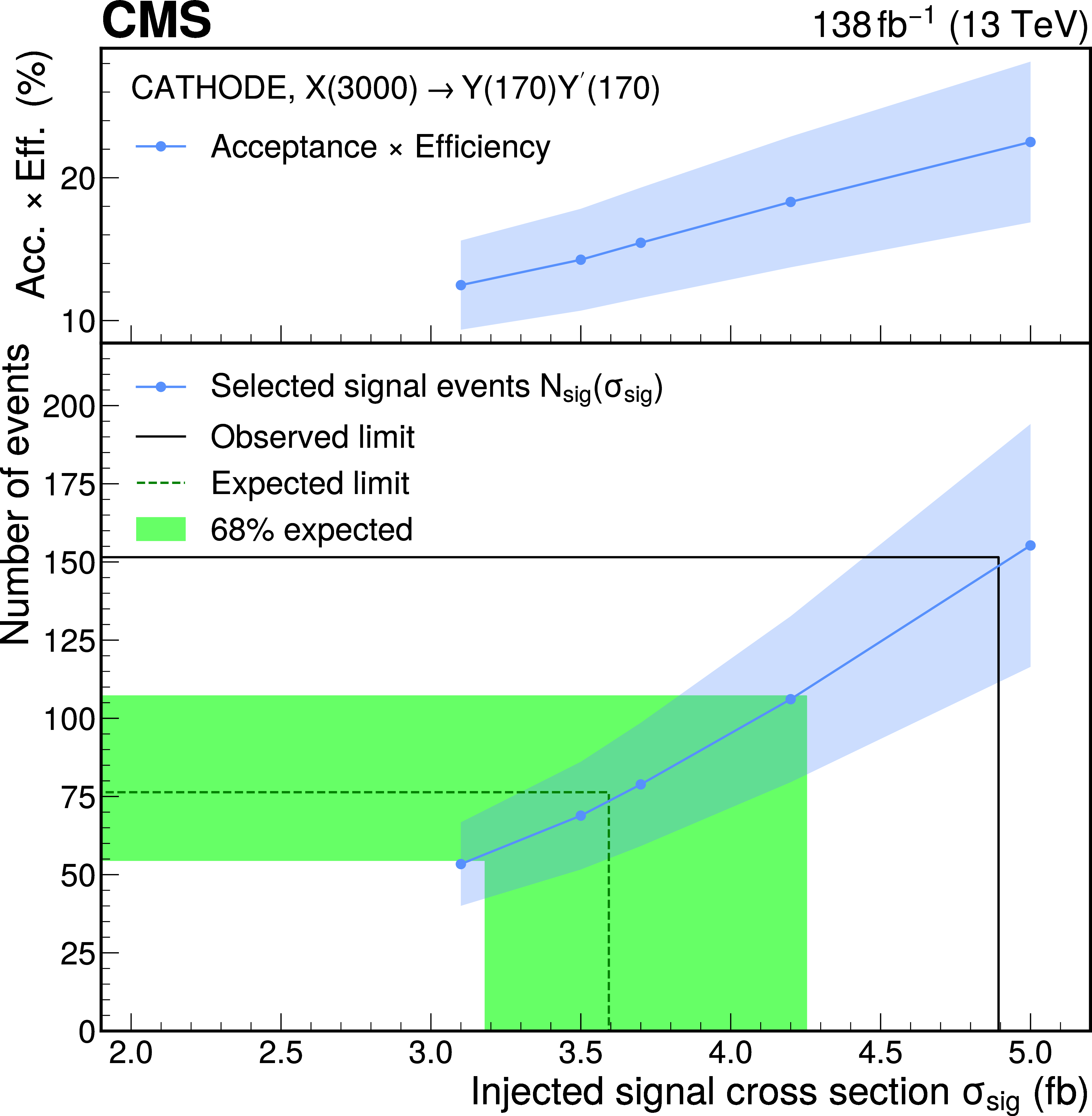 Diagram of the limit-setting procedure for the $ \mathrm{X}\to \mathrm{Y}\mathrm{Y'} \to 4 \mathrm{q} $ signal at 3 TeV with the CATHODE method. The upper panel shows the estimated signal acceptance times efficiency as a function of the cross section injected in data. The shaded region in the upper panel shows the total statistical and systematic uncertainty in the efficiency. The resulting $ N_\text{sig}(\sigma_\text{sig}) $ curve and its corresponding uncertainty band from the efficiency are shown in blue in the lower panel. The expected and observed limits on the number of signal events are shown as a horizontal solid black line and green dashed lines, respectively, and connected to the corresponding limits on the cross section (vertical lines). The 68% confidence level band around the expected limit is displayed similarly. |
