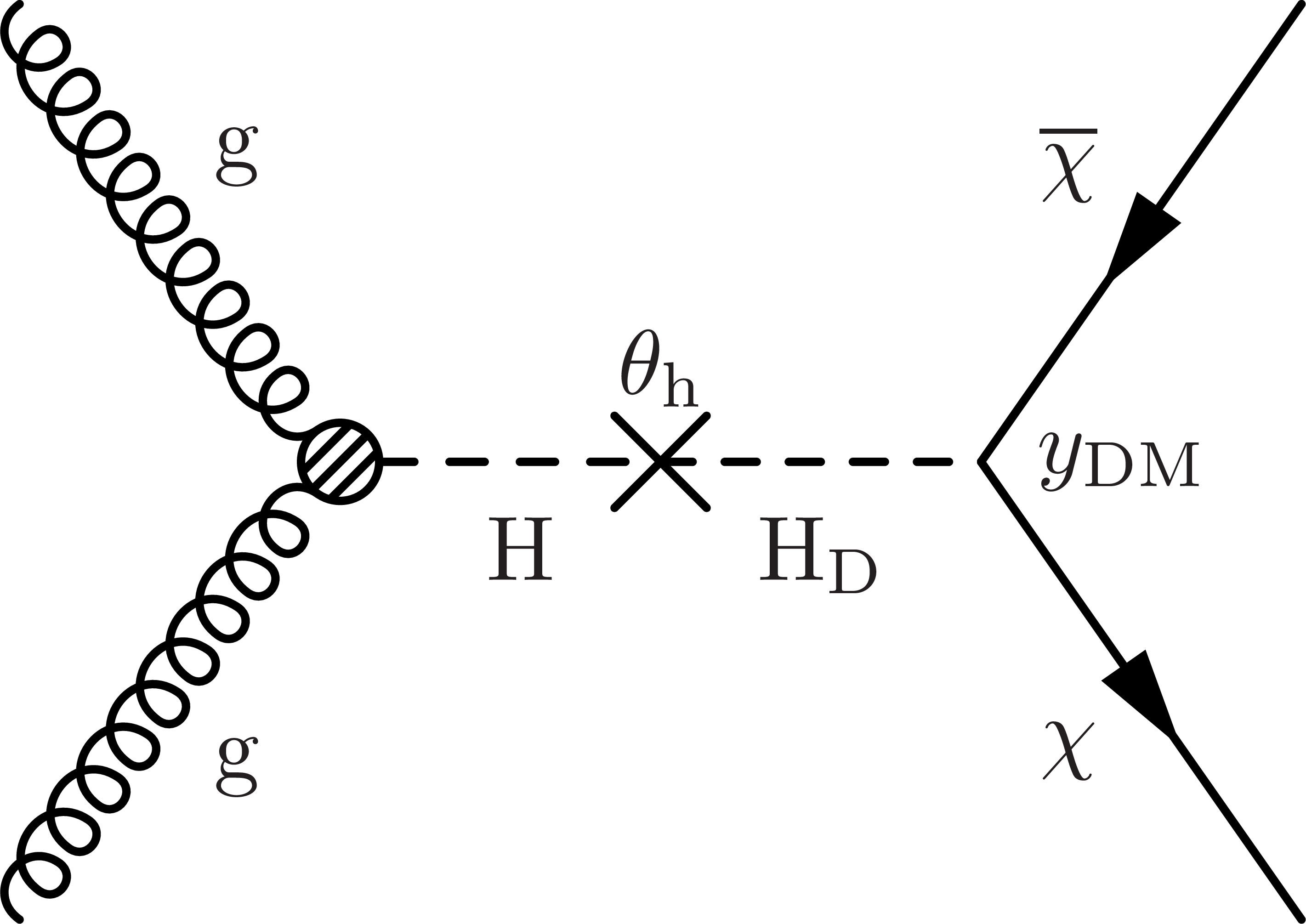 Representative Feynman diagrams for simplified model processes of DM pair production via different mediators. First row left: $ \mathrm{Z}^{'} $ mediator, with $ g_{\mathrm{q}} $ and $ g_{\text{DM}} $ couplings to the quarks and the DM candidate $ \chi $, respectively, discussed in Section 2.1.1.1. In this diagram, we also show the initial-state radiation that is regularly used as an additional component in the searches. First row right: $ \mathrm{Z}^{'} $ mediator, with $ g_{\mathrm{q}} $ couplings to the quarks, also discussed in Section 2.1.1.1. Second row: dark-photon mediator $ \text{A}^{\prime} $, via mixing with the SM photon, discussed in Section 2.1.1.2. Third row left: generic scalar mediator $ \text{S} $, with Yukawa couplings $ y_\mathrm{q} = m_\mathrm{q} g_\mathrm{q}/v $, and $ y_\textrm{DM} $ and gluon coupling induced primarily via the top quark loop, discussed in Section 2.1.2.1. Third row right: dark Higgs mediator $ \mathrm{H}_{\mathrm{D}} $, produced via mixing $ \theta_{\text{h}} $ with the SM Higgs boson, discussed in Section 2.1.2.2. As discussed in Section 2.1.2.3, the Higgs portal scenario can be seen as a subcase of the dark-Higgs portal. Fourth row left: pseudoscalar and ALP ($ \text{P} $/$ \mathrm{a} $) mediators, either with Yukawa-like coupling $ y_\mathrm{t} $ or effective coupling $ \Lambda^{-1} $, as described in Sections 2.1.2.4 and 2.1.2.5, respectively. Fourth row right: the fermion portal via the bifundamental mediator $ \Phi $, discussed in Section 2.1.3. |