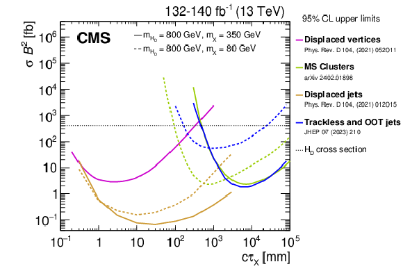 Observed 95% CL exclusions of the product of the top squark pair production cross section and branching fraction as functions of the top squark mass and proper decay length of the singlino for the stealth SY$ \overline{\text{Y}} $ (left) and stealth SHH (right) SUSY model where the mass of the singlino is 100 GeV (upper) and $ m_{\tilde{\mathrm{t}}}- $ 225 GeV (lower). Exclusions are for the stealth SUSY search [258] (dark green), the displaced vertices search [260] (gray), the displaced-jets search [259] (red), the trackless- and OOT jets search [261] (blue), and muon system showers search (MS clusters) [262] (orange). The hatching direction on each contour denotes the region of excluded 2D phase space that is bounded by the respective contour. Note that the displaced-jets search has no sensitivity less than $ c\tau_{\widetilde{\text{S}}}=0.1\,\text{mm} $, the DVs search has no sensitivity less than $ c\tau_{\widetilde{\text{S}}}= $ 0.1 (0.3)$ \,\text{mm} $ for the SY$ \overline{\text{Y}} $ (SHH) model, and the stealth SUSY search has no sensitivity to either stealth SUSY model when $ m_{\tilde{\mathrm{t}}} - m_{\widetilde{\text{S}}} = $ 225 GeV because the jets are likely to be outside of the detector acceptance. Additionally, for the specific result here, the muon system showers search only uses the CSCs component of the muon system. |