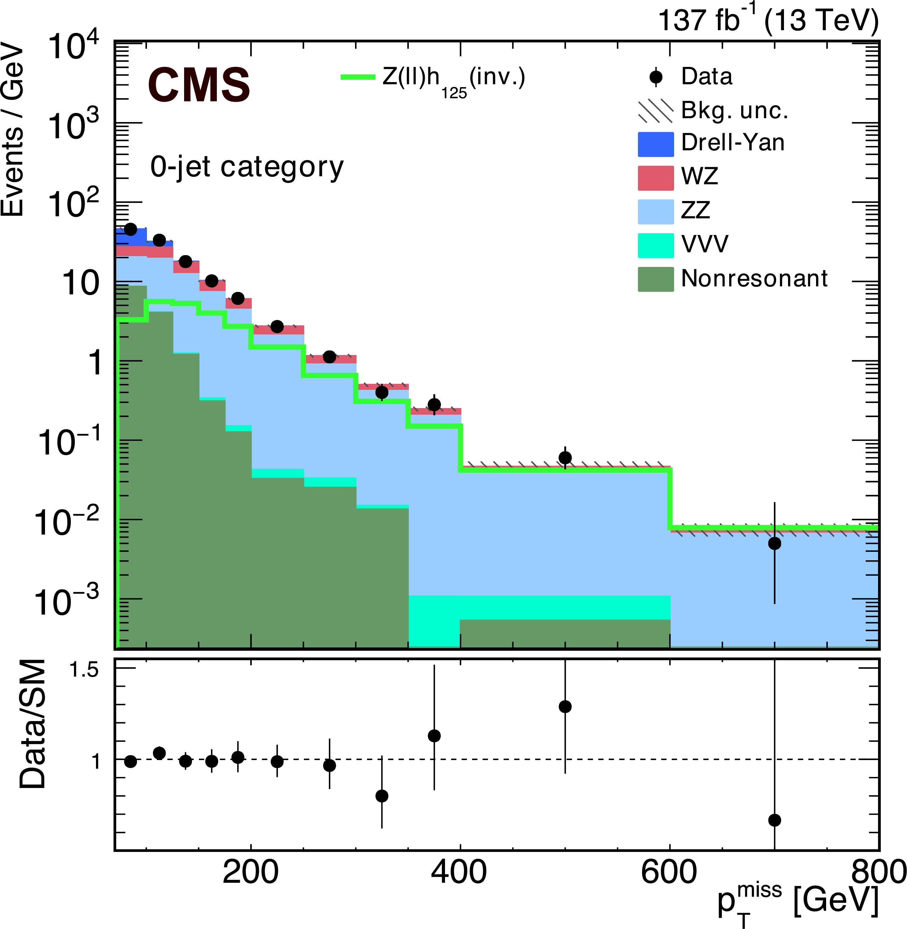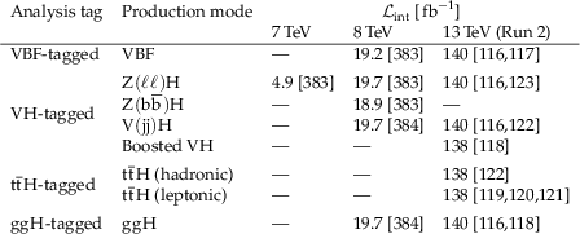 Feynman diagrams of the VBF, $ \mathrm{g}\mathrm{g}\mathrm{H} $, $ \mathrm{t}\overline{\mathrm{t}}\mathrm{H} $, and VH Higgs boson production modes analyzed in the $ \mathrm{H} \to \text{inv} $ searches. |