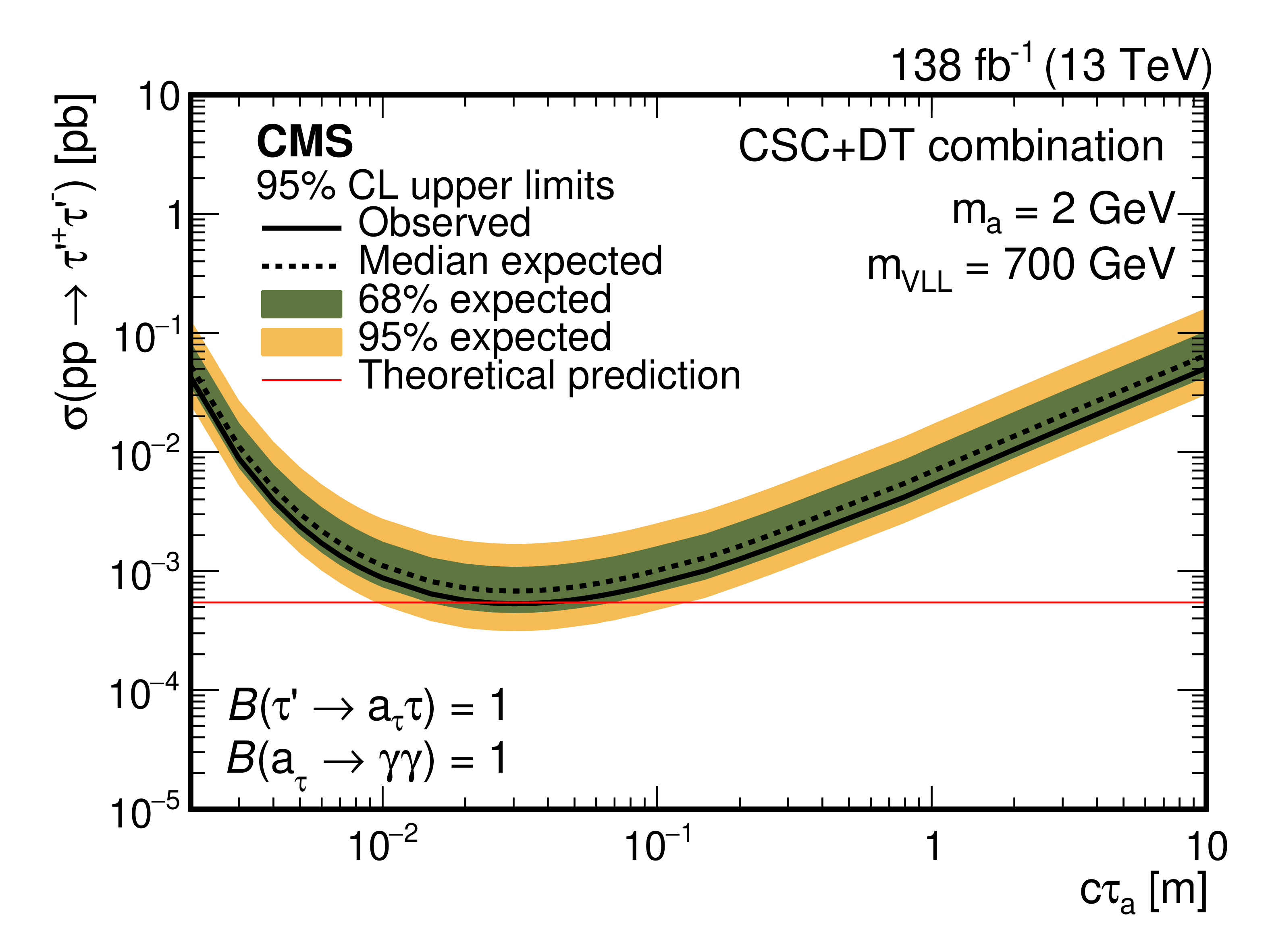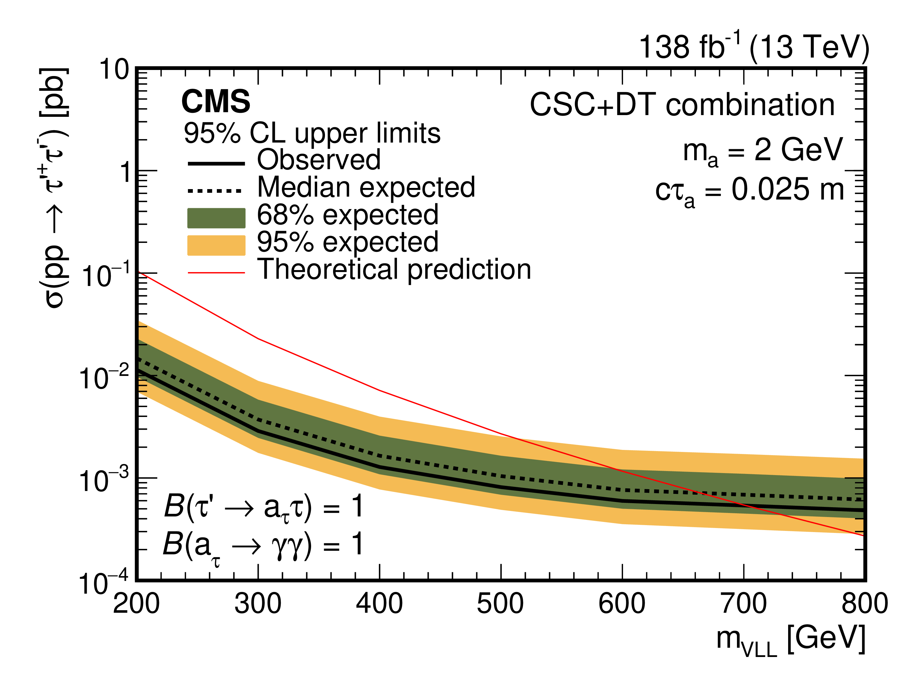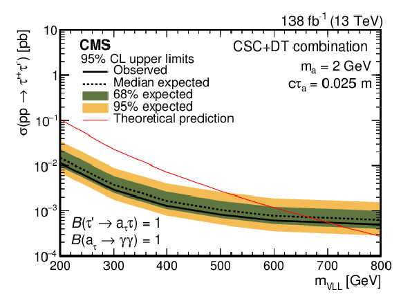 The 95% CL observed and expected upper limits on the VLL production cross section as a function of the VLL mass for the pseudoscalar boson mean proper decay length $ c\tau_\mathrm{a}= $ 0.025m (left), and as a function of $ c\tau_\mathrm{a} $ for VLL mass of 700 GeV (right). The pseudoscalar boson mass is 2 GeV. The NLO theoretical prediction [36] is shown as a red line. |