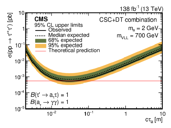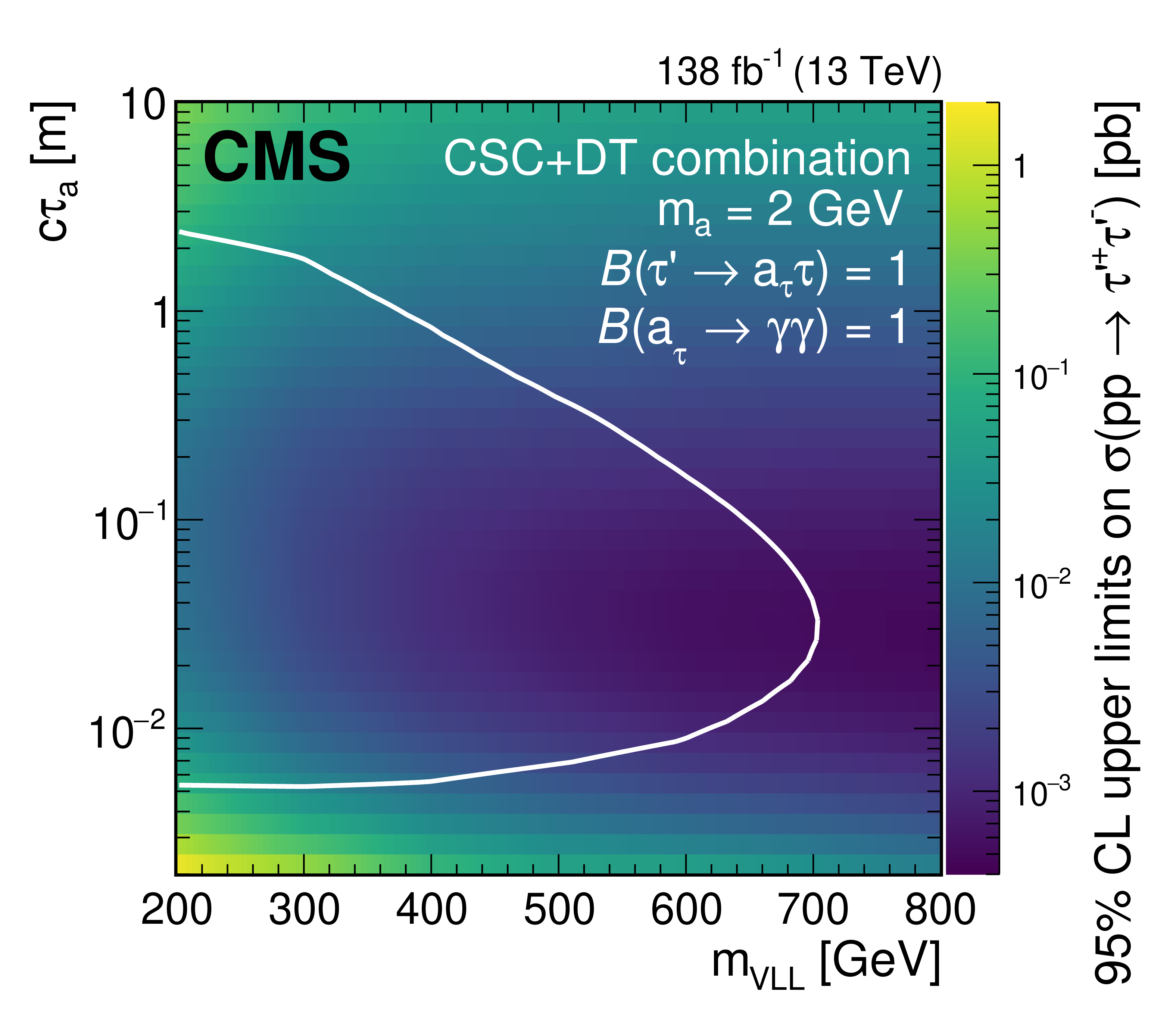 The 95% CL observed upper limits on the VLL production cross section as a function of the VLL mass and the pseudoscalar boson mean proper decay length $ c\tau_\mathrm{a} $. The pseudoscalar boson mass is 2 GeV. The area enclosed by the white line corresponds to the excluded region. |