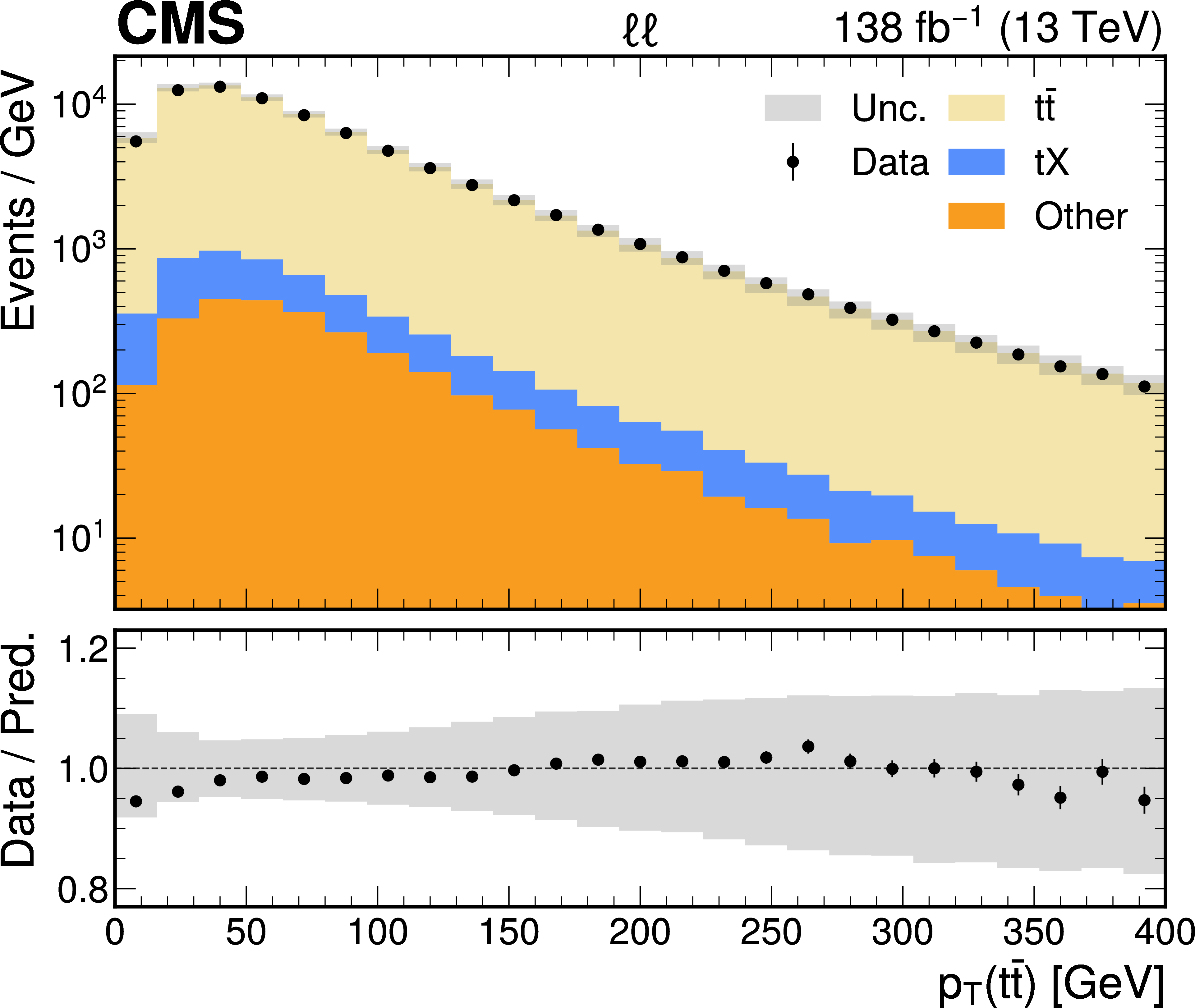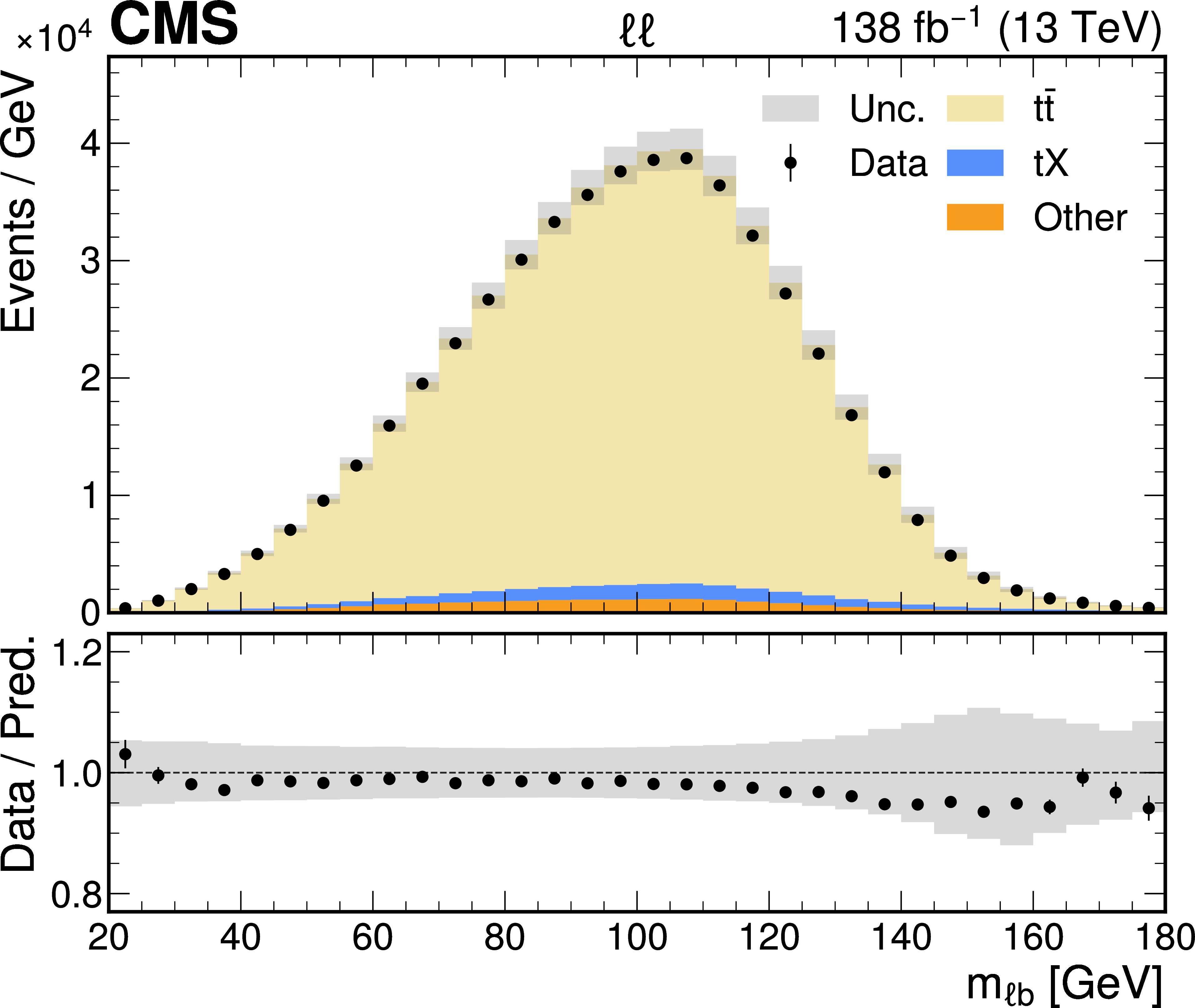 Comparison of the number of observed (points) and expected (colored histograms) events in the $ \ell\ell $ channel after the kinematic reconstruction and background estimation for the distributions of the invariant lepton-b jet mass $ m_{\ell\mathrm{b}} $ (left) and the $ p_{\mathrm{T}} $ of the $ \mathrm{t} \overline{\mathrm{t}} $ system (right). The ratio to the total prediction is shown in the lower panel, and the total systematic uncertainty is shown as the gray band. |
