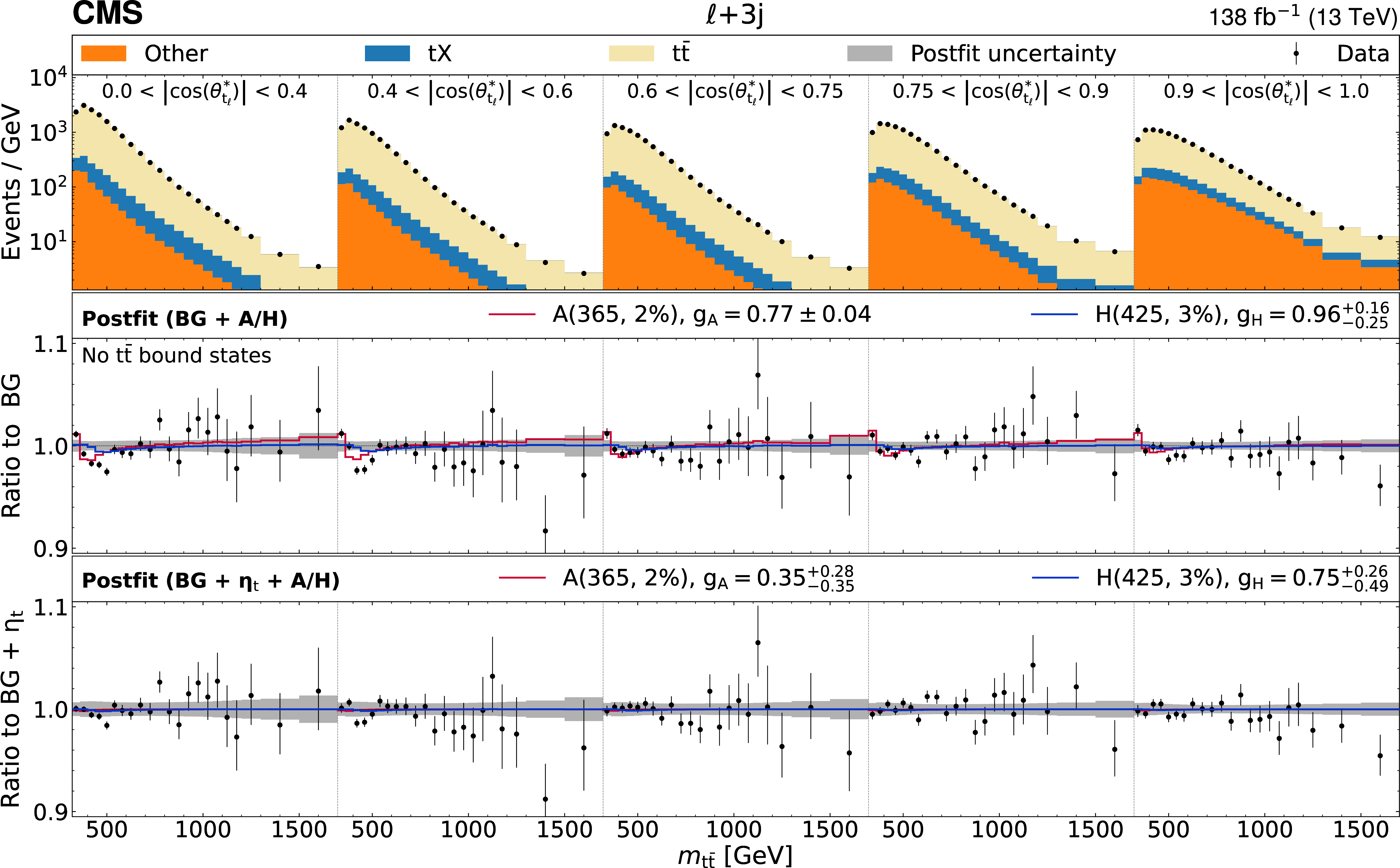 Observed and expected $ m_{{\mathrm{t}\overline{\mathrm{t}}} } $ distribution in bins of $ \lvert\cos\theta^\ast_{\mathrm{t}_{\ell}}\rvert $, shown for the $ \ell+3{\mathrm{j}} $ channel summed over lepton flavors and eras. In the upper panel, the data (points with statistical error bars) are compared to $ \mathrm{t} \overline{\mathrm{t}} $ production in FO pQCD and other sources of background (colored histograms) after the fit to the data in the A$+$H interpretation. The ratio of data to the prediction is shown in the middle panel, where the two signals A$(365,\,2\%)$ and H$(425,\,3\%)$, corresponding to the best fit point, are overlaid. The lower panel shows the equivalent ratio for the fit where $ \eta_{\mathrm{t}} $ is considered as an additional background, for the same signal points. In both cases, the gray band shows the postfit uncertainty, and the respective signals are overlaid with their best fit model parameters. |