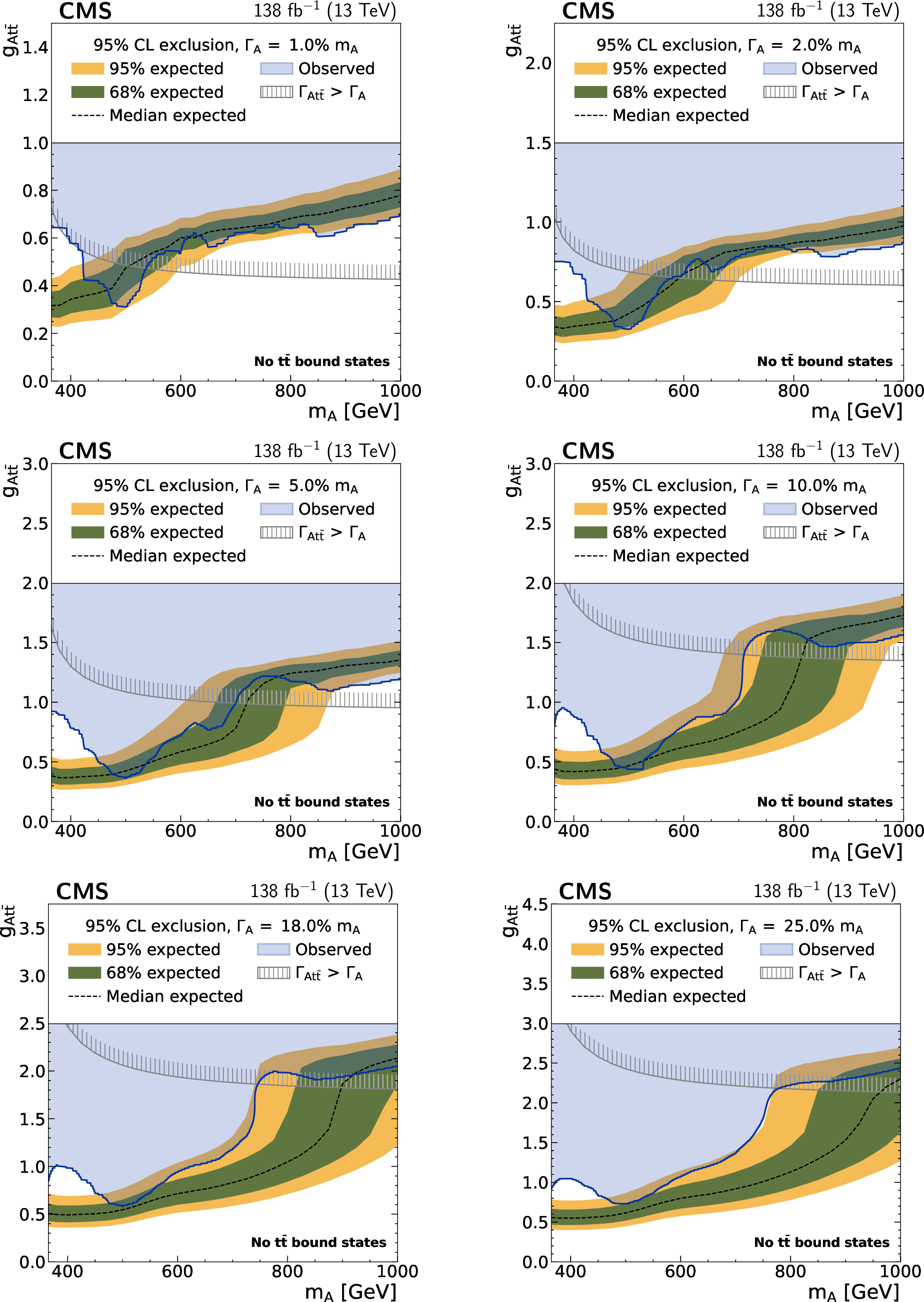 Model-independent constraints on $g_{\mathrm{At\bar{t}}}$ as functions of the A boson mass in the background scenario without $ \eta_{\mathrm{t}} $ contribution, for $ \Gamma_{\Phi}/m_{\Phi} $ of 1, 2, 5, 10, 18, and 25% (from upper left to lower right). The observed constraints are indicated by the shaded blue area, bounded by the solid blue curve. The inner green and outer yellow bands indicate the regions containing 68 and 95%, respectively, of the distribution of constraints expected under the background-only hypothesis. The unphysical region of phase space in which the partial width $ \Gamma_{\mathrm{A}\to{\mathrm{t}\overline{\mathrm{t}}} } $ becomes larger than the total width of the A boson is indicated by the hatched line. |