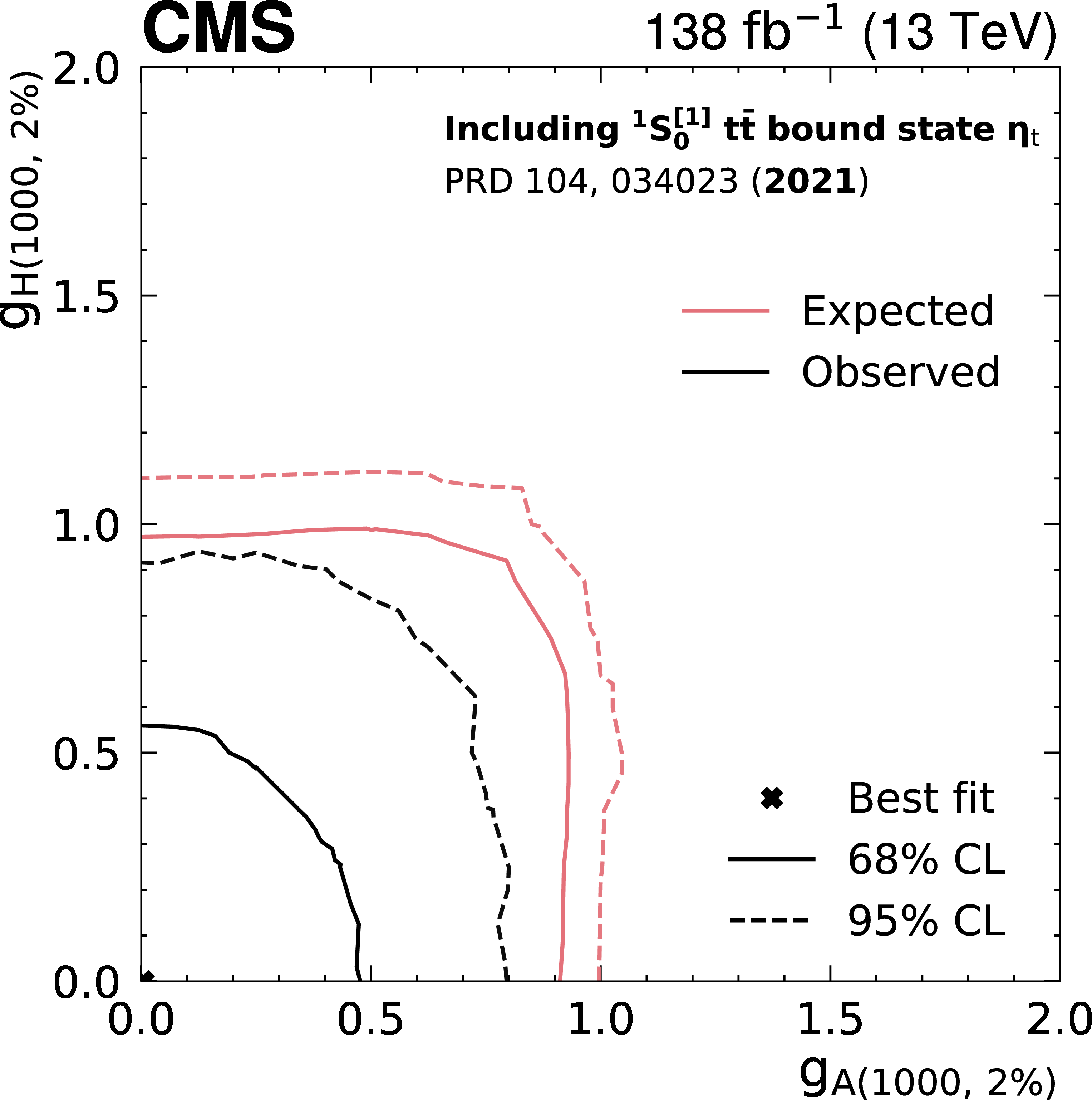 Frequentist 2D exclusion contours for $g_{\mathrm{At\bar{t}}}$ and $g_{\mathrm{Ht\bar{t}}}$ in the A$+$H boson interpretation for six different signal hypotheses with unequal A and H boson masses, corresponding to combinations of 365, 500, and 1000 GeV, all assuming a relative width of 2%. The expected and observed contours, evaluated with the Feldman-Cousins prescription [128,129], are shown in pink and black, respectively, with the solid and dashed lines corresponding to exclusions at 68 and 95% CL. The regions outside of the contours are considered excluded. In all cases, $ \eta_{\mathrm{t}} $ production is included in the background model. |