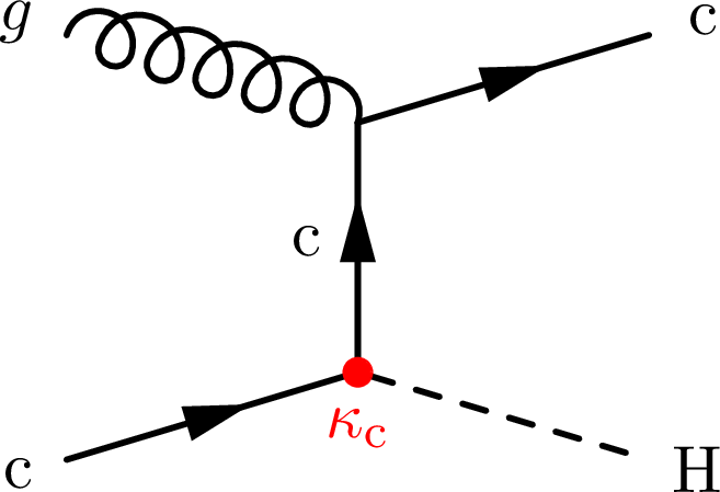 Leading order Feynman diagrams that contribute to the $ \mathrm{p}\mathrm{p} \to \mathrm{c}\mathrm{H} $ process. Red dots correspond to vertices where the charm Yukawa coupling modifier $ \kappa_\mathrm{c} $ enters. |